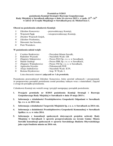 Protokół nr 9/2015 posiedzenia Komisji Strategii i Rozwoju Gospodarczego Rady Miejskiej w Suwałkach odbytego w dniu 16 czerwca 2015 r. w godz. 1530- 1620 w sali nr 26 Urzędu Miejskiego w Suwałkach przy ul. Mickiewicza 1. Obecni na posiedzeniu członkowie Komisji: 1/ 2/ 3/ 4/ 5/ 6/ Zdzisław Koncewicz Wojciech Pająk Zbysław Wojciech Grajek, Zdzisław Przełomiec, Sławomir Jan Szeszko, Piotr Wasiukow. - przewodniczący Komisji, - wiceprzewodniczący Komisji, W posiedzeniu udział wzięli: 1/ 2/ 3/ 4/ 5/ 6/ 7/ 8/ Czesław Renkiewicz Radosław Wysocki Zbigniew Makarewicz Marek Giedrojć Zbigniew Walendzewicz Agnieszka Szyszko Alicja Andrulewicz BoŜena Hrynkiewicz - Prezydent Miasta Suwałk, - Naczelnik Wydz. GR - Prezes PGO Sp. z o. o. w Suwałkach, - Prezes PBK Sp. z o. o. w Suwałkach, - Prezes TM Sp. z o. o. w Suwałkach, - Pełnomocnik POP, - Naczelnik Wydz. KTP, - Insp. W Wydz. I. Lista obecności stanowi załącznik nr 1 do protokołu. Posiedzeniu przewodniczył Zdzisław Koncewicz, który powitał zebranych i przypomniał, Ŝe proponowany porządek posiedzenia został przesłany radnym wraz z materiałami. Zapytał o uwagi do porządku posiedzenia. Członkowie Komisji nie wnieśli uwag i przyjęli następujący porządek posiedzenia: 1. Przyjęcie protokołu nr 8/2015 posiedzenia Komisji Strategii i Rozwoju Gospodarczego Rady Miejskiej w Suwałkach w dniu 19 maja 2015 r. 2. Informacja z działalności Przedsiębiorstwa Gospodarki Odpadami w Suwałkach Sp. z o. o. za 2014 rok. 3. Informacja z działalności Targowisk Miejskich Sp. z o. o. w Suwałkach za 2014 rok. 4. Informacja z działalności Przedsiębiorstwa Gospodarki Komunalnej w Suwałkach Spółka z o. o. w roku 2014. 5. Informacja z konsultacji społecznych dotyczących projektu uchwały Rady Miejskiej w Suwałkach w sprawie przeprowadzenia na terenie Gminy Miasta Suwałki konsultacji społecznych w sprawie Suwalskiego BudŜetu Obywatelskiego jako części budŜetu miasta na 2016 rok. 6. Zaopiniowanie projektu uchwały w sprawie przeprowadzenia na terenie Gminy Miasta Suwałki konsultacji społecznych w sprawie Suwalskiego BudŜetu Obywatelskiego jako części budŜetu miasta na 2016 rok. 7. Zaopiniowanie projektu uchwały w sprawie upamiętnienia przedwojennych Ŝydowskich mieszkańców Suwałk. 8. Zaopiniowanie projektu uchwały w sprawie wysokości stawek opłat za zajęcie pasa drogowego dróg, których zarządcą jest Zarząd Dróg i Zieleni w Suwałkach. 9. Zaopiniowanie wniosku o przyjęcie do planu sprzedaŜy działek stanowiących własność Miasta Suwałk. 10. Wolne wnioski. Ad pkt. 1 Przyjęcie protokołu nr 8/2015 posiedzenia Komisji Strategii i Rozwoju Gospodarczego Rady Miejskiej w Suwałkach w dniu 19 maja 2015 r. Zdzisław Koncewicz poinformował, Ŝe do protokołu 8/2015 posiedzenia Komisji nie wniesiono uwag, wobec czego stwierdził, Ŝe protokół przez Komisję, został przyjęty Ad pkt. 2 Informacja z działalności Przedsiębiorstwa Gospodarki Odpadami w Suwałkach Sp. z o. o. za 2014 rok. Informacja stanowi załącznik nr 2 do protokołu. Członkowie Komisji nie zgłosili wniosków i uwag, wobec powyŜszego Informacja z działalności Przedsiębiorstwa Gospodarki Odpadami w Suwałkach Sp. z o. o. za 2014 rok, została przyjęta. Ad pkt. 3 Informacja z działalności Targowisk Miejskich Sp. z o. o. w Suwałkach za 2014 rok. Informacja stanowi załącznik nr 3 do protokołu. Członkowie Komisji nie zgłosili wniosków i uwag, wobec powyŜszego Informacja z działalności Targowisk Miejskich Sp. z o. o. w Suwałkach za 2014 rok, została przyjęta. Ad pkt. 4 Informacja z działalności Przedsiębiorstwa Gospodarki Komunalnej w Suwałkach Spółka z o. o. w roku 2014. Informacja stanowi załącznik nr 4 do protokołu. Członkowie Komisji nie zgłosili wniosków i uwag, wobec powyŜszego Informacja z działalności Przedsiębiorstwa Gospodarki Komunalnej w Suwałkach Spółka z o. o. w roku 2014, została przyjęta. Ad pkt. 5 Informacja z konsultacji społecznych dotyczących projektu uchwały Rady Miejskiej w Suwałkach w sprawie przeprowadzenia na terenie Gminy Miasta Suwałki konsultacji społecznych w sprawie Suwalskiego BudŜetu Obywatelskiego jako części budŜetu miasta na 2016 rok. Informacja stanowi załącznik nr 5 do protokołu. Członkowie Komisji nie zgłosili wniosków i uwag, wobec powyŜszego Informacja z konsultacji społecznych dotyczących projektu uchwały Rady Miejskiej w Suwałkach w sprawie przeprowadzenia na terenie Gminy Miasta Suwałki konsultacji społecznych w sprawie Suwalskiego BudŜetu Obywatelskiego jako części budŜetu miasta na 2016 rok, została przyjęta. Ad pkt. 6 Zaopiniowanie projektu uchwały w sprawie przeprowadzenia na terenie Gminy Miasta Suwałki konsultacji społecznych w sprawie Suwalskiego BudŜetu Obywatelskiego jako części budŜetu miasta na 2016 rok. Projekt uchwały stanowi załącznik nr 6 do protokołu. Członkowie Komisji nie zgłosili wniosków i przystąpili do głosowania. Głosowanie nad wnioskiem: za pozytywną opinią głosowało – 6 radnych, przeciw – 0, – 0. wstrzymało się od głosu Komisja jednogłośnie pozytywnie zaopiniowała projekt uchwały w sprawie przeprowadzenia na terenie Gminy Miasta Suwałki konsultacji społecznych w sprawie Suwalskiego BudŜetu Obywatelskiego jako części budŜetu miasta na 2016 rok. Opinia Komisji stanowi załącznik nr 7 do protokołu. Ad pkt. 7 Zaopiniowanie projektu uchwały w sprawie upamiętnienia przedwojennych Ŝydowskich mieszkańców Suwałk. Projekt uchwały stanowi załącznik nr 8 do protokołu. Czesław Renkiewicz poinformował, Ŝe obelisk z tablicą w trzech językach: polskim, hebrajskim i angielskim zostanie postawiony na rogu ul. Noniewicza i Waryńskiego, w miejscu, gdzie stała wielka synagoga (obecnie osiedle II). Przekazał, Ŝe udokumentowana została kwestia dotycząca liczby mieszkańców wyznania Ŝydowskiego, Ŝyjących przed II wojną światową Suwałk, których b