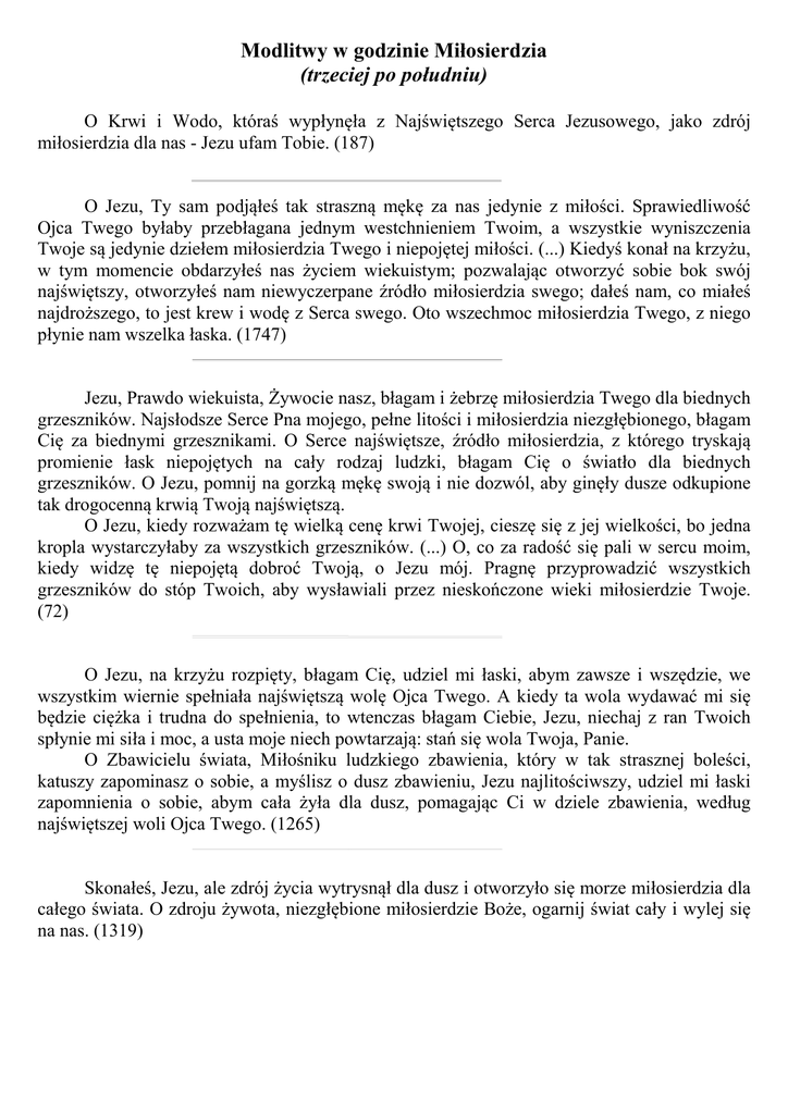 Modlitwy w godzinie Miłosierdzia (trzeciej po południu) O Krwi i Wodo, któraś wypłynęła z Najświętszego Serca Jezusowego, jako zdrój miłosierdzia dla nas - Jezu ufam Tobie. (187) O Jezu, Ty sam podjąłeś tak straszną mękę za nas jedynie z miłości. Sprawiedliwość Ojca Twego byłaby przebłagana jednym westchnieniem Twoim, a wszystkie wyniszczenia Twoje są jedynie dziełem miłosierdzia Twego i niepojętej miłości. (...) Kiedyś konał na krzyżu, w tym momencie obdarzyłeś nas życiem wiekuistym; pozwalając otworzyć sobie bok swój najświętszy, otworzyłeś nam niewyczerpane źródło miłosierdzia swego; dałeś nam, co miałeś najdroższego, to jest krew i wodę z Serca swego. Oto wszechmoc miłosierdzia Twego, z niego płynie nam wszelka łaska. (1747) Jezu, Prawdo wiekuista, Żywocie nasz, błagam i żebrzę miłosierdzia Twego dla biednych grzeszników. Najsłodsze Serce Pna mojego, pełne litości i miłosierdzia niezgłębionego, błagam Cię za biednymi grzesznikami. O Serce najświętsze, źródło miłosierdzia, z którego tryskają promienie łask niepojętych na cały rodzaj ludzki, błagam Cię o światło dla biednych grzeszników. O Jezu, pomnij na gorzką mękę swoją i nie dozwól, aby ginęły dusze odkupione tak drogocenną krwią Twoją najświętszą. O Jezu, kiedy rozważam tę wielką cenę krwi Twojej, cieszę się z jej wielkości, bo jedna kropla wystarczyłaby za wszystkich grzeszników. (...) O, co za radość się pali w sercu moim, kiedy widzę tę niepojętą dobroć Twoją, o Jezu mój. Pragnę przyprowadzić wszystkich grzeszników do stóp Twoich, aby wysławiali przez nieskończone wieki miłosierdzie Twoje. (72) O Jezu, na krzyżu rozpięty, błagam Cię, udziel mi łaski, abym zawsze i wszędzie, we wszystkim wiernie spełniała najświętszą wolę Ojca Twego. A kiedy ta wola wydawać mi się będzie ciężka i trudna do spełnienia, to wtenczas błagam Ciebie, Jezu, niechaj z ran Twoich spłynie mi siła i moc, a usta moje niech powtarzają: stań się wola Twoja, Panie. O Zbawicielu świata, Miłośniku ludzkiego zbawienia, który w tak strasznej boleści, katuszy zapominasz o sobie, a myślisz o dusz zbawieniu, Jezu najlitościwszy, udziel mi łaski zapomnienia o sobie, abym cała żyła dla dusz, pomagając Ci w dziele zbawienia, według najświętszej woli Ojca Twego. (1265) Skonałeś, Jezu, ale zdrój życia wytrysnął dla dusz i otworzyło się morze miłosierdzia dla całego świata. O zdroju żywota, niezgłębione miłosierdzie Boże, ogarnij świat cały i wylej się na nas. (1319)