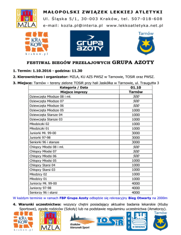 MAŁOPOLSKI ZWIĄZEK LEKKIEJ ATLETYKI Ul. Śląska 5/1 , 30-003 Kraków, tel. 507-018-608 e-mail: [email protected] www.lekkoatletyka.net.pl FESTIWAL BIEGÓW PRZEŁAJOWYCH GRUPA AZOTY 1. Termin: 1.10.2016 - godzina: 11.30 2. Kierownictwo i organizator: MZLA, KU AZS PWSZ w Tarnowie, TOSiR oraz PWSZ. 3. Miejsce: Tarnów – tereny zielone TOSiR przy hali Jaskółka w Tarnowie, ul. Traugutta 3 Kategoria / Data 01.10 Miejsce imprezy Tarnów Dziewczęta Młodsze 08 i mł. Dziewczęta Młodsze 07 Dziewczęta Młodsze 06 Dziewczęta Młodsze 05 Dziewczęta Starsze 04 Dziewczęta Starsze 03 Młodziczki 02 Młodziczki 01 Juniorki Mł. 99-00 Juniorki 97-98 Seniorki 96 i starsze Chłopcy Młodsi 08 i mł. Chłopcy Młodsi 07 Chłopcy Młodsi 06 Chłopcy Młodsi 05 Chłopcy Starsi 04 Chłopcy Starsi 03 Młodzicy 02 Młodzicy 01 Juniorzy Mł. 99-00 Juniorzy 97-98 Seniorzy 96 i starsi 500 500 500 1000 1000 1000 1000 1000 3000 3000 3000 500 500 500 1000 1000 1000 1000 1000 4000 4000 4000 W każdym terminie w ramach FBP Grupa Azoty odbędzie się rekreacyjny Bieg Otwarty na 2000m 4. Warunki uczestnictwa: wszyscy chętni posiadający aktualne badania lekarskie (Kluby Sportowe), zgodę rodziców (Szkoły) lub na podstawie regulaminu uczestnictwa (Amatorzy). MAŁOPOLSKI ZWIĄZEK LEKKIEJ ATLETYKI Ul. Śląska 5/1 , 30-003 Kraków, tel. 507-018-608 e-mail: [email protected] www.lekkoatletyka.net.pl 5. Zgłoszenia: Kluby poprzez system zgłoszeń elektronicznych, który wraz z instrukcją zamieszczony jest pod adresem: http://www.domtel-sport.pl/zgłoszenia/. Zgłoszenia Szkół na adres MZLA [email protected] Uzupełnienia oraz dodatkowe zgłoszenia szkół oraz osób indywidualnych w dniu zawodów w Biurze do godziny 10.30. 6. Biuro zawodów: Tarnów - hol hali sportowej Jaskółka, czynne od godziny 9.30 7. Opłata startowa: start dla wszystkich uczestników jest bezpłatny. 8. Komunikat: dostępny na stronie internetowej www.lekkoatletyka.net.pl 9. Punktacja: w każdej kategorii wiekowej za miejsca od 1 do 16 (20-2 punktów). Zasada przyznawania punktów: 1m.- 20, 2m.- 18, 3m.- 16, 4m.- 14, 5m.- 13, itd. do 16m.- 2. Zawodnicy od 17 miejsca za ukończenie rywalizacji otrzymują 1 punkt. 10. Kolejność końcowa: o pozycji decyduje ilość zdobytych punktów, gdy ta jest taka sama zadecyduje ilość zwycięstw. Przy tej samej ilości zwycięstw o końcowym rozdziale miejsc zadecyduje pozycja w finałowej edycji. Gdy zawodnicy o tej samej ilości punktów nie startowali w finałowej edycji o końcowym miejscu będzie decydować ilość drugich, trzecich itd. pozycji w poszczególnych startach. 11. Nagrody: dla wszystkich uczestników dyplom uczestnictwa, za miejsca 1-3 medale. W wybranych terminach biegi o Puchar Prezydenta Tarnowa: 01.10. biegi juniorów o Puchar Prezydenta Tarnowa W Biegu Otwartym losowanie 30 nagród rzeczowych wśród wszystkich uczestników biegu. W punktacji łącznej Festiwalu Biegów Przełajowych Grupa Azoty za miejsca 1-3 puchary. 12. Ubezpieczenie: zgodnie z art. 38 „Ustawy o sporcie” z 25.06.2010 r. obowiązek ubezpieczenia zawodników od następstw nieszczęśliwych wypadków należy do klubu, którego zawodnik jest członkiem 13. Inne: Udział w Festiwalu Biegów Przełajowych GRUPA AZOTY oznacza akceptację niniejszego regulaminu oraz wiąże się z wyrażeniem zgody na wykorzystanie wizerunku uczestnika imprezy w materiałach promocyjnych organizatora. Interpretacja regulaminu należy do organizatorów, kwestie sporne rozstrzyga organizator. MAŁOPOLSKI ZWIĄZEK LEKKIEJ ATLETYKI Ul. Śląska 5/1 , 30-003 Kraków, tel. 507-018-608 e-mail: [email protected] www.lekkoatletyka.net.pl PROGRAM FESTIWAL BIEGÓW PRZEŁAJOWYCH GRUPA AZOTY TARNÓW 1.10.2016 1. 2. 3. 4. 5. 6. Godzina startu 11.30 11.33 11.36 11.39 11.42 11.45 7. 8. 11.50 11.55 1000 m Dziewczęta Młodsze 1000 m Chłopcy Młodsi 2005 2005 1 pętla 1 pętla 9. 10. 11. 12. 12.00 12.05 12.10 12.15 1000 1000 1000 1000 m m m m 2004 2004 2003 2003 1 1 1 1 pętla pętla pętla pętla 13. 14. 15. 16. 12.20 12.25 12.30 12.35 1000 1000 1000 1000 m m m m 1 1 1 1 pętla pętla pętla pętla 17. 12.40 18. 12.40 2002 2002 2001 2001 1999–2000 1997–1998 1996 i starsze 1999–2000 1997–1998 1996 i starsi - Lp. 19. około 13.15 Dystans 500 500 500 500 500 500 m m m m m m Kategoria wiekowa Dziewczęta Młodsze Chłopcy Młodsi Dziewczęta Młodsze Chłopcy Młodsi Dziewczęta Młodsze Chłopcy Młodsi Dziewczęta Starsze Chłopcy Starsi Dziewczęta Starsze Chłopcy Starsi Młodziczki Młodzicy Młodziczki Młodzicy Juniorki Młodsze 3000 m Juniorki Seniorki Juniorzy Młodsi 4000 m Juniorzy Seniorzy 2000 m Bieg Otwarty Rocznik 2008 i młodsze 2008 i młodsi 2007 2007 2006 2006 Ilość pętli 1 1 1 1 1 1 mała mała mała mała mała mała pętla pętla pętla pętla pętla pętla 2 pętle 3 pętle 2 pętle Dekoracje medalistów po zakończeniu biegu – do dekoracji zapraszamy trenera zwycięzcy. Losowanie nagród rzeczowych wśród uczestników Biegu Otwartego po zakończeniu biegu.