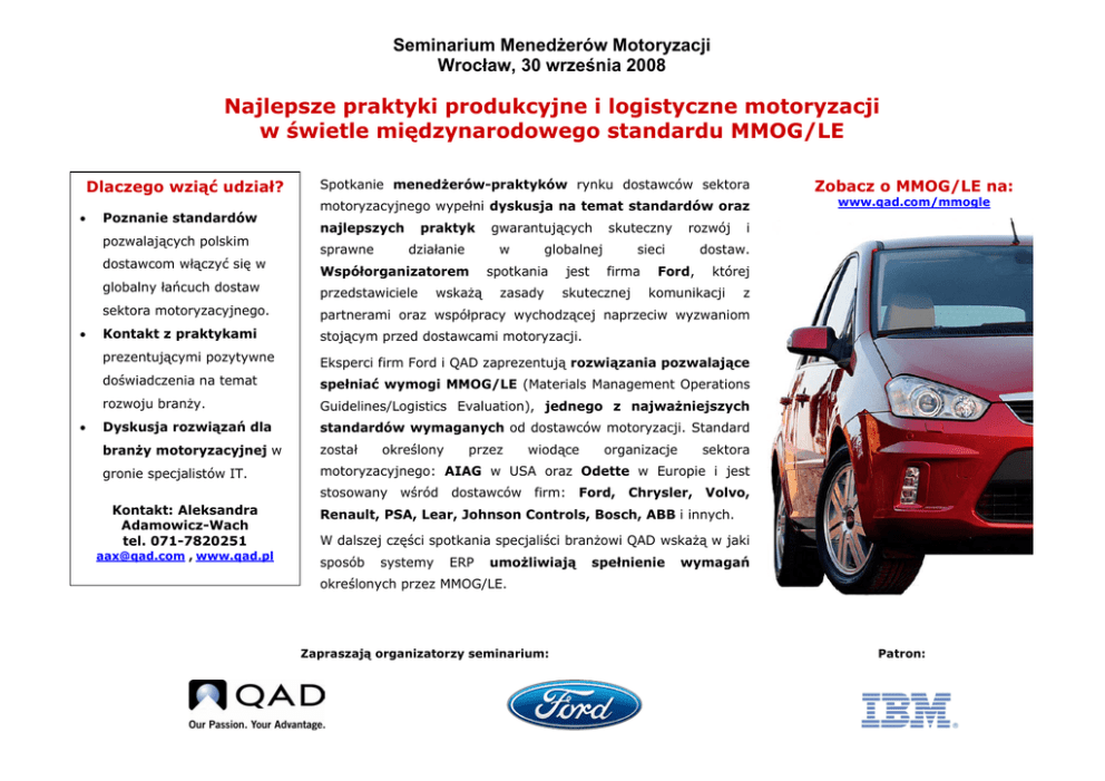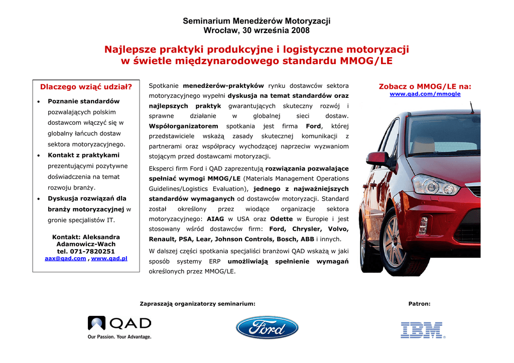 Seminarium Menedżerów Motoryzacji Wrocław, 30 września 2008 Najlepsze praktyki produkcyjne i logistyczne motoryzacji w świetle międzynarodowego standardu MMOG/LE Dlaczego wziąć udział? • Poznanie standardów pozwalających polskim dostawcom włączyć się w • • Spotkanie menedżerów-praktyków rynku dostawców sektora motoryzacyjnego wypełni dyskusja na temat standardów oraz najlepszych sprawne praktyk działanie gwarantujących w Współorganizatorem skuteczny globalnej spotkania jest rozwój sieci firma dostaw. Ford, której przedstawiciele sektora motoryzacyjnego. partnerami oraz współpracy wychodzącej naprzeciw wyzwaniom Kontakt z praktykami stojącym przed dostawcami motoryzacji. prezentującymi pozytywne Eksperci firm Ford i QAD zaprezentują rozwiązania pozwalające doświadczenia na temat spełniać wymogi MMOG/LE (Materials Management Operations rozwoju branży. Guidelines/Logistics Evaluation), jednego z najważniejszych Dyskusja rozwiązań dla standardów wymaganych od dostawców motoryzacji. Standard branży motoryzacyjnej w został gronie specjalistów IT. motoryzacyjnego: AIAG w USA oraz Odette w Europie i jest określony stosowany wśród Kontakt: Aleksandra Adamowicz-Wach tel. 071-7820251 [email protected] , www.qad.pl zasady przez dostawców skutecznej wiodące firm: komunikacji organizacje www.qad.com/mmogle i globalny łańcuch dostaw wskażą Zobacz o MMOG/LE na: z sektora Ford, Chrysler, Volvo, Renault, PSA, Lear, Johnson Controls, Bosch, ABB i innych. W dalszej części spotkania specjaliści branżowi QAD wskażą w jaki sposób systemy ERP umożliwiają spełnienie wymagań określonych przez MMOG/LE. Zapraszają organizatorzy seminarium: Patron: