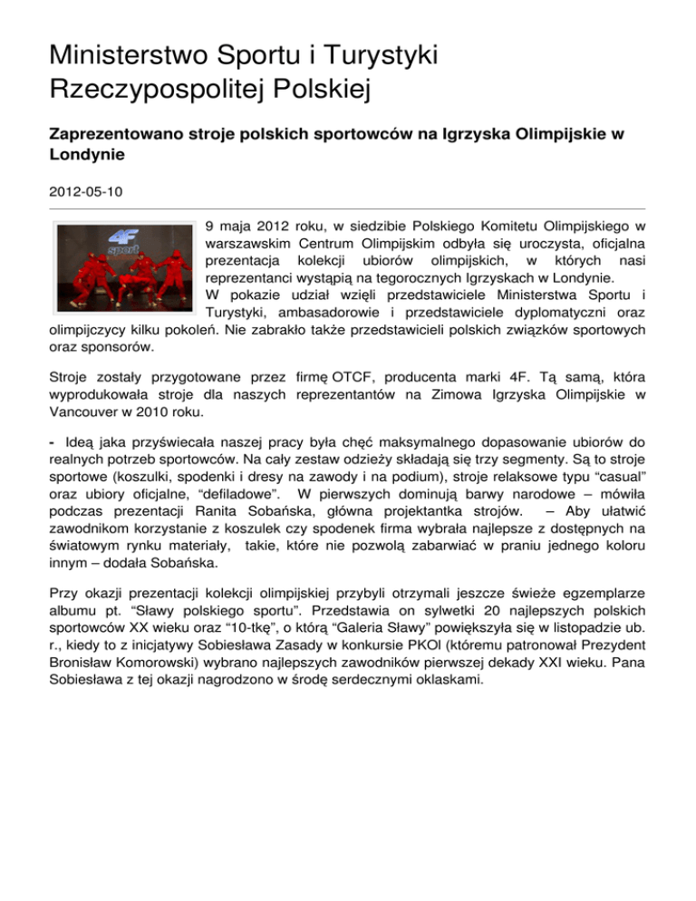 Ministerstwo Sportu i Turystyki Rzeczypospolitej Polskiej Zaprezentowano stroje polskich sportowców na Igrzyska Olimpijskie w Londynie 2012-05-10 9 maja 2012 roku, w siedzibie Polskiego Komitetu Olimpijskiego w warszawskim Centrum Olimpijskim odbyła się uroczysta, oficjalna prezentacja kolekcji ubiorów olimpijskich, w których nasi reprezentanci wystąpią na tegorocznych Igrzyskach w Londynie. W pokazie udział wzięli przedstawiciele Ministerstwa Sportu i Turystyki, ambasadorowie i przedstawiciele dyplomatyczni oraz olimpijczycy kilku pokoleń. Nie zabrakło także przedstawicieli polskich związków sportowych oraz sponsorów. Stroje zostały przygotowane przez firmę OTCF, producenta marki 4F. Tą samą, która wyprodukowała stroje dla naszych reprezentantów na Zimowa Igrzyska Olimpijskie w Vancouver w 2010 roku. - Ideą jaka przyświecała naszej pracy była chęć maksymalnego dopasowanie ubiorów do realnych potrzeb sportowców. Na cały zestaw odzieży składają się trzy segmenty. Są to stroje sportowe (koszulki, spodenki i dresy na zawody i na podium), stroje relaksowe typu “casual” oraz ubiory oficjalne, “defiladowe”. W pierwszych dominują barwy narodowe – mówiła podczas prezentacji Ranita Sobańska, główna projektantka strojów. – Aby ułatwić zawodnikom korzystanie z koszulek czy spodenek firma wybrała najlepsze z dostępnych na światowym rynku materiały, takie, które nie pozwolą zabarwiać w praniu jednego koloru innym – dodała Sobańska. Przy okazji prezentacji kolekcji olimpijskiej przybyli otrzymali jeszcze świeże egzemplarze albumu pt. “Sławy polskiego sportu”. Przedstawia on sylwetki 20 najlepszych polskich sportowców XX wieku oraz “10-tkę”, o którą “Galeria Sławy” powiększyła się w listopadzie ub. r., kiedy to z inicjatywy Sobiesława Zasady w konkursie PKOl (któremu patronował Prezydent Bronisław Komorowski) wybrano najlepszych zawodników pierwszej dekady XXI wieku. Pana Sobiesława z tej okazji nagrodzono w środę serdecznymi oklaskami.