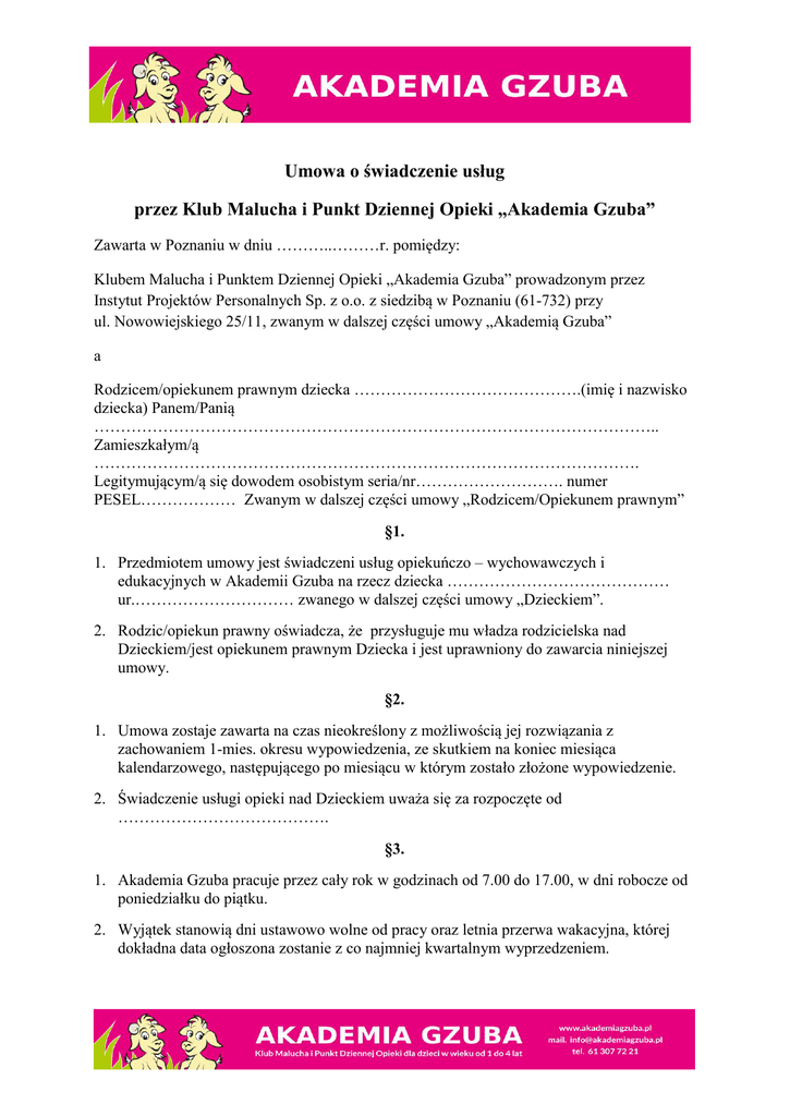 Umowa o świadczenie usług przez Klub Malucha i Punkt Dziennej Opieki „Akademia Gzuba” Zawarta w Poznaniu w dniu ………..………r. pomiędzy: Klubem Malucha i Punktem Dziennej Opieki „Akademia Gzuba” prowadzonym przez Instytut Projektów Personalnych Sp. z o.o. z siedzibą w Poznaniu (61-732) przy ul. Nowowiejskiego 25/11, zwanym w dalszej części umowy „Akademią Gzuba” a Rodzicem/opiekunem prawnym dziecka …………………………………….(imię i nazwisko dziecka) Panem/Panią …………………………………………………………………………………………….. Zamieszkałym/ą …………………………………………………………………………………………. Legitymującym/ą się dowodem osobistym seria/nr………………………. numer PESEL……………… Zwanym w dalszej części umowy „Rodzicem/Opiekunem prawnym” §1. 1. Przedmiotem umowy jest świadczeni usług opiekuńczo – wychowawczych i edukacyjnych w Akademii Gzuba na rzecz dziecka …………………………………… ur.………………………… zwanego w dalszej części umowy „Dzieckiem”. 2. Rodzic/opiekun prawny oświadcza, że przysługuje mu władza rodzicielska nad Dzieckiem/jest opiekunem prawnym Dziecka i jest uprawniony do zawarcia niniejszej umowy. §2. 1. Umowa zostaje zawarta na czas nieokreślony z możliwością jej rozwiązania z zachowaniem 1-mies. okresu wypowiedzenia, ze skutkiem na koniec miesiąca kalendarzowego, następującego po miesiącu w którym zostało złożone wypowiedzenie. 2. Świadczenie usługi opieki nad Dzieckiem uważa się za rozpoczęte od …………………………………. §3. 1. Akademia Gzuba pracuje przez cały rok w godzinach od 7.00 do 17.00, w dni robocze od poniedziałku do piątku. 2. Wyjątek stanowią dni ustawowo wolne od pracy oraz letnia przerwa wakacyjna, której dokładna data ogłoszona zostanie z co najmniej kwartalnym wyprzedzeniem. 3. Akademia Gzuba zastrzega sobie prawo do ustalenia dodatkowych, pojedynczych dni wolnych w danym roku szkolnym, w których placówka będzie nieczynna. Dokładne daty będą ogłaszane z odpowiednim wyprzedzeniem. §4. 1. Akademia Gzuba w ramach niniejszej umowy zobowiązuje się do: a. Profesjonalnej opieki nad Dzieckiem w warunkach bytowych zbliżonych do warunków domowych; b. Zapewnienia bezpieczeństwa w czasie przebywania Dziecka na terenie Akademii Gzuba; c. Zagwarantowania Dziecku właściwej opieki pielęgnacyjnej oraz edukacyjnej, przez prowadzenie zajęć zabawowych z elementami edukacji, z uwzględnieniem indywidualnych potrzeb Dziecka; d. Prowadzenia zajęć opiekuńczo – wychowawczych i edukacyjnych właściwych do wieku rozwojowego oraz uwzględniających rozwój psychomotoryczny, emocjonalny i społeczny Dziecka; e. Zatrudnienia kadry posiadającej odpowiednie kwalifikacje; f. Zagwarantowania zdrowego i racjonalnego żywienia Dziecka w postaci maksymalnie trzech posiłków dziennie: śniadanie, obiad, podwieczorek; g. Objęcia Dziecka grupowym ubezpieczeniem NNW. 2. Rodzic/Opiekun prawny w ramach niniejszej umowy zobowiązuje się do: a. Przestrzegania obowiązujących w Akademii Gzuba zasad i organizacji pracy jak również zasad bezpieczeństwa i higieny; b. Przekazaniu personelowi Akademii Gzuba wyprawki określonej w załączniku nr 5 do przedmiotowej umowy, nie później niż w pierwszym tygodniu pobytu Dziecka; c. Współdziałania z Akademią Gzuba w zakresie wszystkich spraw związanych z pobytem Dziecka w Akademii Gzuba; d. Osobistego przyprowadzania i odbierania Dziecka z Akademii Gzuba. Dopuszcza się możliwość odbioru Dziecka przez osoby pisemnie do tego upoważnione – pełnoletnie; e. Przyprowadzania do Akademii Gzuba Dziecka wyłącznie zdrowego. W razie ewidentnej niedyspozycji dziecka, Akademia Gzuba zastrzega sobie prawo odmówienia przyjęcia Dziecka w danym dniu. W przypadkach wątpliwych Akademia Gzuba poprosi o okazanie zaświadczenia lekarskiego stwierdzającego stan zdrowia Dziecka; f. Natychmiastowego zawiadamiania pracowników Akademii Gzuba w przypadku wystąpienia u Dziecka choroby zakaźnej lub innej mogącej przenosić się na pozostałych podopiecznych Akademii Gzuba; §5. 1. Rodzic/Opiekun prawny oświadcza, że w sprawach pilnych dotyczących Dziecka należy kontaktować się z: Imię i nazwisko Stopień pokrewieństwa Numer telefonu 2. Rodzic/Opiekun prawny przyjmuje do wiadomości, że w trakcie pobytu Dziecka w Akademii Gzuba nie mogą być podawane Dziecku żadne leki. W przypadku wystąpienia u Dziecka objawów chorobowych, Akademia Gzuba niezwłocznie powiadomi Rodziców/Opiekunów prawnych. Dodatkowo w razie zagrożenia zdrowia lub życia Dziecka podjęte zostaną niezbędne działania medyczne, w tym wezwanie lekarza. 3. Rodzic/Opiekun prawny wyraża zgodę na fotografowanie i filmowanie Dziecka na potrzeby dokumentowania pracy Akademii Gzuba i publikowania wybranych zdjęć na stronach internetowych jak również w innych materiałach promocyjnych Akademii Gzuba. 4. Rodzic/Opiekun prawny oświadcza, że przekazał rzetelne informacje na temat stanu zdrowia Dziecka, oraz wszelkich zdarzeń i okoliczności mogących mieć wpływ na jego zachowanie zgodnie z treścią formularza zgłoszeniowego Dziecka. 5. Dziecko jest pod opieką Akademii Gzuba z chwilą przekazania go opiekunowi, do tego czasu Dziecko na terenie placówki jest pod opieką rodzica. §6. 1. Miesięczna opłata stała za pobyt Dziecka w Akademii Gzuba jest zgodna z wybranym abonamentem określonym w załączniku nr 1 do przedmiotowej umowy. 2. Opłata stała nie podlega zwrotowi w przypadku choroby, urlopowania Dziecka oraz przerw w pracy Akademii Gzuba ogłoszonych z odpowiednim wyprzedzeniem. 3. Opłata stała za pobyt Dziecka w Akademii Gzuba pobierana jest z góry do 5 dnia każdego miesiąca. Opłatę tę należy uiszczać przelewem na podany niżej rachunek bankowy: PKO Bank Polski S.A. nr rachunku 8