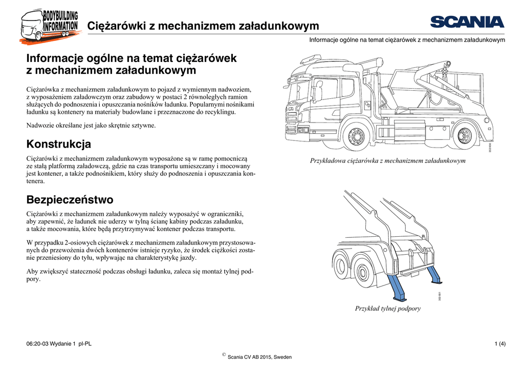 Ciężarówki z mechanizmem załadunkowym Informacje ogólne na temat ciężarówek z mechanizmem załadunkowym Informacje ogólne na temat ciężarówek z mechanizmem załadunkowym Ciężarówka z mechanizmem załadunkowym to pojazd z wymiennym nadwoziem, z wyposażeniem załadowczym oraz zabudowy w postaci 2 równoległych ramion służących do podnoszenia i opuszczania nośników ładunku. Popularnymi nośnikami ładunku są kontenery na materiały budowlane i przeznaczone do recyklingu. Nadwozie określane jest jako skrętnie sztywne. 353 930 Konstrukcja Ciężarówki z mechanizmem załadunkowym wyposażone są w ramę pomocniczą ze stałą platformą załadowczą, gdzie na czas transportu umieszczany i mocowany jest kontener, a także podnośnikiem, który służy do podnoszenia i opuszczania kontenera. Przykładowa ciężarówka z mechanizmem załadunkowym Bezpieczeństwo Ciężarówki z mechanizmem załadunkowym należy wyposażyć w ograniczniki, aby zapewnić, że ładunek nie uderzy w tylną ścianę kabiny podczas załadunku, a także mocowania, które będą przytrzymywać kontener podczas transportu. W przypadku 2-osiowych ciężarówek z mechanizmem załadunkowym przystosowanych do przewożenia dwóch kontenerów istnieje ryzyko, że środek ciężkości zostanie przeniesiony do tyłu, wpływając na charakterystykę jazdy. 353 931 Aby zwiększyć stateczność podczas obsługi ładunku, zaleca się montaż tylnej podpory. Przykład tylnej podpory 06:20-03 Wydanie 1 pl-PL 1 (4) © Scania CV AB 2015, Sweden Ciężarówki z mechanizmem załadunkowym Zalecenia Zalecenia Zalecenia firmy Scania stanowią najlepsze rozwiązanie całościowe, biorąc pod uwagę następujące czynniki: • Wrażliwość na drgania ramy • Podział obciążenia • Komfort jazdy Więcej informacji na temat mocowania i wsporników elementów nadwozia zamieszczono w dokumencie pt. „Mocowanie zabudowy”. 06:20-03 Wydanie 1 pl-PL 2 (4) © Scania CV AB 2015, Sweden Ciężarówki z mechanizmem załadunkowym Zalecenia Montaż Podczas transportu i obsługi ładunku rama podwozia jest wystawiona na działanie ruchów skrętnych. W związku z tym należy upewnić się, że przedni wspornik ramy pomocniczej umożliwia ruch wzdłużny podczas występowania ruchów skrętnych ramy. Zazwyczaj wsporniki podatne są stosowane w przedniej części ramy pomocniczej, natomiast wsporniki sztywne w części tylnej, bezpośrednio za załamaniem ramy. Więcej informacji dotyczących wyboru mocowań dla określonego pojazdu zamieszczono w dokumencie pt. „Wybieranie ramy pomocniczej i mocowania”. Ramę pomocniczą należy zamontować tak blisko osi przedniej, jak to możliwe oraz zgodnie z kształtem ramy podwozia. Rozmieszczenie wsporników różni się w zależności od rozstawu osi i długości tylnego zwisu ramy. Odległość pomiędzy punktami mocowania nie powinna przekraczać 900 mm. W przypadku tego rodzaju zabudowy ruchy podwozia są amortyzowane przez tarcie między ramą pomocniczą a ramą podwozia. Punkty mocowania i wsporniki należy zaprojektować tak, aby siły z zabudowy nie narażały podłużnic ramy na działanie zbyt dużych sił skrętnych. Zabudowa powinna spoczywać na podłużnicach ramy tak, by kierunek sił nośnych znajdował się na tej samej płaszczyźnie, co czoła podłużnic ramy. Przednie wsporniki powinny ograniczać ruch poprzeczny zabudowy. Należy je zaprojektować tak, by umożliwiały ruch wzdłużny występujący pomiędzy zabudową a ramą podwozia przy jej zginaniu. 06:20-03 Wydanie 1 pl-PL 3 (4) © Scania CV AB 2015, Sweden Ciężarówki z mechanizmem załadunkowym Zalecenia Odległość między osią przednią a przednią krawędzią ramy pomocniczej Aby wytłumić wszelkie drgania ramy, należy przesunąć do przodu ramę pomocniczą i przymocować ją do ramy podwozia jak najbliżej przedniej osi. Jest to szczególnie ważne w pojazdach z przednią osią z zawieszeniem pneumatycznym. • Przednie osie z zawieszeniem pneumatycznym: 600 mm • Przednie osie z zawieszeniem na resorach piórowych: 800 mm 800 600 327 097 Maksymalna dopuszczalna odległość między środkiem przedniej osi a przednią krawędzią ramy pomocniczej: Przednia część pojazdu z zawieszeniem pneumatycznym lub na resorach piórowych Odległość pomiędzy osią przednią a wspornikiem przednim Wspornik przedni elementów nadwozia należy zamontować maks. 875 mm za osią przednią w przypadku pojazdów z osią przednią z zawieszeniem na resorach piórowych lub 600 mm w przypadku pojazdów z osią przednią z zawieszeniem pneumatycznym. Przykłady Wymiar A na rysunku nie może być większy niż 900 mm. 600 06:20-03 Wydanie 1 pl-PL A A B A A A 353 929 Wymiar B na rysunku musi mieć co najmniej 500 mm, tak aby wspornik sztywny nie był zbyt obciążony, jednak nie może przekroczyć 900 mm. 4 (4) © Scania CV AB 2015, Sweden