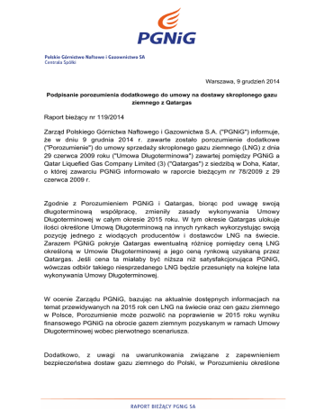 Zarząd Polskiego Górnictwa Naftowego i Gazownictwa S.A. ("PGNiG") informuje,
