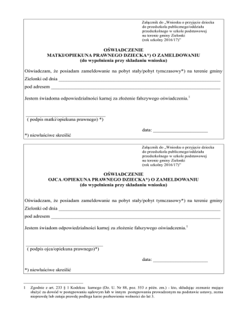 Załącznik do „Wniosku o przyjęcie dziecka do przedszkola publicznego/oddziału przedszkolnego w szkole podstawowej na terenie gminy Zielonki (rok szkolny 2016/17)” OŚWIADCZENIE MATKI/OPIEKUNA PRAWNEGO DZIECKA*) O ZAMELDOWANIU (do wypełnienia przy składaniu wniosku) Oświadczam, że posiadam zameldowanie na pobyt stały/pobyt tymczasowy*) na terenie gminy Zielonki od dnia _________________________________________________________________ pod adresem ____________________________________________________________________ Jestem świadoma odpowiedzialności karnej za złożenie fałszywego oświadczenia.1 ________________________________ ( podpis matki/opiekuna prawnego) *) data: ______________________ *) niewłaściwe skreślić Załącznik do „Wniosku o przyjęcie dziecka do przedszkola publicznego/oddziału przedszkolnego w szkole podstawowej na terenie gminy Zielonki (rok szkolny 2016/17)” OŚWIADCZENIE OJCA /OPIEKUNA PRAWNEGO DZIECKA*) O ZAMELDOWANIU (do wypełnienia przy składaniu wniosku) Oświadczam, że posiadam zameldowanie na pobyt stały/pobyt tymczasowy*) na terenie gminy Zielonki od dnia _________________________________________________________________ pod adresem ____________________________________________________________________ Jestem świadom odpowiedzialności karnej za złożenie fałszywego oświadczenia.1 _______________________________ ( podpis ojca/opiekuna prawnego)*) data: ______________________ *) niewłaściwe skreślić 1 Zgodnie z art. 233 § 1 Kodeksu karnego (Dz. U. Nr 88, poz. 553 z późn. zm.) - kto, składając zeznanie mające służyć za dowód w postępowaniu sądowym lub w innym postępowaniu prowadzonym na podstawie ustawy, zezna nieprawdę lub zataja prawdę podlega karze pozbawienia wolności do lat 3.
