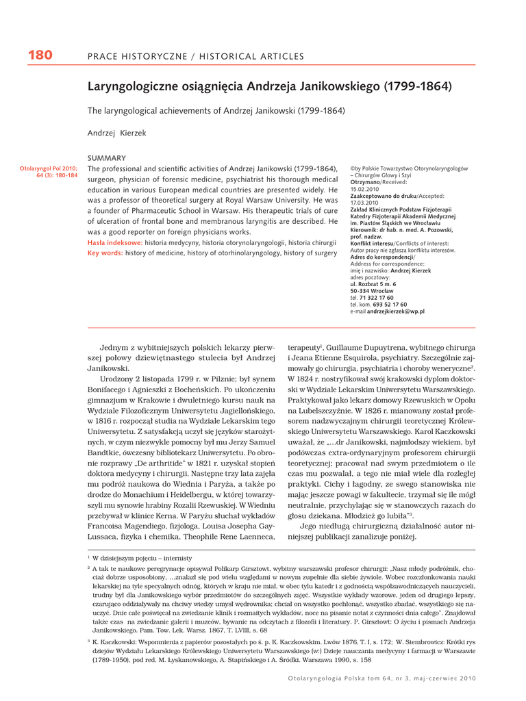 180 PRACE HISTORYCZNE / HISTORICAL ARTICLES Laryngologiczne osiągnięcia Andrzeja Janikowskiego (1799-1864) The laryngological achievements of Andrzej Janikowski (1799-1864) Andrzej Kierzek Otolaryngol Pol 2010; 64 (3): 180-184 SUMMARY The professional and scientific activities of Andrzej Janikowski (1799-1864), surgeon, physician of forensic medicine, psychiatrist his thorough medical education in various European medical countries are presented widely. He was a professor of theoretical surgery at Royal Warsaw University. He was a founder of Pharmaceutic School in Warsaw. His therapeutic trials of cure of ulceration of frontal bone and membranous laryngitis are described. He was a good reporter on foreign physicians works. Hasła indeksowe: historia medycyny, historia otorynolaryngologii, historia chirurgii Key words: history of medicine, history of otorhinolaryngology, history of surgery Jednym z wybitniejszych polskich lekarzy pierwszej połowy dziewiętnastego stulecia był Andrzej Janikowski. Urodzony 2 listopada 1799 r. w Pilznie; był synem Bonifacego i Agnieszki z Bocheńskich. Po ukończeniu gimnazjum w Krakowie i dwuletniego kursu nauk na Wydziale Filozoficznym Uniwersytetu Jagiellońskiego, w 1816 r. rozpoczął studia na Wydziale Lekarskim tego Uniwersytetu. Z satysfakcją uczył się języków starożytnych, w czym niezwykle pomocny był mu Jerzy Samuel Bandtkie, ówczesny bibliotekarz Uniwersytetu. Po obronie rozprawy „De arthritide” w 1821 r. uzyskał stopień doktora medycyny i chirurgii. Następne trzy lata zajęła mu podróż naukowa do Wiednia i Paryża, a także po drodze do Monachium i Heidelbergu, w której towarzyszyli mu synowie hrabiny Rozalii Rzewuskiej. W Wiedniu przebywał w klinice Kerna. W Paryżu słuchał wykładów Francoisa Magendiego, fizjologa, Louisa Josepha GayLussaca, fizyka i chemika, Theophile Rene Laenneca, ©by Polskie Towarzystwo Otorynolaryngologów – Chirurgów Głowy i Szyi Otrzymano/Received: 15.02.2010 Zaakceptowano do druku/Accepted: 17.03.2010 Zakład Klinicznych Podstaw Fizjoterapii Katedry Fizjoterapii Akademii Medycznej im. Piastów Śląskich we Wrocławiu Kierownik: dr hab. n. med. A. Pozowski, prof. nadzw. Konflikt interesu/Conflicts of interest: Autor pracy nie zgłasza konfliktu interesów. Adres do korespondencji/ Address for correspondence: imię i nazwisko: Andrzej Kierzek adres pocztowy: ul. Rozbrat 5 m. 6 50-334 Wrocław tel. 71 322 17 60 tel. kom. 693 52 17 60 e-mail [email protected] terapeuty1, Guillaume Dupuytrena, wybitnego chirurga i Jeana Etienne Esquirola, psychiatry. Szczególnie zajmowały go chirurgia, psychiatria i choroby weneryczne2. W 1824 r. nostryfikował swój krakowski dyplom doktorski w Wydziale Lekarskim Uniwersytetu Warszawskiego. Praktykował jako lekarz domowy Rzewuskich w Opolu na Lubelszczyźnie. W 1826 r. mianowany został profesorem nadzwyczajnym chirurgii teoretycznej Królewskiego Uniwersytetu Warszawskiego. Karol Kaczkowski uważał, że „…dr Janikowski, najmłodszy wiekiem, był podówczas extra-ordynaryjnym profesorem chirurgii teoretycznej; pracował nad swym przedmiotem o ile czas mu pozwalał, a tego nie miał wiele dla rozległej praktyki. Cichy i łagodny, ze swego stanowiska nie mając jeszcze powagi w fakultecie, trzymał się ile mógł neutralnie, przychylając się w stanowczych razach do głosu dziekana. Młodzież go lubiła”3. Jego niedługą chirurgiczną działalność autor niniejszej publikacji zanalizuje poniżej. 1 W dzisiejszym pojęciu – internisty 2 A tak te naukowe peregrynacje opisywał Polikarp Girsztowt, wybitny warszawski profesor chirurgii: „Nasz młody podróżnik, chociaż dobrze usposobiony, …znalazł się pod wielu względami w nowym zupełnie dla siebie żywiole. Wobec rozczłonkowania nauki lekarskiej na tyle specyalnych odnóg, których w kraju nie miał, w obec tylu katedr i z godnością współzawodniczących nauczycieli, trudny był dla Janikowskiego wybór przedmiotów do szczególnych zajęć. Wszystkie wykłady wzorowe, jeden od drugiego lepszy, czarująco oddziaływały na chciwy wiedzy umysł wędrownika; chciał on wszystko pochłonąć, wszystko zbadać, wszystkiego się nauczyć. Dnie całe poświęcał na zwiedzanie klinik i rozmaitych wykładów, noce na pisanie notat z czynności dnia całego”. Znajdował także czas na zwiedzanie galerii i muzeów, bywanie na odczytach z filozofii i literatury. P. Girsztowt: O życiu i pismach Andrzeja Janikowskiego. Pam. Tow. Lek. Warsz. 1867, T. LVIII, s. 68 3 K. Kaczkowski: Wspomnienia z papierów pozostałych po ś. p. K. Kaczkowskim. Lwów 1876, T. I, s. 172; W. Stembrowicz: Krótki rys dziejów Wydziału Lekarskiego Królewskiego Uniwersytetu Warszawskiego (w:) Dzieje nauczania medycyny i farmacji w Warszawie (1789-1950), pod red. M. Łyskanowskiego, A. Stapińskiego i A. Śródki. Warszawa 1990, s. 158 Otolar yngologia Polska tom 6 4, nr 3, maj-c zer wiec 2010 PRACE HISTORYCZNE / HISTORICAL ARTICLES Ryc. 1. Andrzej Janikowski (1879-1864). Kłosy 1867, T. IV, Nr 104, s. 309 Po zamknięciu Uniwersytetu, w 1832 r. został członkiem Rady Ogólnej Lekarskiej, nazwanej później Radą Lekarską Królestwa Polskiego4; od 1849 r. był jej sekretarzem naukowym, obejmując także dział orzecznictwa medycyny sądowej, opracowując opinie sądowo-lekarskie, rozstrzygające w procesach karnych. Zajmował się także „policją lekarską”. Z jego inicjatywy w 1840 r. w Warszawie założono Szkołę Farmaceutyczną5, w której sam bezinteresownie wykładał. Po włączeniu Szkoły w 1857 r. do nowopowstałej Akademii Medyko-Chirurgicznej, jesienią 1859 r. wraz z synem Stanisławem wyjechał do Francji, Niemiec i Anglii, by doszkolić się w sprawach organizacyjnych. Został członkiem komi- tetu zarządzającego Akademii, a w 1859 r. profesorem zwyczajnym medycyny sądowej, policji lekarskiej i psychiatrii. Pełnił także obowiązki sekretarza naukowego uczelni. W roku akademickim 1861/62