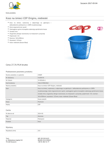Szczecin 2017-03-04 Karta produktu: Kosz na śmieci CEP Origins, niebieski Kosz na śmieci, wykonany z odpornego na pęknięcia i odkształcenia polistyrenu w 100% recyklowanego Dwie ergonomiczne rączki Zaokrąglone górne krawędzie ułatwiają opróżnianie kosza Smukła linia Oryginalny design wzorowany na motywach z przyrody Pojemność: 15l Rozmiar: 363x300mm Wysokość: 323mm Kolor niebieski (Ocean Blue) Cena 27,76 PLN brutto Podstawowe parametry produktu Numer produktu w systemie 19689 Nr dostawcy C6200-01 Nr Celcen 19-00168-6 Kod kreskowy 3462159002064 Nazwa produktu Kosz na śmieci CEP Origins, niebieski Opis Kosz na śmieci, wykonany z odpornego na pęknięcia i odkształcenia polistyrenu w 100% recyklowanego; dwie ergonomiczne rączki; zaokrąglone górne krawędzie ułatwiają opróżnianie kosza; smukła linia; oryginalny design wzorowany na motywach z przyrody; pojemność: 15l; rozmiar: 363x300mm; wysokość: 323mm; kolor niebieski (Ocean Blue) Kategoria Kosze plastik Klasa Premium Marka CEP Cecha W ofercie od 2014-01 Typ Ażurowy Materiał Polistyren Produkt Kosz Wymiary Wysokość (mm) 323 Toris ul. Władysława Jagieły 9/1 70-260 Szczecin NIP: 8521011619 REGON: 811220024 +48 91 482 51 77 Szczecin 2017-03-04 Karta katalogowa produktu cd. Kosz na śmieci CEP Origins, niebieski Wymiary (mm) 363x300 Rozmiar 15l Wspólny słownik zamówień CPV 39224340-3 Kosze Certyfikaty Nowy produkt w ofercie Standard Hit Standard Kolor Kolor Niebieski Pozostałe zdjęcia produktu Serdecznie zapraszamy do współpracy Toris zespół. Toris ul. Władysława Jagieły 9/1 70-260 Szczecin NIP: 8521011619 REGON: 811220024 +48 91 482 51 77