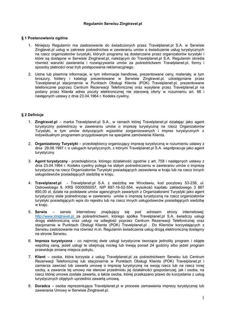 Regulamin Serwisu Zingtravel.pl § 1 Postanowienia ogólne 1. Niniejszy Regulamin ma zastosowanie do świadczonych przez Travelplanet.pl S.A. w Serwisie Zingtavel.pl usług w zakresie pośrednictwa w zawieraniu umów o świadczenie usług turystycznych na rzecz organizatorów turystyki, których programy są dostarczane przez organizatorów turystyki i które są dostępne w Serwisie Zinglravel.pl, należącym do Travelplanet.pl S.A. Regulamin określa również warunki zawierania i rozwiązywania umów za pośrednictwem Travelplanet.pl, formy i sposoby płatności oraz tryb postępowania reklamacyjnego. 2. Ustne lub pisemne informacje, w tym informacje handlowe, prezentowane ceny, materiały, w tym broszury, foldery i katalogi prezentowane w Serwisie Zingtravel.pl, udostępniane przez Travelplanet.pl stacjonarnie w Punktach Obsługi Klienta (POK) Travelplanet.pl, prezentowane telefonicznie poprzez Centrum Rezerwacji Telefonicznej oraz wysyłane przez Travelplanet.pl na podany przez Klienta adres poczty elektronicznej nie stanowią oferty w rozumieniu art. 66 i następnych ustawy z dnia 23.04.1964 r. Kodeks cywilny. § 2 Definicje 1. Zingtravel.pl – marka Travelplanet.pl S.A., w ramach której Travelplanet.pl działając jako agent turystyczny pośredniczy w zawieraniu umów o imprezę turystyczną na rzecz Organizatorów Turystyki, w tym umów dotyczących wyjazdów zorganizowanych i imprez turystycznych z indywidualnym programem przygotowanym na specjalne zamówienie Klienta. 2. Organizatorzy Turystyki – przedsiębiorcy organizujący imprezę turystyczną w rozumieniu ustawy z dnia 29.08.1997 r. o usługach turystycznych, z którymi Travelplanet.pl S.A. współpracuje jako agent turystyczny. 3. Agent turystyczny - przedsiębiorca, którego działalność zgodnie z art. 758 i następnych ustawy z dnia 23.04.1964 r. Kodeks cywilny polega na stałym pośredniczeniu w zawieraniu umów o imprezę turystyczną na rzecz Organizatorów Turystyki posiadających zezwolenia w kraju lub na rzecz innych usługodawców posiadających siedzibę w kraju. 4. Travelplanet.pl - Travelplanet.pl S.A. z siedzibą we Wrocławiu, kod pocztowy 53-238, ul. Ostrowskiego 9, KRS 0000055057, NIP 897-16-52-554, wysokość kapitału zakładowego 3 867 850,00 zł, działa na podstawie umów agencyjnych zawartych z Organizatorami Turystyki jako agent turystyczny stale pośrednicząc w zawieraniu umów o imprezę turystyczną na rzecz organizatorów turystyki posiadających wpis do rejestru lub na rzecz innych usługodawców posiadających siedzibę w kraju. 5. Serwis – serwis internetowy znajdujący się pod adresem strony internetowej: http://www.zingtravel.pl za pośrednictwem, którego spółka Travelplanet.pl S.A. świadczy usługi drogą elektroniczną oraz usługi na odległość poprzez Centrum Rezerwacji Telefonicznej oraz stacjonarnie w Punktach Obsługi Klienta (POK) Travelplanet.pl . Do Klientów korzystających z Serwisu zastosowanie ma również m.in. Regulamin świadczenia usług drogą elektroniczną dostępny na stronie Serwisu. 6. Impreza turystyczna - co najmniej dwie usługi turystyczne tworzące jednolity program i objęte wspólną ceną, jeżeli usługi te obejmują nocleg lub trwają ponad 24 godziny albo jeżeli program przewiduje zmianę miejsca pobytu. 7. Klient – osoba, która korzysta z usług Travelplanet.pl za pośrednictwem Serwisu lub Centrum Rezerwacji Telefonicznej lub stacjonarnie w Punktach Obsługi Klienta (POK) Travelplanet.pl i zamierza zawrzeć lub zawarła umowę o imprezę turystyczną na swoją rzecz lub na rzecz innej osoby, a zawarcie tej umowy nie stanowi przedmiotu jej działalności gospodarczej, jak i osoba, na rzecz której umowa została zawarta, a także osoba, której przekazano prawo do korzystania z usług turystycznych objętych uprzednio zawartą umową. 8. Doradca – osoba reprezentująca Travelplanet.pl w procesie zamawiania imprezy turystycznej lub zawierania Umowy w Serwisie Zingtravel.pl. 1 9. Rezerwacja wstępna – wstępna deklaracja przez Klienta woli zawarcia umowy o imprezę turystyczną przez Travelplanet.pl S.A. 10. Umowa – umowa o imprezę turystyczną zawierana pomiędzy Klientem a Organizatorem Turystyki za pośrednictwem Travelplanet.pl 11. Warunki uczestnictwa – dokument sporządzony przez Organizatora Turystyki określający prawa i obowiązki Klienta i Organizatora Turystyki w związku ze świadczeniem przez Organizatora usług turystycznych; Warunki uczestnictwa są integralną częścią Umowy i są dostępne w Serwisie w zakładce „Dokumenty” na każdej stronie opisującej konkretną imprezę turystyczną. § 3 Zasady zakupu imprezy turystycznej 1. Korzystając z usług świadczonych przez Travelplanet.pl pod marką Zingtravel.pl za pośrednictwem Serwisu, poprzez Centrum Rezerwacji Telefonicznej Zingtravel.pl oraz w stacjonarnych Punktach Obsługi Klienta (POK) Travelplanet.pl Klient akceptuje warunki określone w niniejszym Regulaminie i ponosi odpowiedzialność za podjęte działania wynikające z korzystania z tych usług. 2. Korzystając z usług świadczonych przez Travelplanet.pl S.A. pod marką Zingtravel.pl za pośrednictwem Serwisu, jak również korzystając z usług świadczonych przez Travelplanet.pl pod marką Zingtravel.pl poprzez Centrum Rezerwacji Telefonicznej, Klient wyraża zgodę na przesyłanie mu przez Travelplanet.pl S.A. dokumentów w formie elektronicznej na wskazany przez Klienta adres poczty elektronicznej oraz zobowiązuje się do zapoznania się z ich treścią. 3. Korzystanie z usług świadczonych przez Travelplanet.pl pod marką Zingtravelp.pl za pośrednictwem Serwisu, jak również korzystając z usług świadczonych przez Travelplanet.pl pod marką Zingtravel.pl poprzez Centrum Rezerwacji Telefonicznej przez Klienta lub stacjonarnie w Punktach Obsługi Klienta (POK) Travelplanet.pl możliwe jest tylko we własnym imieniu. Jeśli Klient czyni to w imieniu osoby trzeciej, oznacza to, że p