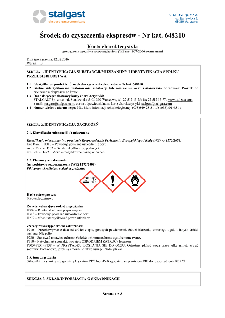 STALGAST Sp. z o.o. ul. Staniewicka 5, 03-310 Warszawa; Środek do czyszczenia ekspresów - Nr kat. 648210 Karta charakterystyki sporządzona zgodnie z rozporządzeniem (WE) nr 1907/2006 ze zmianami Data sporządzenia: 12.02.2016 Wersja: 1.0 SEKCJA 1. IDENTYFIKACJA SUBSTANCJI/MIESZANIINY I IDENTYFIKACJA SPÓŁKI/ PRZEDSIĘBIORSTWA 1.1 Identyfikator produktu: Środek do czyszczenia ekspresów – Nr kat. 648210 1.2 Istotne zidentyfikowane zastosowania substancji lub mieszaniny oraz zastosowania odradzane: Proszek do czyszczenia ekspresów do kawy. 1.3 Dane dotyczące dostawcy karty charakterystyki: STALGAST Sp. z o.o., ul. Staniewicka 5, 03-310 Warszawa, tel. 22 517 15 75; fax 22 517 15 77, www.stalgast.com, e-mail: [email protected], osoba odpowiedzialna za kartę charakterystyki: [email protected] 1.4 Numer telefonu alarmowego: 998, Biuro informacji toksykologicznej: (058)349-28-31 lub (058)301-65-16 SEKCJA 2. IDENTYFIKACJA ZAGROŻEŃ 2.1. Klasyfikacja substancji lub mieszaniny Klasyfikacja mieszaniny (na podstawie Rozporządzenia Parlamentu Europejskiego i Rady (WE) nr 1272/2008) Eye Dam. 1 H318 – Powoduje poważne uszkodzenie oczu Acute Tox. 4 H302 – Działa szkodliwie po połknięciu Ox. Sol. 2 H272 – Może intensyfikować pożar; utleniacz. 2.2. Elementy oznakowania (na podstawie rozporządzenia (WE) 1272/2008) Piktogram określający rodzaj zagrożenia: Hasło ostrzegawcze: Niebezpieczeństwo Zwroty wskazujące rodzaj zagrożenia: H302 – Działa szkodliwie po połknięciu H318 – Powoduje poważne uszkodzenie oczu H272 – Może intensyfikować pożar; utleniacz. Zwroty wskazujące środki ostrożności: P210 – Przechowywać z dala od źródeł ciepła, gorących powierzchni, źródeł iskrzenia, otwartego ognia i innych źródeł zapłonu. Nie palić P280 – Stosować rękawice ochronne/odzież ochronną/ochronę oczu/ochronę twarzy P310 – Natychmiast skontaktować się z OŚRODKIEM ZATRUĆ / lekarzem P305+P351+P338 – W PRZYPADKU DOSTANIA SIĘ DO OCZU: Ostrożnie płukać wodą przez kilka minut. Wyjąć soczewki kontaktowe, jeżeli są i można je łatwo usunąć. Nadal płukać 2.3. Inne zagrożenia Składniki mieszaniny nie spełniają kryteriów PBT lub vPvB zgodnie z załącznikiem XIII do rozporządzenia REACH. SEKCJA 3. SKŁAD/INFORMACJA O SKŁADNIKACH Strona 1 z 8 STALGAST Sp. z o.o. ul. Staniewicka 5, 03-310 Warszawa; Środek do czyszczenia ekspresów - Nr kat. 648210 3.1. Substancje Nie dotyczy 3.2. Mieszaniny Skład (zgodnie z 648/2004/WE): >30% związki wybielające na bazie tlenu, <10% węglan sodu, substancje pomocnicze niesklasyfikowane jako niebezpieczne Numery Klasyfikacja Nazwa substancji Stężenie [% wag.] CAS/ WE Indeksowy Rejestracji Wg 1272/2008 (CLP) 0115630-89-4 Nie Ox. Sol. 2 H272, Acute Tox. 4 Nadwęglan sodu < 90 2119457268239-707-6 dotyczy H302, Eye Dam 1 H318 30-XXXX 01497-19-8 011-005Węglan sodu < 10 2119485498Eye Irrit. 2 H319 207-838-8 00-2 19-XXXX Pełne brzmienia symboli oraz zwrotów H znajdują się w sekcji 16. SEKCJA 4. ŚRODKI PIERWSZEJ POMOCY 4.1. Opis środków pierwszej pomocy Wdychanie – W przypadku wystąpienia objawów zatrucia inhalacyjnego (kaszel, uczucie duszności, zawroty głowy) wyprowadzić poszkodowanego na świeże powietrze. W razie potrzeby wezwać pomoc lekarską. Skóra – W przypadku skażenia odzieży niezwłocznie ją zdjąć, obmyć skórę dużą ilością wody (najlepiej bieżącą). W przypadku wystąpienia zmian skórnych lub oparzeń skontaktować się z lekarzem. Oczy – Zanieczyszczone oczy przemyć dużą ilością chłodnej wody (co najmniej przez 15 minut) rozdzielając osobno powieki, skonsultować się z lekarzem specjalistą Spożycie – W przypadku spożycia nie wywoływać wymiotów. Podać do wypicia dużą ilość wody. Nie podawać środków zobojętniających. Niezwłocznie skonsultować się z lekarzem, jeżeli to możliwe pokazać etykietę. 4.2. Najważniejsze ostre i opóźnione objawy oraz skutki narażenia Wdychanie - w przypadku narażenia na działanie pyłu i przy braku wentylacji może spowodować podrażnienie górnych dróg oddechowych, podrażnienie nosa i gardła, w dużych stężeniach możliwość wystąpienia kaszlu. Skóra – w przypadku kontaktu ze skórą może spowodować podrażnienie Oczy – powoduje poważne uszkodzenie oczu Spożycie – działa szkodliwie po połknięciu, możliwe zmiany w stanie zdrowia, wymioty, biegunka 4.3. Wskazania dotyczące wszelkiej natychmiastowej pomocy lekarskiej i szczególnego postępowania z poszkodowanym Wezwać pomoc medyczną. Na stanowisku pracy konieczny dostęp do świeżej wody oraz preparatów do przemywania oczu. SEKCJA 5. POSTĘPOWANIE W PRZYPADKU POŻARU 5.1. Środki gaśnicze Odpowiednie środki gaśnicze: pożary w obecności produktu gasić środkami gaśniczymi odpowiednimi do palącego się otoczenia. – rozpylona woda, piany odporne na działanie alkoholu, proszki gaśnicze, dwutlenek węgla Niewłaściwe środki gaśnicze: zwarty strumień wody. 5.2. Szczególne zagrożenia związane z substancją lub mieszaniną Wydzielający się tlen jako produkt rozkładu może podtrzymywać ogień. Produkt sprzyja powstawaniu pożarów. Nie przechowywać razem z materiałami palnymi. Kontakt z materiałami palnymi może wywoływać pożar. Może wybuchnąć od źródeł ciepła i zanieczyszczeń. Podczas pożaru może uwalniać się tlenek i dwutlenek węgla, tlenki sodu. 5.3. Informacje dla straży pożarnej Stosować środki izolujące drogi oddechowe i ubranie ochronne. W przypadku pożaru zawiadomić osoby znajdujące się w pobliżu o pożarze, usunąć z obszaru zagrożenia osoby postronne, powiadomić Straż Pożarną. Jeżeli to możliwe usunąć zbiorniki z preparatem z dala od działania ognia i wysokiej temperatury. Jeżeli to niemożliwe wówczas chłodzić zbiorniki znajdujące się w pobliżu ognia poprzez spryskiwanie strumieniem wody. Pozostałości po spaleniu muszą zostać całkowicie Strona 