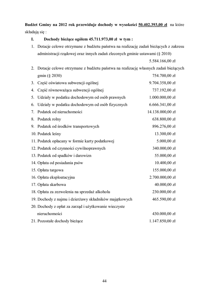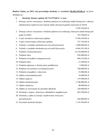 44 Budżet Gminy na 2012 rok przewiduje dochody w wysokości
