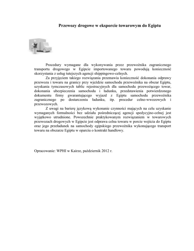 Przewozy drogowe w eksporcie towarowym do Egiptu Procedury wymagane dla wykonywania przez przewoźnika zagranicznego transportu drogowego w Egipcie importowanego towaru powodują konieczność skorzystania z usług tutejszych agencji shippingowo-celnych. Za przyjęciem takiego rozwiązania przemawia konieczność dokonania odprawy przewozu i towaru na granicy przy wjeździe samochodu przewoźnika na obszar Egiptu, uzyskania tymczasowych tablic rejestracyjnych dla samochodu przewożącego towar, dokonania ubezpieczenia samochodu i ładunku, przedstawienia potwierdzonego dokumentu firmy gwarantującego wyjazd z Egiptu samochodu przewoźnika zagranicznego po dostarczeniu ładunku, itp. procedur celno-wwozowych i przewozowych. Z uwagi na barierę językową wykonanie czynności mających na celu uzyskanie wymaganych formalności bez udziału pośredniczącej agencji spedycyjno-celnej jest wyjątkowo utrudnione. Powszechnie praktykowanym rozwiązaniem w towarowych przewozach drogowych w Egipcie jest odprawa celna towaru w porcie wejścia do Egiptu oraz jego przeładunek na samochody egipskiego przewoźnika wykonującego transport towaru na obszarze Egiptu w oparciu o kontrakt handlowy. Opracowanie: WPHI w Kairze, październik 2012 r.