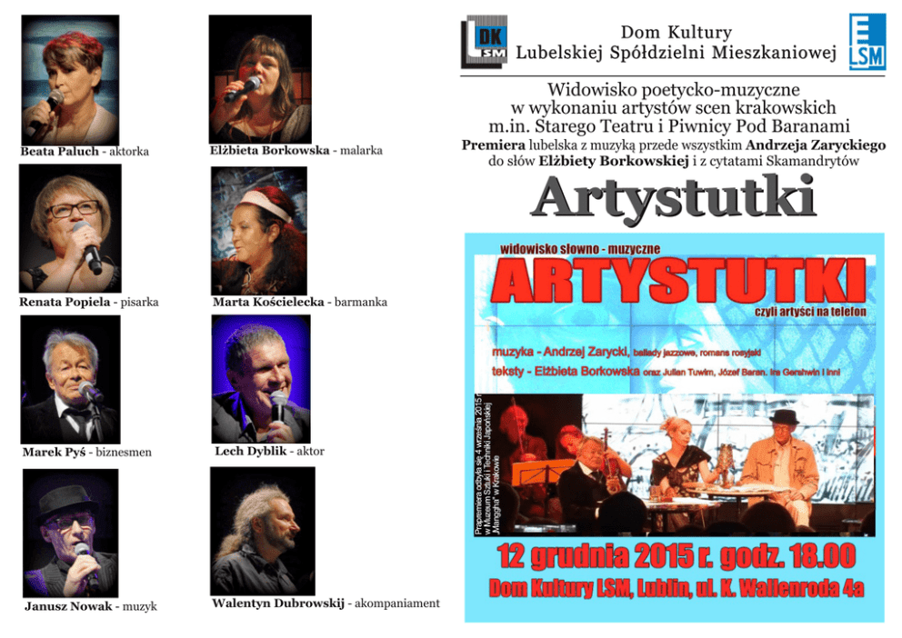 Dom Kultury Lubelskiej Spółdzielni Mieszkaniowej Widowisko poetyckomuzyczne w wykonaniu artystów scen krakowskich m.in. Starego Teatru i Piwnicy Pod Baranami Beata Paluch aktorka Elżbieta Borkowska malarka Premiera lubelska z muzyką przede wszystkim Andrzeja Zaryckiego do słów Elżbiety Borkowskiej i z cytatami Skamandrytów Renata Popiela pisarka Marta Kościelecka barmanka Marek Pyś biznesmen Lech Dyblik aktor Janusz Nowak muzyk Walentyn Dubrowskij akompaniament Prapremiera odbyła się 4 września 201 5 r. w Muzeum Sztuki i Techniki Japońskiej „Manggha" w Krakowie A r t ys t u t k i Premiera widowiska słowno muzycznego „Artystutki" z muzyką przede wszystkim Andrzeja Zaryckiego do słów Elżbiety Borkowskiej i z cytatami Skamandrytów. Spektakl opowiada o losie współczesnych, sponiewieranych przez rzeczywistość artystów, którzy zrozumienie dla swych wrażliwości odnajdują w kafejkach artystycznych. „Artystutki" to radosne i zgryźliwe dialogi przeplatane utworami śpiewanymi, to rozterki, poszukiwania i zderzenie z brutalną rzeczywistością... „Wielkie sławy w świecie były mocno żyli! dumnie, szumnie... Im kariery się skończyły bezpowrotnie w trumnie..." Dom Kultury Lubelskiej Spółdzielni Mieszkaniowej Widowisko poetyckomuzyczne w wykonaniu artystów scen krakowskich m.in. Starego Teatru i Piwnicy Pod Baranami Premiera lubelska z muzyką przede wszystkim Andrzeja Zaryckiego do słów Elżbiety Borkowskiej i z cytatami Skamandrytów A r t ys t u t k i czyli artyści na telefon „Artystutki" to spotkanie artystów rozmowy, spory, śpiewy. Afirmacja życia i sztuki przeplatana słowami goryczy. Artyści w dzisiejszym świecie czują się zepchnięci na margines życia, traktowani są niejednokronie przedmiotowo, są do wynajęcia „na godziny". Spektakl jest trochę protestem przeciwko takiemu traktowaniu ludzi sztuki. Miejscem, gdzie się spotykają pod skrzydłami rozumiejącej świat bohemy barmanki, jest jej kawiarenka. W opozycji do zawieszonych w nierzeczywistej przestrzeni gości kafejki jest postać bezdusznego i kpiącego biznesmena (Marek Pyś)... Andrzej Grabowski, który brał udział w prawykonaniu, powiedział: Oddaliście niepowtarzalną atmosferę krakowskiego Spatifu! Takich miejsc, niestety, już nie ma. Prapremiera odbyła się 4 września 2015 r. w Muzeum Sztuki i Techniki Japońskiej „Manggha" w Krakowie. W Lublinie PREMIERA 12 grudnia o godz. 18:00 Zapraszamy Występują: Beata Paluch aktorka śpiew i recytacja Elżbieta Borkowska malarka śpiew i recytacja Marta Kościelecka barmanka recytacja Renata Popiela pisarka śpiew, recytacja Marek Pyś biznesmen recytacja Lech Dyblik aktor marzyciel śpiew, recytacja Janusz Nowak muzyk utracjusz śpiew, recytacja Walentyn Dubrowskij akompaniament Muzyka: Andrzej Zarycki, Ludwik Sempoliński, Marek Grechuta, George Gershwin, Harold Arlen (czyli poezja śpiewana, piosenka międzywojenna, standardy jazowe) Teksty: Elżbieta Borkowska, Julian Tuwim, Ryszard Krynicki, Ira Gershwin, Johny Mercer Widowisko odbędzie się w sobotę 12 grudnia 2015 r. o godz. 18.00 w sali widowiskowej Domu Kultury LSM w Lublinie, ul. K. Wallenroda 4a, tel. 81 743 48 29 www.domkulturylsm.pl Bilet 10 zł