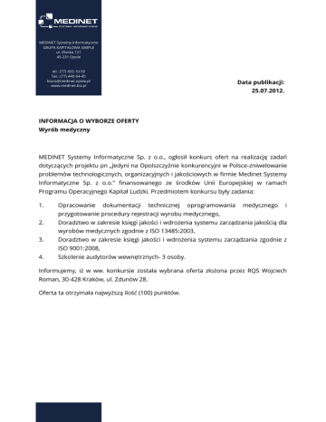 MEDINET Systemy Informatyczne GRUPA KAPITAŁOWA SIMPLE ul. Oleska 121 45-231 Opole tel.: (77) 455-10-50 fax.: (77) 440-64-45 [email protected] www.medinet.biz.pl Data publikacji: 25.07.2012. INFORMACJA O WYBORZE OFERTY Wyrób medyczny MEDINET Systemy Informatyczne Sp. z o.o., ogłosił konkurs ofert na realizację zadań dotyczących projektu pn „Jedyni na Opolszczyźnie konkurencyjni w Polsce-zniwelowanie problemów technologicznych, organizacyjnych i jakościowych w firmie Medinet Systemy Informatyczne Sp. z o.o.” finansowanego ze środków Unii Europejskiej w ramach Programu Operacyjnego Kapitał Ludzki. Przedmiotem konkursu były zadania: 1. Opracowanie dokumentacji technicznej oprogramowania medycznego i przygotowanie procedury rejestracji wyrobu medycznego, 2. Doradztwo w zakresie księgi jakości i wdrożenia systemu zarządzania jakością dla wyrobów medycznych zgodnie z ISO 13485:2003, 3. Doradztwo w zakresie księgi jakości i wdrożenia systemu zarządzania zgodnie z ISO 9001:2008, 4. Szkolenie audytorów wewnętrznych- 3 osoby. Informujemy, iż w ww. konkursie została wybrana oferta złożona przez RQS Wojciech Roman, 30-428 Kraków, ul. Zdunów 28. Oferta ta otrzymała najwyższą ilość (100) punktów.