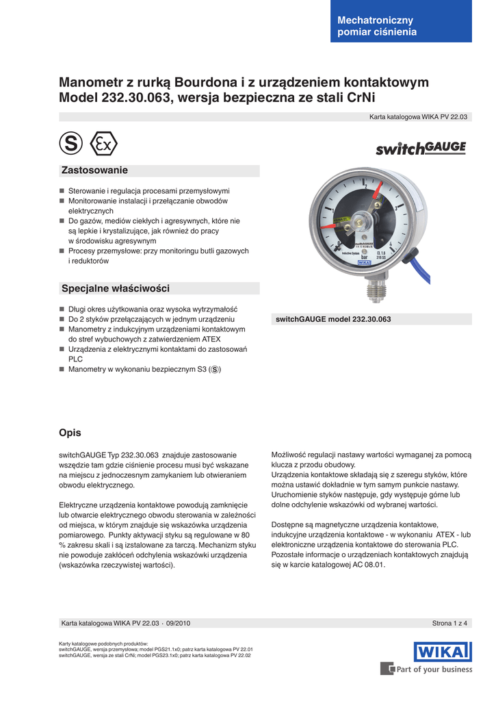 Mechatroniczny pomiar ciśnienia Manometr z rurką Bourdona i z urządzeniem kontaktowym Model 232.30.063, wersja bezpieczna ze stali CrNi Karta katalogowa WIKA PV 22.03 k Zastosowanie Sterowanie i regulacja procesami przemysłowymi Monitorowanie instalacji i przełączanie obwodów elektrycznych Do gazów, mediów ciekłych i agresywnych, które nie są lepkie i krystalizujące, jak również do pracy w środowisku agresywnym ■■ Procesy przemysłowe: przy monitoringu butli gazowych i reduktorów Specjalne właściwości Długi okres użytkowania oraz wysoka wytrzymałość Do 2 styków przełączających w jednym urządzeniu Manometry z indukcyjnym urządzeniami kontaktowym do stref wybuchowych z zatwierdzeniem ATEX Urządzenia z elektrycznymi kontaktami do zastosowań PLC ■■ Manometry w wykonaniu bezpiecznym S3 (k) switchGAUGE model 232.30.063 Opis switchGAUGE Typ 232.30.063 znajduje zastosowanie wszędzie tam gdzie ciśnienie procesu musi być wskazane na miejscu z jednoczesnym zamykaniem lub otwieraniem obwodu elektrycznego. Elektryczne urządzenia kontaktowe powodują zamknięcie lub otwarcie elektrycznego obwodu sterowania w zależności od miejsca, w którym znajduje się wskazówka urządzenia pomiarowego. Punkty aktywacji styku są regulowane w 80 % zakresu skali i są izstalowane za tarczą. Mechanizm styku nie powoduje zakłóceń odchylenia wskazówki urządzenia (wskazówka rzeczywistej wartości). Karta katalogowa WIKA PV 22.03 ∙ 09/2010 Karty katalogowe podobnych produktów: switchGAUGE, wersja przemysłowa; model PGS21.1x0; patrz karta katalogowa PV 22.01 switchGAUGE, wersja ze stali CrNi; model PGS23.1x0; patrz karta katalogowa PV 22.02 Możliwość regulacji nastawy wartości wymaganej za pomocą klucza z przodu obudowy. Urządzenia kontaktowe składają się z szeregu styków, które można ustawić dokładnie w tym samym punkcie nastawy. Uruchomienie styków następuje, gdy występuje górne lub dolne odchylenie wskazówki od wybranej wartości. Dostępne są magnetyczne urządzenia kontaktowe, indukcyjne urządzenia kontaktowe - w wykonaniu ATEX - lub elektroniczne urządzenia kontaktowe do sterowania PLC. Pozostałe informacje o urządzeniach kontaktowych znajdują się w karcie katalogowej AC 08.01. Strona 1 z 4 Cechy standardowe Urządzenia kontaktowe Rozmiar nominalny w mm 63 Magnetyczne urządzenie kontaktowe model 821 Nie wymaga jednostki sterującej oraz źródła zasilania Bezpośrednie przełączanie do 230 V Maksymalnie 4 kontakty przełączające w urządzeniu pomiarowym Klasa dokładności 1,6 Zakres pomiarowy 0 … 4 do 0 … 400 bar lub równowartość w innych jednostkach pomiaru ciśnienia lub w próżni Ciśnienie robocze Stałe: 3/4 x pełen zakres Zmienne: 2/3 x pełen zakres Pomiar chwilowy: pełen zakres Nie odpowiedni do dynamicznych zmian przeciążenie Dopuszczalne ciśnienie Otoczenie: -20 … +60 °C Medium: max. +100 °C Błąd temperaturowy Gdy temperatura elementu pomiarowego różni się od temperatury odniesienia ( +20 °C): max. ± 0,4%/10 K zakresu. Przyłącze procesowe Stal CrNi1.4571, Położenie przyłącza radialne dolne lub tylne centryczne Gwint zew. G ¼ B, SW 14 System pomiarowy Stal CrNi 316L, sprężyna typu C Mechanizm Stal CrNi Podzielnia Aluminium białe, czarna skala Wskazówka Wskazówka przemysłowa: aluminium czarne Wskazówka nastawna: czerwona Obudowa Stal CrNi, litą przegrodą przednią i zabezpieczeniem przeciwwybuchowym z tyłu Szyba Poliwęglanowa Obejma Typu twist, stal CrNi Przyłącze elektryczne Dławik kablowy z kablem 2 m Stopień ochrony IP 54 wg EN 60529 / IEC 529 Strona 2 z 4 Indukcyjne urządzenie kontaktowe model 831 Długi okres użytkowania poprzez czujniki bezdotykowe Wymagana dodatkowa jednostka sterująca Z odpowiednią jednostką sterującą może być stosowany do strefy 1 / 21 (2 GD) Bardzo mały wpływ na dokładność urządzenia pomiarowego Przełącznik odporny na uszkodzenia w wysokich zakresach przełączania Nieodporny na działania środowiska korozyjnego Maksymalnie 3 kontakty przełączające w jednym urządzeniu pomiarowym Elektroniczne urządzenia kontaktowe model 830 E Do bezpośredniej kontroli programowalnych sterowników (PLC) Nie wymagana dodatkowa jednostka sterująca Długi okres użytkowania poprzez czujniki bezdotykowe Bardzo mały wpływ na dokładność urządzenia pomiarowego Przełącznik odporny na uszkodzenia w wysokich zakresach przełączania Nieodporny na działania środowiska korozyjnego Maksymalnie 3 kontakty przełączające w jednym urządzeniu pomiarowym Czerwony przełącznik model 851 Nie wymaga jednostki sterującej oraz źródła zasilania Bezpośrednie przełączanie do 250 V, 1A Do bezpośredniej kontroli programowalnych sterowników (PLC) Bezdotykowe przełączniki Maksymalnie dwa styki przełączające w jednym urządzeniu Funkcja przełączania Funkcja przełączania styków oznaczona jest cyframi 1, 2 lub 3. Model 8XX.1: zamknięty (zgodnie z ruchem wskazówek zegara) Model 8XX.2: otwarty (zgodnie z ruchem wskazówek zegara) Model 821.3 i 851.3: zamienie; po osiągnięciu danego punktu obwód będzie otwierany lub zamykany Pozostałe informacje patrz karta katalogowa AC 08.01, elektryczne urządzenia kontaktowe Opcjonalnie ■■ Inne przyłącza Indukcyjne urządzenia kontaktowe w wersji bezpiecznej ■■ Podwójna skala Kołnierz przedni, stal CrNi polerowana Kołnierz tylni, stal CrNi ■■ Przyłącze elektryczne: wtyczka typu mini ■■ Stopień ochrony IP 65 Karta katalogowa WIKA PV 22.03 ∙ 09/2010 Wymiary w mm switchGAUGE model 232.30.063 11449099.01 Przyłącze radialne dolne G ... przyłącze procesowe Rodzaj styku Model Wymiary w mm X Y Z 821, pojedyncze styki 821, podwójne styki (zamiennie) 83X, pojedyncze styki 73,5 83,5 83,5 64 74 74 36 46 46 Przyłącze Wymiary w mm S3 procesowe h ± 1 S2 G¼B GEB ¼ NPT E NPT 54 51 54 51 5 - 13 10 13 10 S4 S5 S6 2 - 11 8 - 9,5 8 - 11449056.01 Przyłąćze tylne ekscentryczne G ... p