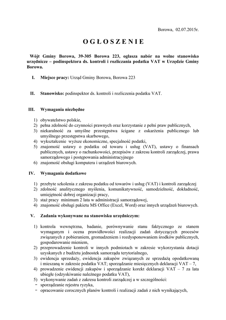 Borowa, 02.07.2015r. OGŁOSZENIE Wójt Gminy Borowa, 39-305 Borowa 223, ogłasza nabór na wolne stanowisko urzędnicze – podinspektora ds. kontroli i rozliczania podatku VAT w Urzędzie Gminy Borowa. I. II. III. Miejsce pracy: Urząd Gminy Borowa, Borowa 223 Stanowisko: podinspektor ds. kontroli i rozliczenia podatku VAT. Wymagania niezbędne 1) obywatelstwo polskie, 2) pełna zdolność do czynności prawnych oraz korzystanie z pełni praw publicznych, 3) niekaralność za umyślne przestępstwa ścigane z oskarżenia publicznego lub umyślnego przestępstwa skarbowego, 4) wykształcenie wyższe ekonomiczne, specjalność podatki, 5) znajomość ustawy o podatku od towaru i usług (VAT), ustawy o finansach publicznych, ustawy o rachunkowości, przepisów z zakresu kontroli zarządczej, prawa samorządowego i postępowania administracyjnego 6) znajomość obsługi komputera i urządzeń biurowych. IV. Wymagania dodatkowe 1) przebyte szkolenia z zakresu podatku od towarów i usług (VAT) i kontroli zarządczej 2) zdolność analitycznego myślenia, komunikatywność, samodzielność, dokładność, umiejętność dobrej organizacji pracy, 3) staż pracy minimum 2 lata w administracji samorządowej, 4) znajomość obsługi pakietu MS Office (Excel, Word) oraz innych urządzeń biurowych. V. Zadania wykonywane na stanowisku urzędniczym: 1) kontrola wewnętrzna, badanie, porównywanie stanu faktycznego ze stanem wymaganym i ocena prawidłowości realizacji zadań dotyczących procesów związanych z pobieraniem, gromadzeniem i rozdysponowaniem środków publicznych, gospodarowanie mieniem, 2) przeprowadzenie kontroli w innych podmiotach w zakresie wykorzystania dotacji uzyskanych z budżetu jednostek samorządu terytorialnego, 3) ewidencja sprzedaży, ewidencja zakupów związanych ze sprzedażą opodatkowaną i mieszaną w zakresie podatku VAT; sporządzanie miesięcznych deklaracji VAT – 7, 4) prowadzenie ewidencji zakupów i sporządzanie korekt deklaracji VAT – 7 za lata ubiegłe (odzyskiwanie należnego podatku VAT), 5) wykonywanie zadań z zakresu kontroli zarządczej a w szczególności: − sporządzanie rejestru ryzyka, − opracowanie corocznych planów kontroli i realizacji zadań z nich wynikających, − przeprowadzanie kontroli sprawozdań finansowych, wydatków publicznych oraz zgodność działalności Urzędu z przepisami prawa oraz procedurami wewnętrznymi, − prowadzenie monitoringu funkcjonowania kontroli zarządczej w jednostkach organizacyjnych gminy, − przygotowywanie zaleceń i wniosków pokontrolnych, − sprawdzanie realizacji zaleceń pokontrolnych, − przedkładanie Wójtowi sprawozdań z funkcjonowania kontroli zarządczej w Urzędzie. VI. VII. VIII. Informacja o warunkach pracy na stanowisku: praca w biurze oraz w terenie. W lipcu 2015 r. wskaźnik zatrudnienia osób niepełnosprawnych w Urzędzie Gminy Borowa w rozumieniu przepisów o rehabilitacji zawodowej i społecznej oraz zatrudnianiu osób niepełnosprawnych jest wyższy niż 6 %. Wymagane dokumenty: 1) list motywacyjny, 2) kwestionariusz osobowy (cv), 3) kserokopie dyplomów oraz innych dokumentów stwierdzających posiadane wykształcenie, kwalifikacje oraz staż pracy, 4) oświadczenie kandydata o braku przeciwwskazań zdrowotnych do zatrudnienia, 5) oświadczenie kandydata o niekaralności za przestępstwa popełnione umyślnie (po wygraniu konkursu potwierdzone przez Rejestr Karny „Zapytanie o udzielenie informacji o osobie”). Wymagane dokumenty aplikacyjne należy składać w siedzibie Urzędu Gminy Borowa pk nr 3 I p. w terminie do 13.07.2015r. Informacja o wynikach naboru będzie umieszczona na stronie Biuletynu Informacji Publicznej oraz na tablicy Informacyjnej Urzędu Gminy Borowa, 39-305 Borowa 223. Dokumenty, które wpłyną do Urzędu Gminy po wyżej określonym terminie rozpatrywane. nie będą Wymagane dokumenty aplikacyjne: list motywacyjny, szczegółowe CV (z uwzględnieniem dokładnego przebiegu kariery zawodowej) powinny być opatrzone klauzulą: „Wyrażam zgodę na przetwarzanie moich danych osobowych zawartych w ofercie procesu rekrutacji zgodnie z Ustawą z dnia 29 sierpnia 1997r. o ochronie danych osobowych ( tj. Dz. U. z 2002 r. Nr 101, poz.926 z póź. zm.)”. Ogłaszający: Wójt Gminy Borowa Władysław Błażejowski