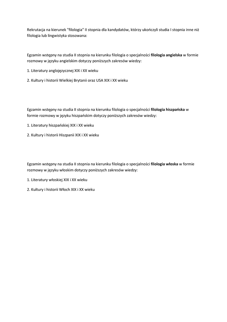 Rekrutacja na kierunek "filologia" II stopnia dla kandydatów, którzy ukończyli studia I stopnia inne niż filologia lub lingwistyka stosowana: Egzamin wstępny na studia II stopnia na kierunku filologia o specjalności filologia angielska w formie rozmowy w języku angielskim dotyczy poniższych zakresów wiedzy: 1. Literatury anglojęzycznej XIX i XX wieku 2. Kultury i historii Wielkiej Brytanii oraz USA XIX i XX wieku Egzamin wstępny na studia II stopnia na kierunku filologia o specjalności filologia hiszpańska w formie rozmowy w języku hiszpańskim dotyczy poniższych zakresów wiedzy: 1. Literatury hiszpańskiej XIX i XX wieku 2. Kultury i historii Hiszpanii XIX i XX wieku Egzamin wstępny na studia II stopnia na kierunku filologia o specjalności filologia włoska w formie rozmowy w języku włoskim dotyczy poniższych zakresów wiedzy: 1. Literatury włoskiej XIX i XX wieku 2. Kultury i historii Włoch XIX i XX wieku