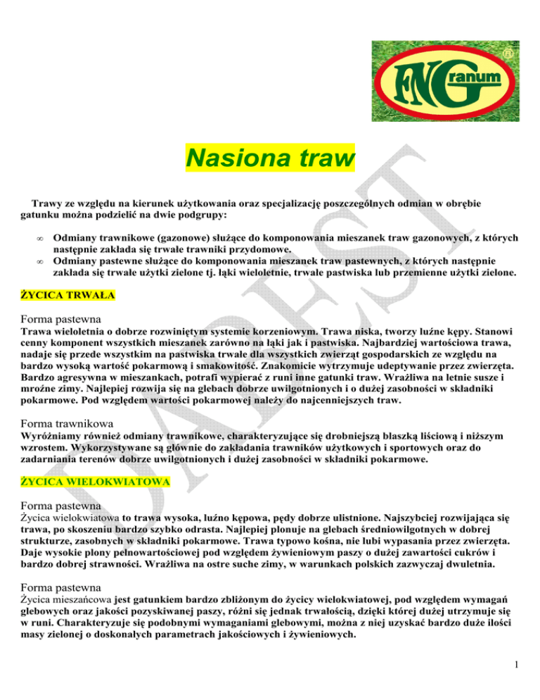 Nasiona traw Trawy ze względu na kierunek użytkowania oraz specjalizację poszczególnych odmian w obrębie gatunku można podzielić na dwie podgrupy: • • Odmiany trawnikowe (gazonowe) służące do komponowania mieszanek traw gazonowych, z których następnie zakłada się trwałe trawniki przydomowe. Odmiany pastewne służące do komponowania mieszanek traw pastewnych, z których następnie zakłada się trwałe użytki zielone tj. łąki wieloletnie, trwałe pastwiska lub przemienne użytki zielone. ŻYCICA TRWAŁA Forma pastewna Trawa wieloletnia o dobrze rozwiniętym systemie korzeniowym. Trawa niska, tworzy luźne kępy. Stanowi cenny komponent wszystkich mieszanek zarówno na łąki jak i pastwiska. Najbardziej wartościowa trawa, nadaje się przede wszystkim na pastwiska trwałe dla wszystkich zwierząt gospodarskich ze względu na bardzo wysoką wartość pokarmową i smakowitość. Znakomicie wytrzymuje udeptywanie przez zwierzęta. Bardzo agresywna w mieszankach, potrafi wypierać z runi inne gatunki traw. Wrażliwa na letnie susze i mroźne zimy. Najlepiej rozwija się na glebach dobrze uwilgotnionych i o dużej zasobności w składniki pokarmowe. Pod względem wartości pokarmowej należy do najcenniejszych traw. Forma trawnikowa Wyróżniamy również odmiany trawnikowe, charakteryzujące się drobniejszą blaszką liściową i niższym wzrostem. Wykorzystywane są głównie do zakładania trawników użytkowych i sportowych oraz do zadarniania terenów dobrze uwilgotnionych i dużej zasobności w składniki pokarmowe. ŻYCICA WIELOKWIATOWA Forma pastewna Życica wielokwiatowa to trawa wysoka, luźno kępowa, pędy dobrze ulistnione. Najszybciej rozwijająca się trawa, po skoszeniu bardzo szybko odrasta. Najlepiej plonuje na glebach średniowilgotnych w dobrej strukturze, zasobnych w składniki pokarmowe. Trawa typowo kośna, nie lubi wypasania przez zwierzęta. Daje wysokie plony pełnowartościowej pod względem żywieniowym paszy o dużej zawartości cukrów i bardzo dobrej strawności. Wrażliwa na ostre suche zimy, w warunkach polskich zazwyczaj dwuletnia. Forma pastewna Życica mieszańcowa jest gatunkiem bardzo zbliżonym do życicy wielokwiatowej, pod względem wymagań glebowych oraz jakości pozyskiwanej paszy, różni się jednak trwałością, dzięki której dużej utrzymuje się w runi. Charakteryzuje się podobnymi wymaganiami glebowymi, można z niej uzyskać bardzo duże ilości masy zielonej o doskonałych parametrach jakościowych i żywieniowych. 1 ŻYCICA WESTERWOLDZKA Forma pastewna Jednoroczna forma jara życicy wielokwiatowej. Bardzo szybki wzrost i rozwój, ale słaba krzewistość. Wymagania glebowe zbliżone do życicy wielokwiatowej (gleby średniowilgotne o dobrej strukturze, zasobne w składniki pokarmowe). Nadaje się do jednorocznych mieszanek o użytkowaniu kośnopastwiskowym. KOSTRZEWA CZERWONA Forma pastewna Gatunek wieloletni, zaliczany do traw niskich. Wytwarza silny system korzeniowy. Gatunek kostrzewa czerwona dzieli się na trzy podgatunki: kępową, luźnokępową i rozłogową (różnią się one między sobą sposobem tworzenia darni). Posiada niskie wymagania glebowe i wodne, dlatego stosowana jest jako podstawowy komponent mieszanek na gleby słabsze oraz okresowo suche. Nadaje się na pastwiska, ponieważ jest odporna na udeptywanie i przygryzanie przez zwierzęta. Dość szybko odrasta po każdym wypasie. Cechuje się dużą zimotrwałością, toleruje długotrwałe zaleganie okrywy lodowej. Forma trawnikowa Wyróżniamy również odmiany trawnikowe, charakteryzujące się drobniejszą blaszką liściową i niższym wzrostem. Wykorzystywane są głównie do zakładania trawników ozdobnych, wolno rosnących zakładanych na glebach suchszych. Jest doskonała trawą darniotwórczą, nadaje się również do zadarniania skarp, poboczy dróg i autostrad. KOSTRZEWA ŁĄKOWA Forma pastewna Trawa wieloletnia, wysoka, luźno kępowa, posiada silnie rozwinięty system korzeniowy, sięgający nawet do 1 metra. Jest cennym komponentem wszystkich mieszanek łąkowych i pastwiskowych, odznacza się dobrą smakowitością i strawnością. Dobrze znosi udeptywanie przez zwierzęta i dość szybko odrasta. Szybko się rozwija po siewie, ale nie jest gatunkiem dominującym, nie wypiera innych gatunków w runi. Odznacza się dużą tolerancją na warunki glebowe i sposoby użytkowania. Przydatna do renowacji trwałych użytków zielonych metodą podsiewu. Jest gatunkiem nitrofilnym, pozytywnie reaguje na nawożenie azotem, zwiększając plon masy zielonej. KOSTRZEWA TRZCINOWA Forma pastewna Trawa wieloletnia, posiada bardzo silnie rozwinięty system korzeniowy, sięgający do 1,5 metra w głąb gleby. Długi okres wegetacji, gatunek odporny na wszelkie stresy np. termiczne, wilgotnościowe, nadaje się na słabsze gleby, nadaje się również na tereny okresowo podtapiane (gleby torfowe i murszowe). Bardzo szybko odrasta po skoszeniu. Bardzo agresywna, potrafi wypieraç z runi inne trawy. Znajduje zastosowanie jako komponent w mieszankach na łąki kośne, niekiedy też na pastwiska, ponieważ wykazuje dość dużą odporność na udeptywanie przez zwierzęta. Wyróżnia się bardzo wysokimi plonami masy zielonej, ale o średniej wartości pokarmowej (zawiera dość dużo krzemionki). Forma trawnikowa Wyróżniamy również odmiany trawnikowe, charakteryzujące się drobniejszą blaszką liściową i niższym wzrostem. Wykorzystywane są głównie do zakładania trawników użytkowych narażonych na uszkodzenia mechaniczne a także do zadarniania skarp i poboczy szlaków komunikacyjnych, terenów zlokalizowanych w trudnych warunkach siedliskowych. 2 FESTULOLIUM Forma pastewna Mieszaniec międzygatunkowy pomiędzy kostrzewą łąkową i życicą wielokwiatową. Wykazuje właściwości pośrednie pomiędzy gatunkami, z których powstał. Trawa wieloletnia. Wykorzystywana jest jako komponent do mieszanek pastewnych, ze względu na wysoki p
