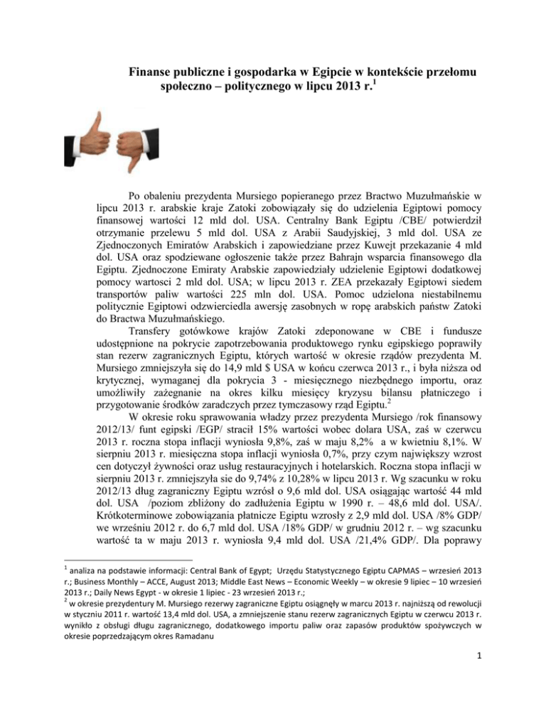 Finanse publiczne i gospodarka w Egipcie w kontekście przełomu społeczno – politycznego w lipcu 2013 r.1 Po obaleniu prezydenta Mursiego popieranego przez Bractwo Muzułmańskie w lipcu 2013 r. arabskie kraje Zatoki zobowiązały się do udzielenia Egiptowi pomocy finansowej wartości 12 mld dol. USA. Centralny Bank Egiptu /CBE/ potwierdził otrzymanie przelewu 5 mld dol. USA z Arabii Saudyjskiej, 3 mld dol. USA ze Zjednoczonych Emiratów Arabskich i zapowiedziane przez Kuwejt przekazanie 4 mld dol. USA oraz spodziewane ogłoszenie także przez Bahrajn wsparcia finansowego dla Egiptu. Zjednoczone Emiraty Arabskie zapowiedziały udzielenie Egiptowi dodatkowej pomocy wartosci 2 mld dol. USA; w lipcu 2013 r. ZEA przekazały Egiptowi siedem transportów paliw wartości 225 mln dol. USA. Pomoc udzielona niestabilnemu politycznie Egiptowi odzwierciedla awersję zasobnych w ropę arabskich państw Zatoki do Bractwa Muzułmańskiego. Transfery gotówkowe krajów Zatoki zdeponowane w CBE i fundusze udostępnione na pokrycie zapotrzebowania produktowego rynku egipskiego poprawiły stan rezerw zagranicznych Egiptu, których wartość w okresie rządów prezydenta M. Mursiego zmniejszyła się do 14,9 mld $ USA w końcu czerwca 2013 r., i była niższa od krytycznej, wymaganej dla pokrycia 3 - miesięcznego niezbędnego importu, oraz umożliwiły zażegnanie na okres kilku miesięcy kryzysu bilansu płatniczego i przygotowanie środków zaradczych przez tymczasowy rząd Egiptu.2 W okresie roku sprawowania władzy przez prezydenta Mursiego /rok finansowy 2012/13/ funt egipski /EGP/ stracił 15% wartości wobec dolara USA, zaś w czerwcu 2013 r. roczna stopa inflacji wyniosła 9,8%, zaś w maju 8,2% a w kwietniu 8,1%. W sierpniu 2013 r. miesięczna stopa inflacji wyniosła 0,7%, przy czym największy wzrost cen dotyczył żywności oraz usług restauracyjnych i hotelarskich. Roczna stopa inflacji w sierpniu 2013 r. zmniejszyła sie do 9,74% z 10,28% w lipcu 2013 r. Wg szacunku w roku 2012/13 dług zagraniczny Egiptu wzrósł o 9,6 mld dol. USA osiągając wartość 44 mld dol. USA /poziom zbliżony do zadłużenia Egiptu w 1990 r. – 48,6 mld dol. USA/. Krótkoterminowe zobowiązania płatnicze Egiptu wzrosły z 2,9 mld dol. USA /8% GDP/ we wrześniu 2012 r. do 6,7 mld dol. USA /18% GDP/ w grudniu 2012 r. – wg szacunku wartość ta w maju 2013 r. wyniosła 9,4 mld dol. USA /21,4% GDP/. Dla poprawy 1 analiza na podstawie informacji: Central Bank of Egypt; Urzędu Statystycznego Egiptu CAPMAS – wrzesień 2013 r.; Business Monthly – ACCE, August 2013; Middle East News – Economic Weekly – w okresie 9 lipiec – 10 wrzesień 2013 r.; Daily News Egypt - w okresie 1 lipiec - 23 wrzesień 2013 r.; 2 w okresie prezydentury M. Mursiego rezerwy zagraniczne Egiptu osiągnęły w marcu 2013 r. najniższą od rewolucji w styczniu 2011 r. wartość 13,4 mld dol. USA, a zmniejszenie stanu rezerw zagranicznych Egiptu w czerwcu 2013 r. wynikło z obsługi długu zagranicznego, dodatkowego importu paliw oraz zapasów produktów spożywczych w okresie poprzedzającym okres Ramadanu 1 sytuacji finansowej rząd prezydenta M. Mursiego emitował obligacje w dwóch transzach, których pierwsza została wykupiona przez Katar - z 3 mld dol. USA depozytu gotówkowego przekazanego CBE przez Katar 1 mld dol. USA przekonwertowano na 3 letnie egipskie obligacje skarbowe. Od czasu objęcia władzy przez Bractwo Muzułmańskie największym zagranicznym płatnikiem w Egipcie stał się Katar. Wzrost krótkoterminowych zobowiązań Egiptu wynikł z zakupu obligacji przez Katar i stanu depozytów bankowych. Po przejęciu władzy po 3 lipca br. nowa administracja Egiptu odstąpiła od realizacji drugiej transzy obligacji i zwróciła Katarowi pozostałą, 2 mld dol. USA część depozytu gotówkowego w CBE.3 W okresie trzech kwartałów roku finansowego 2012/13 dług publiczny w Egipcie wzrósł do 92% GDP osiągając 1,46 tn EGP, a bezrobocie wyniosło 13,2%. Zasadniczą cześć długu publicznego – ok. 83% - stanowią państwowe obligacje skarbowe o wartości ok.1,21 tn EGP. W podanym okresie roku finansowego 2012/13 deficyt budżetowy wyniósł 238,1 mld EGP stanowiąc 13,8% GDP Egiptu i był o 43,9% większy niż w tym samym okresie roku 2011/12. Zwiększony deficyt budżetowy wynika ze wzrostu wydatków rządowych o 23,7% - do 582,7 mld EGP, przeznaczonych w 59% na program subsydiowania oraz obsługę długu publicznego. Wartość programu subsydiowania została zwiększona o 46,8 mld EGP /wzrost o 31% w stosunku do roku 2011/12/ - w tym koszt subsydiowania paliw wyniósł 120 mld EGP /wzrost o 25,6%/ i pozostałych surowców rynkowych – 32,5 mld EGP /wzrost o 5,6%/. Wartość obsługi zadłużenia krajowego i zagranicznego pokryta z budżetu państwa w podanym okresie roku finansowego 2012/13 wyniosła 147 mld EGP /wzrost o 42,5 mld EGP/, a wypłata podwyższonych wynagrodzeń miała wartość 141 mld EGP /wzrost o 14,8%/. Wpływy do budżetu w tym okresie osiągnęły wartość 344,6 mld EGP – wzrost o 41 mld EGP z tytułu 21% wzrostu wpływów podatkowych oraz zwiększenia o 3% pozostałych wpływów. GDP wzrósł w okresie trzech kwartałów roku finansowego 2012/13 o 2,3%, zaś ciężar deficytu budżetowego ponoszony jest przede wszystkim przez egipski system bankowy. W omawianym okresie roku 2012/13 eksport towarowy Egiptu wzrósł o 2,9% , zaś import do Egiptu o 1,4%, powodując zmniejszenie deficytu w egipskim handlu zagranicznym o 29,7%. W okresie rządów prezydenta M. Mursiego kurs czarnorynkowy dolara USA był znacznie wyższy od oficjalnego - w kwietniu 2013 r. wynosił 7,85 EGP. Oficjalna wartość EGP 3 lipca br. – w dniu obalenia prezydenta M. Mursiego - wynosiła 6,98 – 6,99 EGP/1$ USA. Okres nasilonego protestu społecznego sprzyjał utrzymaniu czarnorynkowej wartości dolara USA w lipcu br. na poziomie ok. 7,25 – 7,35 EGP przy oficjalnym kursie wymiany na najwyższym w tym okresie pozi