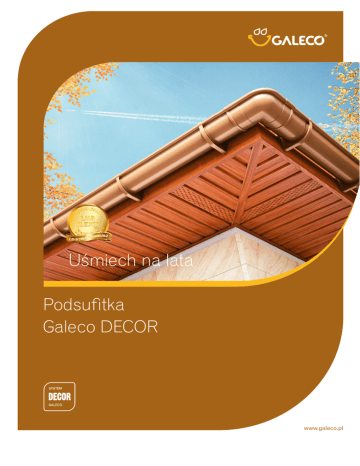 Uśmiech na lata Podsufitka Galeco DECOR www.galeco.pl Podsufitka Galeco DECOR Budując dom myślisz nie tylko o solidnej konstrukcji, ale także o walorach estetycznych budynku. Dlatego właśnie opracowaliśmy rozwiązanie dekoracyjnego wykończenia okapu dachu na zewnątrz budynku za pomocą podbitki dachowej typu siding. Jej zastosowanie pozwala w szybki i prosty sposób poprawić estetykę budynku i zabezpieczyć konstrukcję dachu. Podbitka dachowa Galeco DECOR produkowana jest z najwyższej jakości tworzywa PVC, dzięki czemu panele podbitki odporne są na działanie warunków atmosferycznych i nie wymagają konserwacji, a lekkość elementów umożliwia montaż nawet na delikatnych konstrukcjach. Dla Klientów bardziej wymagających i dbających o walory estetyczne budynku oferujemy również okucie deski czołowej dachu w kolorach podsufitki dachowej. Takie rozwiązanie pozwoli uzyskać spójną i ciekawą kompozycję nowoczesnego domu. Galeco DECOR to marka godna zaufania, która zapewni Tobie i Twojej rodzinie… uśmiech na lata. Zalety Estetyka wykonania Dzięki kompletnemu systemowi listew montażowych podsufitkę można stosować do każdego rodzaju okapu dachowego. Nie wymaga konserwacji W odróżnieniu od drewna i metalu materiał PVC nie wymaga konserwacji. Łatwość montażu Optymalna konstrukcja elementów podsufitki umożliwia prosty i szybki montaż. Odporność na warunki atmosferyczne Dzięki zastosowaniu tworzywa PVC najwyższej jakości podsufitka zachowuje swoje parametry niezależnie od warunków pogodowych. Elastyczność i odporność mechaniczna Podczas montażu dzięki zastosowaniu optymalnej technologii produkcyjnej. Możliwość składowania na zewnątrz Poprzez zastosowanie ochronnych opakowań zbiorczych. Składowanie i montaż Elementy podsufitki powinny być zawsze składowane w oryginalnych opakowaniach zbiorczych (kartony i worki foliowe) pod zadaszeniem, podparte na całej długości, a wysokość składowania nie powinna przekraczać 1 m. Panele systemu montuje się w kierunku prostopadłym do ściany budynku pod krokiew, do drewnianych łat, które powinny być suche i zaimpregnowane. Listwę montażową typu „J” należy montować do wypoziomowanych łat na całym obwodzie zabudowanego okapu za pomocą gwoździ nierdzewnych, które wbijamy prostopadle do łaty w środek otworu montażowego. Docięte na odpowiednią szerokość panele podsufitki wsuwamy w zamontowane listwy typu „J” w kierunku prostopadłym do elewacji. Kolejny panel należy wsunąć i zaczepić zamkiem o zamek poprzedniego elementu. Zaleca się stosowanie co trzeciego panelu z perforacją w celu zapewnienia optymalnej wentylacji dachu i okapu. Przykłady wykończenia narożników okapu listwa typu „H” Listwa Listwa Listwa typu „J” typu „H” typu „H” Listwa Podsufitka typu „J” perforowana Podsufitka perforowana Podsufitka Podsufitka pełna pełna Podsufitka Galeco DECOR Elementy systemu: PODSUFITKA PEŁNA PODSUFITKA WENTYLOWANA LISTWA MONTAŻOWA TYPU „J” LISTWA MONTAŻOWA TYPU „H” NAROŻNIKI ZEWNĘTRZNE Element Wymiar podsufitka pełna 295 x 4000 mm (1 panel = 1,18 m²) podsufitka wentylowana 295 x 4000 mm (1 panel = 1,18 m²) listwa montażowa typu „J” 4000 mm listwa montażowa typu „H” 4000 mm narożnik zewnętrzny 4000 mm Akcesoria Galeco DECOR Nowość Okucie deski czołowej ZŁOTY DĄB ORZECHOWY Okucie deski czołowej to obróbka blacharska o wymiarach 370 mm x 2000 mm wykonana z blachy ocynkowanej o grubości 0,5 mm. Pokryta jest drewnopodobną folią Renolit w kolorze podsufitki Galeco DECOR. Jej dolna część wyprofilowana została na kształt listwy „J” dostępnej w systemie Galeco DECOR, co umożliwia łatwy montaż podsufitki oraz spójne i estetyczne wykończenie okapu. Maskownica podsufitkowa Maskownica podsufitkowa to element dostępny w systemie z rynną kwadratową Galeco STAL 2 służący do zakrycia całego poziomu rynnowego poprzez zatrzaśniecie go w zamkach haków doczołowych. Zamontowanie maskownicy podsufitkowej umożliwia wykończenie okapu dachu podsufitką dachową Galeco DECOR, gdyż dolna część maskownicy została wyprofilowana na kształt listwy „J”, co umożliwia szybki i łatwy montaż systemu. Po przejściu rurą spustową przez panel podsufitki pozostałe elementy pionu spustowego instalowane są tak samo jak elementy innych systemów rynnowych. Galeco Rainwater Technology Jesteśmy projektantem, producentem i dystrybutorem profesjonalnych systemów odprowadzania wody. Kilkunastoletnie doświadczenie oraz obecność na europejskich rynkach daje nam gwarancję dostarczania swoim klientom rozwiązań przełomowych, innowacyjnych i najwyższej jakości. Z ofertą stale docieramy na nowe rynki, oferując systemy wysoko cenione przez wymagających odbiorców. Galeco jest jedną z najlepiej rozpoznawalnych marek w swoim sektorze i gwarancją trafnego wyboru. Jesteśmy wiarygodnym partnerem biznesowym, któremu zaufali krajowi i zagraniczni inwestorzy. Zapewniamy nowatorskie technologie, innowacyjne rozwiązania nowej generacji dbałość o najdrobniejszy szczegół. Witamy w Galeco Rainwater Technology. Galeco Sp. z o.o., ul. Uśmiechu 1, 32-083 Balice www.galeco.pl, www.bezokapowy.pl, e-mail. [email protected] infolinia: 801 623 626* Koszt połączenia jak za połączenie lokalne. Polub nas na Facebooku PAŃSTWA UWAGI ODNOŚNIE PRODUKTÓW PROSIMY KIEROWAĆ NA ADRES MAILOWY: [email protected] Galeco Sp. z o.o. ul. Uśmiechu 1, 32-083 Balice k/Krakowa, Sąd Rejonowy dla Krakowa-Śródmieścia w Krakowie, XI Wydział Gospodarczy Krajowego Rejestru Sądowego, Numer KRS 0000102185, NIP 679-25-94-371 Niniejsza ulotka nie jest ofertą w rozumieniu kodeksu handlowego. Rzeczywista kolorystyka produktów może odbiegać od zaprezentowanej w ulotce. Zaufaj bezpiecznym rozwiązaniom. pieczątka dystrybutora