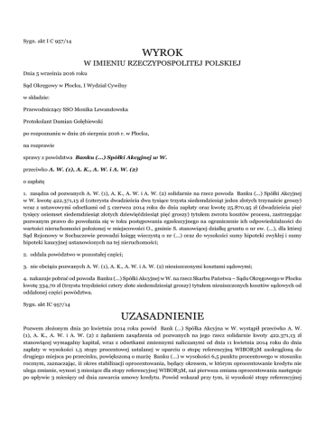 Sygn. akt I C 957/14 WYROK W IMIENIU RZECZYPOSPOLITEJ POLSKIEJ Dnia 5 września 2016 roku Sąd Okręgowy w Płocku, I Wydział Cywilny w składzie: Przewodniczący SSO Monika Lewandowska Protokolant Damian Gołębiewski po rozpoznaniu w dniu 26 sierpnia 2016 r. w Płocku, na rozprawie sprawy z powództwa Banku (...) Spółki Akcyjnej w W. przeciwko A. W. (1), A. K., A. W. i A. W. (2) o zapłatę 1. zasądza od pozwanych A. W. (1), A. K., A. W. i A. W. (2) solidarnie na rzecz powoda Banku (...) Spółki Akcyjnej w W. kwotę 422.371,13 zł (czterysta dwadzieścia dwa tysiące trzysta siedemdziesiąt jeden złotych trzynaście groszy) wraz z ustawowymi odsetkami od 5 czerwca 2014 roku do dnia zapłaty oraz kwotę 25.870,95 zł (dwadzieścia pięć tysięcy osiemset siedemdziesiąt złotych dziewięćdziesiąt pięć groszy) tytułem zwrotu kosztów procesu, zastrzegając pozwanym prawo do powołania się w toku postępowania egzekucyjnego na ograniczenie ich odpowiedzialności do wartości nieruchomości położonej w miejscowości O., gminie S. stanowiącej działkę gruntu o nr ew. (...), dla której Sąd Rejonowy w Sochaczewie prowadzi księgę wieczystą o nr (...) oraz do wysokości sumy hipoteki zwykłej i sumy hipoteki kaucyjnej ustanowionych na tej nieruchomości; 2. oddala powództwo w pozostałej części; 3. nie obciąża pozwanych A. W. (1), A. K., A. W. i A. W. (2) nieuiszczonymi kosztami sądowymi; 4. nakazuje pobrać od powoda Banku (...) Spółki Akcyjnej w W. na rzecz Skarbu Państwa – Sądu Okręgowego w Płocku kwotę 334,70 zł (trzysta trzydzieści cztery złote siedemdziesiąt groszy) tytułem nieuiszczonych kosztów sądowych od oddalonej części powództwa. Sygn. akt IC 957/14 UZASADNIENIE Pozwem złożonym dnia 30 kwietnia 2014 roku powód Bank (...) Spółka Akcyjna w W. wystąpił przeciwko A. W. (1), A. K., A. W. i A. W. (2) z żądaniem zasądzenia od pozwanych na jego rzecz solidarnie kwoty 422.371,13 zł stanowiącej wymagalny kapitał, wraz z odsetkami zmiennymi naliczanymi od dnia 11 kwietnia 2014 roku do dnia zapłaty w wysokości 1,5 stopy procentowej ustalanej w oparciu o stopę referencyjną WIBOR3M zaokrągloną do drugiego miejsca po przecinku, powiększoną o marżę Banku (...) w wysokości 6,5 punktu procentowego w stosunku rocznym, zaznaczając, iż okres stabilizacji oprocentowania, będący okresem, w którym oprocentowanie kredytu nie ulega zmianie, wynosi 3 miesiące dla stopy referencyjnej WIBOR3M, zaś pierwsza zmiana oprocentowania następuje po upływie 3 miesięcy od dnia zawarcia umowy kredytu. Powód wskazał przy tym, iż wysokość stopy referencyjnej WIBOR3M w każdym okresie stabilizacji ustalana jest według wysokości tej stopy referencyjnej sprzed dwóch dni roboczych przed pierwszym dniem każdego okresu stabilizacji oprocentowania. Nadto powód zażądał zasądzenia od pozwanych solidarnie na jego rzecz kwoty 86.240,55 zł stanowiącej odsetki wymagalne, naliczane od wyżej wskazanej kwoty kapitału, od dnia wymagalności roszczenia do dnia 10 kwietnia 2014 roku. Powód zaznaczył, iż żąda zasądzenia od pozwanych wskazanych kwot z zastrzeżeniem im prawa powoływania się na ograniczenie ich odpowiedzialności do nieruchomości położonej w miejscowości O., stanowiącej działkę gruntu o nr ew. (...), dla której Sąd Rejonowy w Sochaczewie prowadzi księgę wieczystą o nr (...). Powód wystąpił także o zasądzenie od pozwanych solidarnie na jego rzecz kosztów procesu, w tym kosztów zastępstwa procesowego według norm przepisanych. Uzasadniając żądanie pozwu powód wskazał, iż w dniu 22 lutego 2010 roku udzielił T. W. pożyczki. Zabezpieczeniem wierzytelności banku była hipoteka zwykła w wysokości 500.000 zł oraz hipoteka kaucyjna do kwoty 250.000 zł ustanowione na opisanej wyżej nieruchomości. Hipoteki zostały ustanowione przez ówczesnego właściciela nieruchomości A. W. (3). W związku z zaległościami w spłacie pożyczki, bank dokonał wypowiedzenia umowy w dniu 8 stycznia 2013 roku. Dłużnik hipoteczny A. W. (3) zmarł w dniu 23 listopada 2010 roku. Spadek po nim odziedziczyli: jego żona A. W. (1) oraz dzieci: A. W. (4), A. W. (5) i A. W. (2) po ¼ części. Spadek został nabyty z dobrodziejstwem inwentarza. Powód wskazał, iż skierował do dłużnika A. W. (1) wezwanie do zapłaty, jednakże pozwani nie uiścili należnych kwot. W odpowiedzi na pozew z dnia 18 czerwca 2014 roku pozwani A. W. (1), A. K., A. W. (5) i A. W. (2) wnieśli o oddalenie powództwa w całości i zasądzenie od powoda na ich rzecz kosztów procesu wraz z kosztami zastępstwa procesowego według norm przepisanych. Pozwani podnieśli zarzut nieważności oświadczenia woli A. W. (3) w przedmiocie obciążenia jego nieruchomości hipotekami na rzecz powodowego banku wskazując, iż znajdował się on w stanie wyłączającym świadome albo swobodne powzięcie decyzji i wyrażenie woli. Pozwani wyjaśnili, iż A. W. (3) cierpiał na uzależnienie od alkoholu. Stan ten z każdym rokiem pogłębiał się, aż do końca 2010 roku, kiedy to po kilkutygodniowym ciągu alkoholowym, z rozpoznaniem majaczenia, trafił on na oddział psychiatryczny, a następnie zmarł. Pozwani podnieśli, iż już na około 2 lata przed śmiercią występował u niego stan skrajnie ciężkiego alkoholizmu, notorycznie znajdował się w stanie uniemożliwiającym kontakt z otoczeniem, zachowywał się agresywnie w stosunku do najbliższych, podejmował próby samobójcze. Pozwani wskazali, iż z uwagi na stan A. W. (3) w chwili składania oświadczenia o ustanowieniu hipoteki, zachodzi bezwzględna nieważność przedmiotowego oświadczenia. Pozwani stwierdzili nadto, iż nie uczestniczyli w czynnościach związanych z zaciągnięciem kredytu przez T. W. i ustanowieniem zabezpieczenia. Nie mają też wiedzy, jaka część kredytu została uregulowana. Zakwestionowali w związku z tym istnienie wierzytelności powodowego banku tak co do z