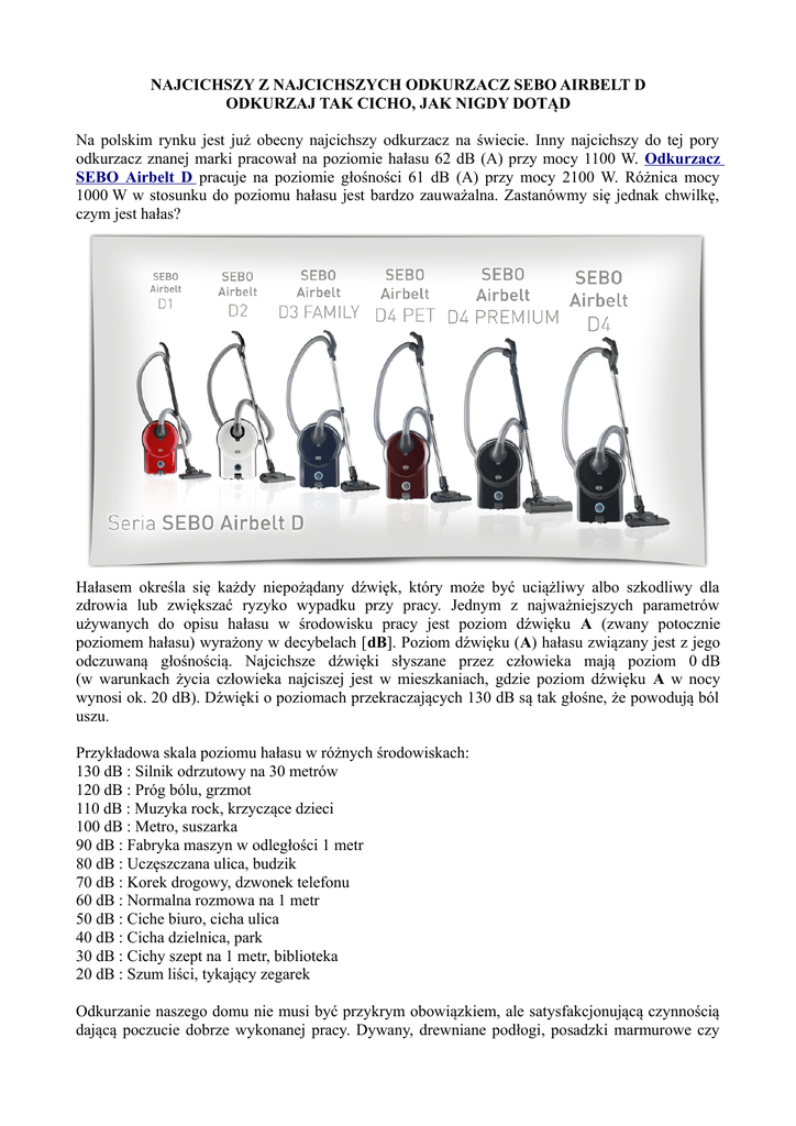 NAJCICHSZY Z NAJCICHSZYCH ODKURZACZ SEBO AIRBELT D ODKURZAJ TAK CICHO, JAK NIGDY DOTĄD Na polskim rynku jest już obecny najcichszy odkurzacz na świecie. Inny najcichszy do tej pory odkurzacz znanej marki pracował na poziomie hałasu 62 dB (A) przy mocy 1100 W. Odkurzacz SEBO Airbelt D pracuje na poziomie głośności 61 dB (A) przy mocy 2100 W. Różnica mocy 1000 W w stosunku do poziomu hałasu jest bardzo zauważalna. Zastanówmy się jednak chwilkę, czym jest hałas? Hałasem określa się każdy niepożądany dźwięk, który może być uciążliwy albo szkodliwy dla zdrowia lub zwiększać ryzyko wypadku przy pracy. Jednym z najważniejszych parametrów używanych do opisu hałasu w środowisku pracy jest poziom dźwięku A (zwany potocznie poziomem hałasu) wyrażony w decybelach [dB]. Poziom dźwięku (A) hałasu związany jest z jego odczuwaną głośnością. Najcichsze dźwięki słyszane przez człowieka mają poziom 0 dB (w warunkach życia człowieka najciszej jest w mieszkaniach, gdzie poziom dźwięku A w nocy wynosi ok. 20 dB). Dźwięki o poziomach przekraczających 130 dB są tak głośne, że powodują ból uszu. Przykładowa skala poziomu hałasu w różnych środowiskach: 130 dB : Silnik odrzutowy na 30 metrów 120 dB : Próg bólu, grzmot 110 dB : Muzyka rock, krzyczące dzieci 100 dB : Metro, suszarka 90 dB : Fabryka maszyn w odległości 1 metr 80 dB : Uczęszczana ulica, budzik 70 dB : Korek drogowy, dzwonek telefonu 60 dB : Normalna rozmowa na 1 metr 50 dB : Ciche biuro, cicha ulica 40 dB : Cicha dzielnica, park 30 dB : Cichy szept na 1 metr, biblioteka 20 dB : Szum liści, tykający zegarek Odkurzanie naszego domu nie musi być przykrym obowiązkiem, ale satysfakcjonującą czynnością dającą poczucie dobrze wykonanej pracy. Dywany, drewniane podłogi, posadzki marmurowe czy gresowe, wszystkie te powierzchnie wymagają konserwacji. Kiedy jednak rozpoczynamy sprzątanie bardzo często po krótkiej chwili mamy dosyć pracy z hałaśliwym urządzeniem. Pies wystraszony dźwiękiem zaczyna się dziwnie zachowywać i wyć, kotek chowa się nerwowo pod sofą czy łóżkiem, dziecko pogłaśnia telewizor. Teraz dopiero jest głośno. Czy nie wygląda to znajomo? Jak sprzątać w takich warunkach? Najzwyczajniej się nie da. Pomińmy fakt, że urządzenie dodatkowo zakurza mieszkanie, ponieważ system odprowadzania powietrza jest niedoskonały. Wszystkie te mankamenty eliminuje jedno urządzenie – odkurzacz SEBO AIRBELT D. Firma SEBO jest od wielu lat wiodącym producentem urządzeń czyszczących na świecie. Odkurzacze z logo tej firmy możemy spotkać zarówno na „czerwonym dywanie”, jak i w domu sąsiada. Biały Dom, Buckingham Palace, Bundestag czy wiodące hotele świata od Tokio po Paryż to tylko kilka miejsc, gdzie produkty SEBO dbają o czystość. Model SEBO AIRBELT D Premium charakteryzuje wysoka jakość oraz niemiecka precyzja, co gwarantuje długoletnie zadowolenie. Wydajność oraz ergonomia to dwie cechy wyróżniające tę serię. Dzięki zastosowaniu niezwykle pojemnego worka (6 litrów) i przewodu umożliwiającego pracę w promieniu 15,5 m sprzątanie staje się czystą przyjemnością. Ogromna moc ssania została zapewniona dzięki zastosowaniu zoptymalizowanych dróg powietrznych. Silnik osiągający moc 2100 W, dzięki płynnej regulacji siły ssania, potrafi także delikatnie obchodzić się z czyszczonymi powierzchniami. Standardowo model SEBO AIRBELT D4 wyposażony jest w dyszę SEBO KOMBI (zintegrowana, wysokiej jakości dysza z obrotową „szyją” zapewnia lekką i płynną pracę) oraz elektroszczotkę SEBO ET-1, (posiadającą czterostopniową ręczną regulację wysokości położenia szczotki), które umożliwiają pielęgnację każdego rodzaju wykładzin i podłóg. Wszystkie akcesoria są zamocowane z tyłu odkurzacza, dzięki czemu są dostępne w każdym momencie. Włącznik jest podświetlany przez diody LED, które informują użytkownika o sile ssania. Podobnie jak inne modele, cała seria odkurzaczy D została wyposażona w opatentowany zderzak AIRBELT wykonany z nowoczesnych materiałów. Chroni on przed uszkodzeniem meble i ściany, ponadto zapewnia, że filtrowane powietrze jest delikatnie wydmuchiwane na całej jego powierzchni. Cztery gumowe kółka zamontowane na stalowych osiach zapewniają bezpieczeństwo i stabilność. Urządzenie uzyskało aprobatę British Allergy Foundation za opatentowany trzystopniowy układ filtracji „Anti Allergy Hospital Grade S-Class Filtration”, wspaniale sprawdzający się u osób z problemami astmatycznymi i różnego rodzaju dolegliwościami układu oddechowego. To tylko niektóre ważniejsze zalety odkurzacza SEBO AIRBELT SERII D. O wielu innych zaletach donoszą nam sami użytkownicy, których grupa się powiększa każdego dnia. Zacznij także korzystać z zalet, jakie posiada odkurzacz SEBO i dbaj o swoje mieszkanie w komfortowy i elegancki sposób. DANE TECHNICZNE / CECHY PRODUKTU Moc silnika 2100 W 3-stopniowy układ filtracji Anti Allergy Hospital Grade S-Class Filtration 3-warstwowy worek Ultra Bag™ o pojemności 6 l Płynna regulacja mocy ssania Dysze podłogowe: SEBO KOMBI i elektroszczotka ET-1/możliwość rozbudowy (elektroszczotka ET-2, polerka DISCO) Długość przewodu: 12 m (promień zasięgu odkurzania 15,5 m) Światełko LED (siła ssania) Opatentowany zderzak AIRBELT (chroni meble i ściany przed uderzeniami, dodatkowy filtr) Zintegrowane akcesoria (dysze: szczelinowa, do tapicerki i z włosiem) Przepływ powietrza: 45 l/s Podciśnienie: 240 mbar Poziom hałasu: 61 dB Waga: 6,9 kg Różne kolory
