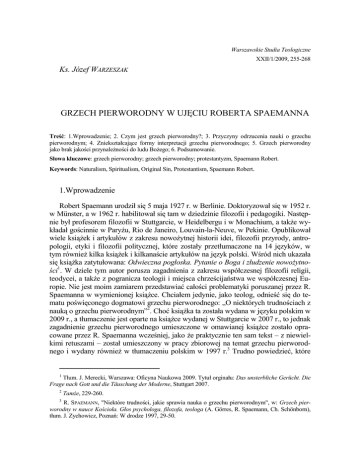 Warszawskie Studia Teologiczne XXII/1/2009, 255-268 Ks. Józef WARZESZAK GRZECH PIERWORODNY W UJĘCIU ROBERTA SPAEMANNA Treść: 1.Wprowadzenie; 2. Czym jest grzech pierworodny?; 3. Przyczyny odrzucenia nauki o grzechu pierworodnym; 4. Zniekształcające formy interpretacji grzechu pierworodnego; 5. Grzech pierworodny jako brak jakości przynaleŜności do ludu BoŜego; 6. Podsumowanie. Słowa kluczowe: grzech pierworodny; grzech pierworodny; protestantyzm, Spaemann Robert. Keywords: Naturalism, Spiritualism, Original Sin, Protestantism, Spaemann Robert. 1.Wprowadzenie Robert Spaemann urodził się 5 maja 1927 r. w Berlinie. Doktoryzował się w 1952 r. w Münster, a w 1962 r. habilitował się tam w dziedzinie filozofii i pedagogiki. Następnie był profesorem filozofii w Stuttgarcie, w Heidelbergu i w Monachium, a takŜe wykładał gościnnie w ParyŜu, Rio de Janeiro, Louvain-la-Neuve, w Pekinie. Opublikował wiele ksiąŜek i artykułów z zakresu nowoŜytnej historii idei, filozofii przyrody, antropologii, etyki i filozofii politycznej, które zostały przetłumaczone na 14 języków, w tym równieŜ kilka ksiąŜek i kilkanaście artykułów na język polski. Wśród nich ukazała się ksiąŜka zatytułowana: Odwieczna pogłoska. Pytanie o Boga i złudzenie nowoŜytności1. W dziele tym autor porusza zagadnienia z zakresu współczesnej filozofii religii, teodycei, a takŜe z pogranicza teologii i miejsca chrześcijaństwa we współczesnej Europie. Nie jest moim zamiarem przedstawiać całości problematyki poruszanej przez R. Spaemanna w wymienionej ksiąŜce. Chciałem jedynie, jako teolog, odnieść się do tematu poświęconego dogmatowi grzechu pierworodnego: „O niektórych trudnościach z nauką o grzechu pierworodnym”2. Choć ksiąŜka ta została wydana w języku polskim w 2009 r., a tłumaczenie jest oparte na ksiąŜce wydanej w Stuttgarcie w 2007 r., to jednak zagadnienie grzechu pierworodnego umieszczone w omawianej ksiąŜce zostało opracowane przez R. Spaemanna wcześniej, jako Ŝe praktycznie ten sam tekst – z niewielkimi retuszami – został umieszczony w pracy zbiorowej na temat grzechu pierworodnego i wydany równieŜ w tłumaczeniu polskim w 1997 r.3 Trudno powiedzieć, które 1 Tłum. J. Merecki, Warszawa: Oficyna Naukowa 2009. Tytuł orginału: Das unsterbliche Gerücht. Die Frage nach Gott und die Täuschung der Moderne, Stuttgart 2007. 2 3 TamŜe, 229-260. R. SPAEMANN, "Niektóre trudności, jakie sprawia nauka o grzechu pierworodnym", w: Grzech pierworodny w nauce Kościoła. Głos psychologa, filozofa, teologa (A. Görres, R. Spaemann, Ch. Schönborn), tłum. J. Zychowicz, Poznań: W drodze 1997, 29-50. 256 KS. JÓZEF WARZESZAK tłumaczenie jest lepsze, ale byłbym skłonnym twierdzić, Ŝe to wcześniejsze jest miejscami bardziej klarowne. R. Spaemann bardzo interesująco ukazuje filozoficzne przyczyny odrzucania przez współczesną mentalność nauki o grzechu pierworodnym, a co jest jeszcze cenniejsze, przedstawia własną interpretację powszechności grzechu pierworodnego, której osobiście nie spotkałem u Ŝadnego współczesnego autora. Nie moŜe być oczywiście traktowana jako wszystko wyjaśniająca i jako jedyna, wykluczająca inne, ale jako jedna spośród wielu. 2. Czym jest grzech pierworodny? R. Spaemann jest oczywiście za katolicką nauką o grzechu pierworodnym, broni jej i ukazuje laickie formy jej deformacji. Nasz autor zdaje sobie sprawę, Ŝe odrzucenie nauki o grzechu pierworodnym oznaczałoby zburzenie spójności nauki o odkupieniu, bo gdyby nie było grzechu pierworodnego, gdyby na wszystkich on nie ciąŜył, to nie byłoby potrzeby odkupienia. Jest to myśl św. Pawła z Rz 5,12-21. A ponadto nauka o grzechu pierworodnym ma ogromną wartość dla samo zrozumienia człowieka. Kiedy ta nauka znika, to pojawiają się inne zamienniki, które nie wyjaśniają niczego4. Przystępując do omówienia nauki o grzechu pierworodnym autor przypomina, Ŝe ten katolicki dogmat składa się z dwóch konstytutywnych części. Najpierw mówi o zerwaniu relacji człowieka z Bogiem, o utracie „przeznaczonej” dla niego pierwotnej świętości (sądzę, Ŝe ściślej byłoby powiedzieć udzielonej świętości, gdyŜ człowiek pierwotny faktycznie został nią obdarowany, choć nie wiadomo, jak długo ją posiadał), ale utraconej świętości oraz o tym, Ŝe człowiek rodzi się w formie egzystencji, w której jego pierwotne przeznaczenie zostało juŜ utracone, tak Ŝe bez BoŜej interwencji jego egzystencja byłaby bez wartości, o czym mówi Exultet: „Nic by nam nie przyszło z daru Ŝycia, gdybyśmy nie zostali odkupieni”. Zaznaczmy, Ŝe teologia określa te dwie części jako peccatum originale originans, czyli dający początek stanowi grzesznemu oraz peccatum originale originatum – stan grzeszny, powszechność grzeszności. Do drugiej części tego traktatu autor zalicza interpretację empiryczną konstytuującą człowieka, czyli doświadczenie przez niego takiej a nie innej kondycji grzeszności oraz rozdźwięk pomiędzy tą konstytucją a obrazem doskonałości i szczęśliwości, który człowiek w sobie niesie, czyli doświadczenie róŜnicy pomiędzy tym, kim jest a tym, jakim powinien być i do czego jest przeznaczony. Ten rozdźwięk nie jest czymś normalnym dla kondycji ludzkiej, bo gdyby tak było to „wizja pełnego Ŝycia stałaby się poboŜnym złudzeniem”5. Przyczynę tego rozdźwięku R. Spaemann widzi w „utracie świętości poprzez pierwotny czyn pierwszego człowieka”6. 4 Por. R. SPAEMANN, Odwieczna pogłoska. Pytanie o Boga i złudzenie nowoŜytności, dz. cyt., 230. 5 TamŜe, 231. 6 TamŜe, 231. GRZECH PIERWORODNY W UJĘCIU R. SPAEMANNA 257 W tym sensie nauka o grzechu pierworodnym jest mitem etiologicznym7. Zakłócenie relacji pomiędzy człowiekiem a Bogiem ma swą przyczynę w pierwotnym czynie. To zakłócenie jest teŜ przyczyną obecnej empirycznej konstytucji ludzkości. ChociaŜ 