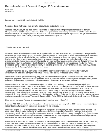 autosalon pomorski Mercedes Actros i Renault Kangoo Z.E. utytułowane Autor: IW 09.12.2011. Samochody roku 2012 wagi ciężkiej i lekkiej Mercedes-Benz Actros po raz czwarty zdobył tytuł ciężarówki roku Podczas odbywających się pod koniec listopada w belgijskim Kortrijk międzynarodowych targów „Trailer 2011”, nowemu Actrosowi przyznano prestiżowy tytuł Truck of the year. To już czwarty taki tytuł dla tej ciężarówki Mercedesa. Na tych samych targach ogłoszono, że tytuł samochodu dostawczego roku 2012 zdobyło elektryczne Renault Kangoo Z.E. Zdjęcia Mercedes i Renault Mercedes-Benz zdeklasował swoich kontrkandydatów do nagrody. Jako jedyny producent samochodów ciężarowych, wprowadził w tym roku nie tylko nowoczesny i ekologiczny silnik spełniający wyśrubowaną normę spalania Euro VI, ale także zaprojektował dla niego zupełnie nowy pojazd. Nowy Actros jest bowiem nie tylko czwartą generacją dobrze znanego i sprawdzonego już pojazdu – w przeciwieństwie do swych poprzedników został on zaprojektowany zupełnie od nowa. Przypomnijmy, że prezentację nowych Actrosów i jazdy testowe w okolicach Koszalina zorganizowała niedawno firma |Mercedes-Benz Mojsiuk, co relacjonujemy w osobnej publikacji. Wtedy było wiadomo, że nowy Actros kandyduje do kolejnego tytułu ciężarówki roku. - Jesteśmy dumni, że jury konkursu Truck of the Year uhonorowało nasz wysiłek tak ważnym wyróżnieniem – oznajmił Hubertus Troska, szef działu Mercedes-Benz Truck. Gianenrico Griffini, przewodniczący jury, tak skomentował zwycięstwo nowego Actrosa: - W swoim flagowym pojeździe Mercedes-Benz połączył ewolucyjne elementy z rewolucyjnymi osiągnięciami, które podnoszą poprzeczkę wydajności, bezpieczeństwa i komfortu w pojeździe ciężkim. Nagroda Truck of the Year przyznawana jest od 1976 roku. Od tego czasu stała się ona jednym z najbardziej prestiżowych wyróżnień w branży. Jury, złożone z 24 ekspertów z 24 różnych krajów wybiera co roku samochód ciężarowy, którego premiera ma dla rynku szczególne znaczenie ze względu na innowacyjność, pomysłowość lub inne elementy, które mają wyznaczać kierunek rozwoju ciężkiej motoryzacji. Mercedes-Benz otrzymał nagrodę tą po raz siódmy. Warto dodać, iż każdej z poprzednich generacji Actrosa również przyznano ten tytuł w roku debiutu. Ostatnio do listy sukcesów nowego Actrosa dopisano nagrodę European Transport Sustainability Prize 2012 w kategorii ciężarówek powyżej 7,5 tony. Silne strony nowego Actrosa to oszczędność, dynamika jazdy i komfort Z ponad 700 000 sprzedanych Actrosów - od wprowadzenia go na rynek w 1996 roku - ten model jest najbardziej utytułowanym pojazdem ciężarowym na świecie. Renault Kangoo Z.E. to furgonetka z napędem wyłącznie elektrycznym. Tytuł International Van of The Year 2012 zdobyła jako pierwszy w historii dostawczak napędzany całkowicie energią elektryczną, wygrywając m.in. ze spalinowymi Iveco Daily, Fiatem Ducato czy VW Caddy. Kangoo Z.E., sprzedawane w Europie zaledwie od końca października, a otrzymało już trzy nagrody. Oprócz wymienionego tytułu, samochód ten otrzymał również nagrody w Danii i Irlandii. Firma Renault − od 1998 roku numer 1 na europejskim rynku samochodów dostawczych − poszerzyła swą gamę samochodów dostawczych o Kangoo Z.E., wersję znanego wszystkim dobrze Kangoo z napędem elektrycznym. Jest to pierwsza furgonetka z napędem elektrycznym produkowana przez jednego producenta. Dzięki umieszczeniu akumulatora pod podłogą samochodu, Kangoo Z.E. http://autosalonpomorski.pl Kreator PDF Utworzono 3 March, 2017, 23:26 autosalon pomorski zachowuje tę samą objętość ładunkową i ładowność oraz te same wymiary co wersja z silnikiem spalinowym. Kangoo Z.E. jest oferowane w dwóch długościach i trzech wersjach nadwozia. Wszystkie wersje są produkowane na taśmach zakładu MCA w Maubeuge we Francji, na tej samej linii montażowej co Kangoo z silnikiem spalinowym. W ofercie znajduje się Kangoo Z.E., Kangoo Z.E. Maxi 2-miejscowe i Kangoo Z.E. Maxi 5-miejscowe. Ta różnorodność wersji pozwala spełnić liczne potrzeby firm, którym ten samochód o przestrzeni ładunkowej od 3 do 4,6 m sześc. zapewnia możliwość przewozu zarówno osób, jak i towaru. Kangoo Z.E., jako pionier z gamy Renault Z.E., pojawiło się po raz pierwszy w salonach Renault 28 października 2011 roku. Jest dostępne w Europie w cenie od 20 000 euro netto (bez dopłat państwowych), zaś we Francji Kangoo Z.E. kosztuje 15 000 euro netto dzięki państwowej dopłacie w wysokości 5 000 euro. Akumulator jest natomiast wynajmowany klientowi w cenie od 72 euro netto miesięcznie na okres 36 miesięcy i przebieg 10 000 km rocznie. http://autosalonpomorski.pl Kreator PDF Utworzono 3 March, 2017, 23:26