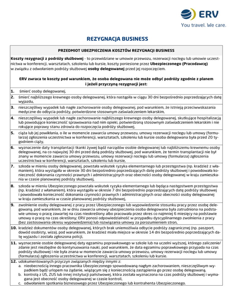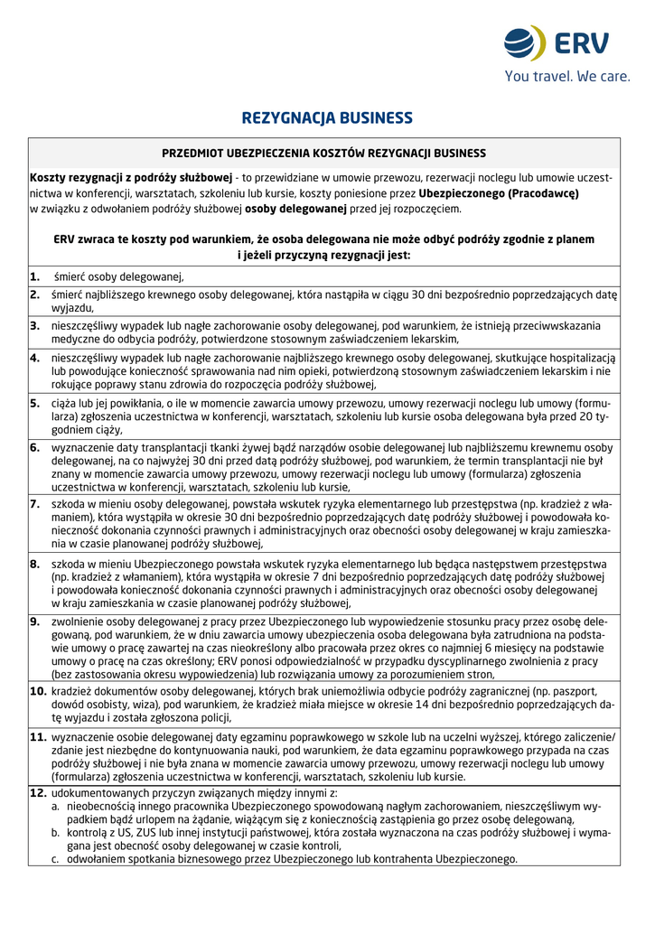 REZYGNACJA BUSINESS PRZEDMIOT UBEZPIECZENIA KOSZTÓW REZYGNACJI BUSINESS Koszty rezygnacji z podróży służbowej - to przewidziane w umowie przewozu, rezerwacji noclegu lub umowie uczestnictwa w konferencji, warsztatach, szkoleniu lub kursie, koszty poniesione przez Ubezpieczonego (Pracodawcę) w związku z odwołaniem podróży służbowej osoby delegowanej przed jej rozpoczęciem. ERV zwraca te koszty pod warunkiem, że osoba delegowana nie może odbyć podróży zgodnie z planem i jeżeli przyczyną rezygnacji jest: 1. śmierć osoby delegowanej, 2. śmierć najbliższego krewnego osoby delegowanej, która nastąpiła w ciągu 30 dni bezpośrednio poprzedzających datę wyjazdu, 3. nieszczęśliwy wypadek lub nagłe zachorowanie osoby delegowanej, pod warunkiem, że istnieją przeciwwskazania medyczne do odbycia podróży, potwierdzone stosownym zaświadczeniem lekarskim, 4. nieszczęśliwy wypadek lub nagłe zachorowanie najbliższego krewnego osoby delegowanej, skutkujące hospitalizacją lub powodujące konieczność sprawowania nad nim opieki, potwierdzoną stosownym zaświadczeniem lekarskim i nie rokujące poprawy stanu zdrowia do rozpoczęcia podróży służbowej, 5. ciąża lub jej powikłania, o ile w momencie zawarcia umowy przewozu, umowy rezerwacji noclegu lub umowy (formularza) zgłoszenia uczestnictwa w konferencji, warsztatach, szkoleniu lub kursie osoba delegowana była przed 20 tygodniem ciąży, 6. wyznaczenie daty transplantacji tkanki żywej bądź narządów osobie delegowanej lub najbliższemu krewnemu osoby delegowanej, na co najwyżej 30 dni przed datą podróży służbowej, pod warunkiem, że termin transplantacji nie był znany w momencie zawarcia umowy przewozu, umowy rezerwacji noclegu lub umowy (formularza) zgłoszenia uczestnictwa w konferencji, warsztatach, szkoleniu lub kursie, 7. szkoda w mieniu osoby delegowanej, powstała wskutek ryzyka elementarnego lub przestępstwa (np. kradzież z włamaniem), która wystąpiła w okresie 30 dni bezpośrednio poprzedzających datę podróży służbowej i powodowała konieczność dokonania czynności prawnych i administracyjnych oraz obecności osoby delegowanej w kraju zamieszkania w czasie planowanej podróży służbowej, 8. szkoda w mieniu Ubezpieczonego powstała wskutek ryzyka elementarnego lub będąca następstwem przestępstwa (np. kradzież z włamaniem), która wystąpiła w okresie 7 dni bezpośrednio poprzedzających datę podróży służbowej i powodowała konieczność dokonania czynności prawnych i administracyjnych oraz obecności osoby delegowanej w kraju zamieszkania w czasie planowanej podróży służbowej, 9. zwolnienie osoby delegowanej z pracy przez Ubezpieczonego lub wypowiedzenie stosunku pracy przez osobę delegowaną, pod warunkiem, że w dniu zawarcia umowy ubezpieczenia osoba delegowana była zatrudniona na podstawie umowy o pracę zawartej na czas nieokreślony albo pracowała przez okres co najmniej 6 miesięcy na podstawie umowy o pracę na czas określony; ERV ponosi odpowiedzialność w przypadku dyscyplinarnego zwolnienia z pracy (bez zastosowania okresu wypowiedzenia) lub rozwiązania umowy za porozumieniem stron, 10. kradzież dokumentów osoby delegowanej, których brak uniemożliwia odbycie podróży zagranicznej (np. paszport, dowód osobisty, wiza), pod warunkiem, że kradzież miała miejsce w okresie 14 dni bezpośrednio poprzedzających datę wyjazdu i została zgłoszona policji, 11. wyznaczenie osobie delegowanej daty egzaminu poprawkowego w szkole lub na uczelni wyższej, którego zaliczenie/ zdanie jest niezbędne do kontynuowania nauki, pod warunkiem, że data egzaminu poprawkowego przypada na czas podróży służbowej i nie była znana w momencie zawarcia umowy przewozu, umowy rezerwacji noclegu lub umowy (formularza) zgłoszenia uczestnictwa w konferencji, warsztatach, szkoleniu lub kursie. 12. udokumentowanych przyczyn związanych między innymi z: a. nieobecnością innego pracownika Ubezpieczonego spowodowaną nagłym zachorowaniem, nieszczęśliwym wypadkiem bądź urlopem na żądanie, wiążącym się z koniecznością zastąpienia go przez osobę delegowaną, b. kontrolą z US, ZUS lub innej instytucji państwowej, która została wyznaczona na czas podróży służbowej i wymagana jest obecność osoby delegowanej w czasie kontroli, c. odwołaniem spotkania biznesowego przez Ubezpieczonego lub kontrahenta Ubezpieczonego. Zawarcie umowy: 1. w dniu rezerwacji podróży - jeżeli rezerwacja podróży nastąpi w terminie krótszym niż 30 dni przed datą wyjazdu, 2. w terminie 7 dni od daty rezerwacji podróży – jeżeli rezerwacja podróży nastąpi w terminie wcześniejszym niż 30 dni przed datą wyjazdu, Anulacja polisy: polisę ubezpieczenia kosztów rezygnacji/ kosztów rezygnacji i przerwania podróży można anulować w systemie wyłącznie w dniu jej wystawienia. Okres ubezpieczenia: rozpoczyna się w dniu zawarcia umowy ubezpieczenia i kończy się w dniu wskazanym na polisie, jako początek podróży. Suma ubezpieczenia: równa cenie biletu/ rezerwacji noclegu/ uczestnictwa w konferencji, warsztatach, szkoleniu lub kursie, jednak nie wyższa niż 20.000 PLN na osobę WAŻNE: • • BRAK UDZIAŁU WŁASNEGO; ERV zwraca 100% poniesionych kosztów odwołania podróży służbowej zakres ubezpieczenia obejmuje NASTĘPSTWA CHORÓB PRZEWLEKŁYCH Produkty uzupełniające: Uzupełnieniem ubezpieczenia Rezygnacja Business dla osoby delegowanej są pakiety krótkoterminowych ubezpieczeń podróży TIP, TIP PLUS, TOP oraz TOP PLUS (konieczne jest wystawienie odrębnej polisy).