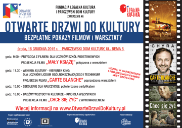 FUNDACJA LEGALNA KULTURA I PARCZEWSKI DOM KULTURY ZAPRASZAJĄ NA OTWARTE DRZWI DO KULTURY BEZPŁATNE POKAZY FILMÓW i WARSZTATY środa, 16 GRUDNIA 2015 r. PARCZEWSKI DOM KULTURY, UL. BEMA 5 godz. 9.00 - PRZYGODA Z FILMEM: DLA UCZNIÓW SZKÓŁ PODSTAWOWYCH PROJEKCJA FILMU „MAŁY KSIĄŻĘ” połączona z warsztatem godz. 11.30 - WEHIKUŁ KULTURY - KIERUNEK KINO: DLA UCZNIÓW LICEUM OGÓLNOKSZTAŁCĄCEGO I TECHNIKUM PROJEKCJA FILMU „CARTE UDZI AŁ W WARS I PRO ZTAT JEKC A JEST JACH FIL CH MÓW BEZP ŁATN Y BLANCHE” poprzedzona warsztatem godz. 15.00 - SZKOLENIE DLA NAUCZYCIELI potwierdzone certyfikatem godz. 18.00 - BĄDŹMY WSZYSCY W KULTURZE - KINO DLA WSZYSTKICH PROJEKCJA FILMU „CHCE SIĘ ŻYĆ” Z WPROWADZENIEM Więcej informacji na www.OtwarteDrzwiDoKultury.pl Projekt współfinansowany przez: Projekt realizuje Fundacja Legalna Kultura Partner techniczny