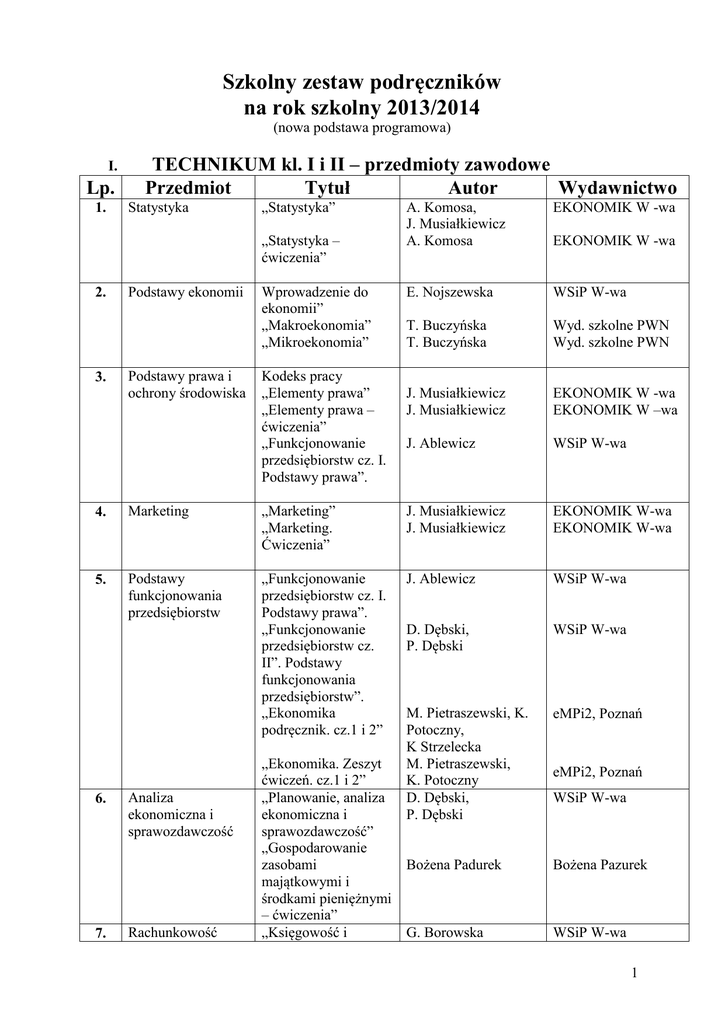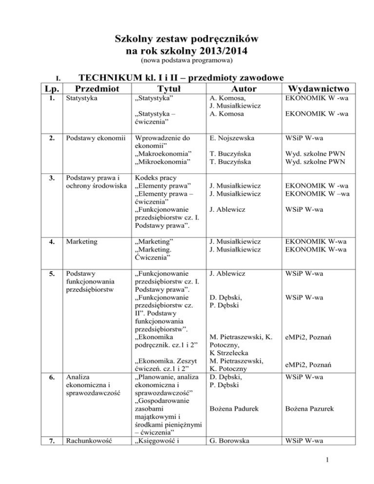 Szkolny zestaw podręczników na rok szkolny 2013/2014 (nowa podstawa programowa) I. Lp. 1. TECHNIKUM kl. I i II – przedmioty zawodowe Przedmiot Tytuł Autor Wydawnictwo Statystyka „Statystyka” „Statystyka – ćwiczenia” 2. 3. Podstawy ekonomii Podstawy prawa i ochrony środowiska Wprowadzenie do ekonomii” „Makroekonomia” „Mikroekonomia” Kodeks pracy „Elementy prawa” „Elementy prawa – ćwiczenia” „Funkcjonowanie przedsiębiorstw cz. I. Podstawy prawa”. A. Komosa, J. Musiałkiewicz A. Komosa EKONOMIK W -wa E. Nojszewska WSiP W-wa T. Buczyńska T. Buczyńska Wyd. szkolne PWN Wyd. szkolne PWN J. Musiałkiewicz J. Musiałkiewicz EKONOMIK W -wa EKONOMIK W –wa J. Ablewicz WSiP W-wa EKONOMIK W -wa 4. Marketing „Marketing” „Marketing. Ćwiczenia” J. Musiałkiewicz J. Musiałkiewicz EKONOMIK W-wa EKONOMIK W-wa 5. Podstawy funkcjonowania przedsiębiorstw „Funkcjonowanie przedsiębiorstw cz. I. Podstawy prawa”. „Funkcjonowanie przedsiębiorstw cz. II”. Podstawy funkcjonowania przedsiębiorstw”. „Ekonomika podręcznik. cz.1 i 2” J. Ablewicz WSiP W-wa D. Dębski, P. Dębski WSiP W-wa M. Pietraszewski, K. Potoczny, K Strzelecka M. Pietraszewski, K. Potoczny D. Dębski, P. Dębski eMPi2, Poznań Bożena Padurek Bożena Pazurek G. Borowska WSiP W-wa 6. 7. Analiza ekonomiczna i sprawozdawczość Rachunkowość „Ekonomika. Zeszyt ćwiczeń. cz.1 i 2” „Planowanie, analiza ekonomiczna i sprawozdawczość” „Gospodarowanie zasobami majątkowymi i środkami pieniężnymi – ćwiczenia” „Księgowość i eMPi2, Poznań WSiP W-wa 1 8. 9. 10. finansowa Działalność przedsiębiorstwa – pracownia techniki biurowej Działalność przedsiębiorstwa – pracownia ekonomiki kalkulacja. Cz.I i II” „Technika biurowa” „Organizacja i technika pracy biurowej” „Ekonomika podręcznik. cz.1 i 2” Współpraca z kontrahentem „Ekonomika podręcznik. cz.1 i 2” „Ekonomika. Zeszyt ćwiczeń. cz.1 i 2” „Ekonomika. Zeszyt ćwiczeń. cz.1 i 2” 11. Kadry i płace 12. Egzamin zawodowy „Testy i zadania z rozwiązaniami. Technik ekonomista” „Samouczek programów INSERT GT” Egzamin zawodowy „Zeszyt testów i ćwiczeń przygotowujących do egzaminu potwierdzającego kwalifikacje zawodowe dla zawodu – technik ekonomista” Elementy prawa Kodeks pracy „Elementy prawa” „Elementy prawa – ćwiczenia” Statystyka w „Statystyka” marketingu „Statystyka – ćwiczenia” „Zarys statystyki” 13. 14. 15. 16. Towar jako przedmiot w handlu Kadry i płace „Technologia i towaroznawstwo” „Towaroznawstwo żywności” „Towaroznawstwo wyrobów nieżywnościowych” I. Frymark A. Komosa EKONOMIK W-wa U. Łatka WSiP W-wa M. Pietraszewski, K. Potoczny, K Strzelecka M. Pietraszewski, K. Potoczny eMPi2, Poznań M. Pietraszewski, K. Potoczny, K Strzelecka M. Pietraszewski, K. Potoczny eMPi2, Poznań D. Dębski, P. Dębski G. Borowska, E. Chojnacka, M. Płatkowska A. Komosa WSiP W-wa B. Padurek Bożena Padurek Wrocław J. Musiałkiewicz J. Musiałkiewicz EKONOMIK W -wa EKONOMIK W –wa A. Komosa, J. Musiałkiewicz A. Komosa EKONOMIK W -wa A. MaksymowiczAjchel U. Łatka WSiP W-wa D. KołożynKrajewska, T.Sikora P. Miller, H. Rawdanowicz WSiP W-wa eMPi2, Poznań eMPi2, Poznań WS i P W –wa EKONOMIK W-wa EKONOMIK W –wa WSiP W-wa WSiP W-wa 2 „Organizowanie sprzedaży. cz. 1 Towar jako przedmiot handlu” D. Andrzejczak, A. Mikina, M.D. Wajgner WSiP W-wa 17. Organizacja i technika sprzedaży „Organizowanie sprzedaży. cz. 2 Organizacja i techniki sprzedaży” D. Andrzejczak, A. Mikina, M.D. Wajgner, B. Rzeźnik WSiP W-wa 18. Obsługa klientów „Sprzedaż towarów” H. Zielińska REA 19. 20. Marketing w działalności handlowej „Sprzedaż D. Andrzejczak, A. towarów.cz.1 Obsługa Mikina, M.D. klienta” Wajgner, B. Rzeźnik WSiP W-wa „Marketing” „Marketing. Ćwiczenia” „Marketing w działalności gospodarczej” J. Musiałkiewicz J. Musiałkiewicz EKONOMIK W-wa EKONOMIK W-wa H. Szulce, M. Florek, K. Janiszewska, T. Żyminkowski WSiP W-wa Praca zbiorowa Empi2 Poznań Przedsiębiorca w handlu „Przedsiębiorca 21. Sprzedaż towarów „Ekonomika handlu.cz. 1,2,3 + ćwiczenia cz. 1, 2, 3” A. Komosa EKONOMIK W-wa 22. Symulacyjna firma handlowapracownia rachunkowości handlowej „Sprzedaż towarów cz. 2 i 3.” J. Józwiak, M. Knap WSiP W-wa 23. Symulacyjna firma handlowapracownia informatycznohandlowa U. Łatka WSiP W-wa 24. w handlu” „Organizacja i technika pracy biurowej” „Sprzedaż towarów cz. 2 i 3.” „Pracownia informatycznohandlowa - cz. 1 i 2” Egzamin zawodowy „Testy i zadania z rozwiązaniami. Technik handlowiec” J. Józwiak, M. Knap WSiP W-wa J. Józwiak, M. Knap WSiP W-wa J. Józwiak, M. Knap WS i P W -wa 3 25. 26. 27. 28. 29. 30. 31. 32. 33. A. Jurczak, I. Mikołajczak, H. Szmyt A. Jurczak, I. Mikołajczak, H. Szmyt eMPi2 Poznań „Budownictwo ogólne” “Rysunek techniczny budowlany” “Rysunek techniczny budowlany” Mirosława Popek, Bożenna Wapińska Tadeusz Maj WSiP W-wa Tadeusz Maj WSiP W-wa „Przygotowanie stali zbrojeniowej do montażu” „Montaż zbrojenia w deskowaniach” „Wykonywanie mieszanek betonowych” „Betonowanie i pielęgnacja betonu” „Przygotowanie stali zbrojeniowej do montażu” „Montaż zbrojenia w deskowaniach” „Wykonywanie mieszanek betonowych” „Betonowanie i pielęgnacja betonu” Mirosław Kozłowski WSiP W-wa Mirosław Kozłowski WSiP W-wa Mirosław Kozłowski WSiP W-wa Mirosław Kozłowski WSiP W-wa Mirosław Kozłowski WSiP W-wa Mirosław Kozłowski WSiP W-wa Mirosław Kozłowski WSiP W-wa Mirosław Kozłowski WSiP W-wa Paweł Andrzejczyk Krzysztof Pawłowski WSL Poznań ? Egzamin zawodowy „Testy przygotowujące do egzaminu zawodowego- technik handlowiec” „Rozwiązania testów przygotowujących do egzaminu zawodowego-technik handlowiec” Podstawy budownictwa Dokumentacja techniczna Pracownia dokumentacji technicznej