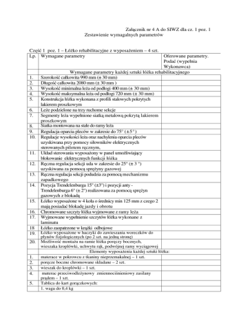 Załącznik nr 4 A do SIWZ dla cz. 1 poz. 1 Zestawienie wymagalnych parametrów Część 1 poz. 1 – Łóżko rehabilitacyjne z wyposażeniem – 4 szt. Lp. Wymagane parametry 1. 2. 3. 4. 5. 6. 7. 8. 9. 10. 11. 12. 13. 14. 15. 16. 17. 18 19. 20. 1. 2. 3. 4. 5. Oferowane parametry. Podać (wypełnia Wykonawca) Wymagane parametry każdej sztuki łóżka rehabilitacyjnego Szerokość całkowita 990 mm (± 30 mm) Długość całkowita 2080 mm (± 30 mm ) Wysokość minimalna leża od podłogi 400 mm (± 30 mm) Wysokość maksymalna leża od podłogi 720 mm (± 30 mm) Konstrukcja łóżka wykonana z profili stalowych pokrytych lakierem proszkowym Leże podzielone na trzy ruchome sekcje Segmenty leża wypełnione siatką metalową pokrytą lakierem proszkowym Siatka montowana na stałe do ramy leża Regulacja oparcia pleców w zakresie do 75° (±5°) Regulacje wysokości leża oraz nachylenia oparcia pleców uzyskiwana przy pomocy siłowników elektrycznych sterowanych pilotem ręcznym, Układ sterowania wyposażony w panel umożliwiający blokowanie elektrycznych funkcji łóżka Ręczna regulacja sekcji uda w zakresie do 25° (± 3 °) uzyskiwana za pomocą sprężyny gazowej Ręczna regulacja sekcji podudzia za pomocą mechanizmu zapadkowego Pozycja Trendelenburga 15° (±3°) i pozycji anty Trendelenburga 6° (± 2°) realizowana za pomocą sprężyn gazowych z blokadą Łóżko wyposażone w 4 koła o średnicy min 125 mm z czego 2 mają posiadać blokadę jazdy i obrotu Chromowane szczyty łóżka wyjmowane z ramy leża Wyjmowane wypełnienie szczytów łóżka wykonane z laminatu Łóżko zaopatrzone w krążki odbojowe Łóżko wyposażone w haczyki do zawieszania woreczków do płynów fizjologicznych (po 2 szt. na jedną stronę) Możliwość montażu na ramie łóżka poręczy bocznych, wieszaka kroplówki, uchwytu rąk, podwójnej ramy wyciągowej Elementy wyposażenia każdej sztuki łóżka: materace w pokrowcu z tkaniny nieprzemakalnej – 1 szt. poręcze boczne chromowane składane – 2 szt. wieszak do kroplówki – 1 szt. materac przeciwodleżynowy zmiennociśnieniowy zasilany prądem – 1 szt. Tablica do kart gorączkowych: 1. waga do 0,4 kg 21. 2. szerokość do 320 mm 3. wysokość do 240 mm 4. tablica wykonana z tworzywa z metalowym zaciskiem Powierzchnie łóżka odporne na środki dezynfekcyjne Wymagane parametry każdej sztuki szafki przyłóżkowej 1. 2. 3. 4. 5. 6. 7. 8. 9. 10. 11. 12. 13. 14. Szerokość całkowita: 370 mm (± 30 mm) Długość całkowita: 480 mm ( ± 30 mm ) Wysokość całkowita: 850 mm (± 30 mm) Z boku szafki umieszczony wkład wykorzystywany na butelki, gazety lub inne przedmioty Wkład boczny wykonany z tworzywa Chromowane pręty zabezpieczające przedmioty umieszczone w bocznym wkładzie Blat szafki wykonany z tworzywa ABS odpornego na środki dezynfekcyjne i wysoką temperaturę Blat profilowany z wypukłą krawędzią zewnętrzną ograniczającą możliwość zlewania się płynów na podłogę Konstrukcja szafki oraz czoło szuflady i drzwiczek wykonane z blach stalowych ocynkowanych pokrytych lakierem proszkowym Skrzynka szafki wyposażona w półkę Szuflada i drzwiczki wyposażone w chromowany zaokrąglony uchwyt do otwierania Szuflada dwustronnego wysuwania wyposażona w ogranicznik eliminujący wypadnięcie szuflady z szafki Szafka przejezdna z blokadą dwóch kół wykonanych z tworzywa Szafka odporna na środki dezynfekcyjne Wszystkie parametry określone są warunkami granicznymi. Nie spełnienie nawet jednego z w/w wymagań spowoduje odrzucenie oferty. Wykonawca zobowiązany jest do podania parametrów w jednostkach wskazanych w niniejszym zestawieniu. Oferowane według w/w wymagań urządzenie musi być kompletne i gotowe do użytkowania bez żadnych dodatkowych zakupów elementów i akcesoriów (poza materiałami eksploatacyjnymi). …………………………………………. Podpis upoważnionego przedstawiciela Wykonawcy Załącznik nr 4 A do SIWZ dla cz. 1 poz. 2 Zestawienie wymagalnych parametrów Część 1 poz. 2 – Łóżko rehabilitacyjne z wyposażeniem – 2 szt. Lp. Wymagane parametry 1. 2. 3. 4. 5. 6. 7. 8. 9. 10. 11. 12. 13. 14. 15. 16. 17. 18 19. 20. 1. 2. 3. 4. Oferowane parametry. Podać (wypełnia Wykonawca) Wymagane parametry każdej sztuki łóżka rehabilitacyjnego Szerokość całkowita 990 mm (± 30 mm) Długość całkowita 2080 mm (± 30 mm ) Wysokość minimalna leża od podłogi 400 mm (± 30 mm) Wysokość maksymalna leża od podłogi 720 mm (± 30 mm) Konstrukcja łóżka wykonana z profili stalowych pokrytych lakierem proszkowym Leże podzielone na trzy ruchome sekcje Segmenty leża wypełnione siatką metalową pokrytą lakierem proszkowym Siatka montowana na stałe do ramy leża Regulacja oparcia pleców w zakresie do 75° (±5°) Regulacje wysokości leża oraz nachylenia oparcia pleców uzyskiwana przy pomocy siłowników elektrycznych sterowanych pilotem ręcznym, Układ sterowania wyposażony w panel umożliwiający blokowanie elektrycznych funkcji łóżka Ręczna regulacja sekcji uda w zakresie do 25° (± 3 °) uzyskiwana za pomocą sprężyny gazowej Ręczna regulacja sekcji podudzia za pomocą mechanizmu zapadkowego Pozycja Trendelenburga 15° (±3°) i pozycji anty Trendelenburga 6° (± 2°) realizowana za pomocą sprężyn gazowych z blokadą Łóżko wyposażone w 4 koła o średnicy min 125 mm z czego 2 mają posiadać blokadę jazdy i obrotu Chromowane szczyty łóżka wyjmowane z ramy leża Wyjmowane wypełnienie szczytów łóżka wykonane z laminatu Łóżko zaopatrzone w krążki odbojowe Łóżko wyposażone w haczyki do zawieszania woreczków do płynów fizjologicznych (po 2 szt. na jedną stronę) Możliwość montażu na ramie łóżka poręczy bocznych, wieszaka kroplówki, uchwytu rąk, podwójnej ramy wyciągowej Elementy wyposażenia każdej sztuki łóżka: materace w pokrowcu z tkaniny nieprzemakalnej – 1 szt. poręcze boczne chromowane składane – 2 szt.