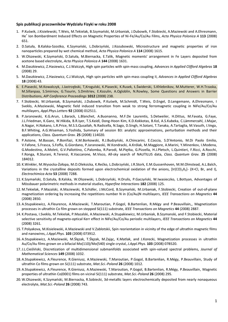 1 Spis publikacji pracowników Wydziału Fizyki w roku 2008
