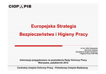 Europejska Strategia Bezpieczeństwa i Higieny Pracy dr inż. Zofia Pawłowska kierownik Zakładu Zarządzania Bezpieczeństwem i Higieną Pracy CIOP-PIB Informacja przygotowana na posiedzenie Rady Ochrony Pracy Warszawa, październik 2012 Centralny Instytut Ochrony Pracy - Państwowy Instytut Badawczy Plan prezentacji Średniookresowa ocena Strategii UE na rzecz bezpieczeństwa i higieny pracy na lata 2007-2012 Założenia do przyszłej Strategii UE na rzecz bezpieczeństwa i higieny pracy na lata 2013-2020 Średniookresowa ocena wspólnotowej strategii na rzecz bezpieczeństwa i higieny pracy na lata 2007-2012: Scoreboard 2009 Kwestionariusz Komisji Europejskiej skierowany do państw członkowskich w 2010 r CEL OGÓLNY WSPÓLNOTOWEJ STRATEGII NA LATA 2007-2012 Stałe zmniejszanie liczby wypadków przy pracy i chorób zawodowych Zmniejszenie w UE-27 wskaźnika wypadków przy pracy o 25 % Cele szczegółowe Strategii Doskonalenie, uproszczenie i lepsze wdrażanie prawa UE oraz jego dostosowywanie do zmian w miejscu pracy Rozwój strategii i programów krajowych Promowanie kultury bezpieczeństwa Rozwój metod identyfikacji nowopowstających czynników i oceny ryzyka zawodowego Rozwój narzędzi do monitorowania postępu Rozwój współpracy na poziomie międzynarodowym Kryteria Oceny Strategii: Wskaźniki o charakterze ilościowym, wyznaczane na podstawie danych statystycznych: Cele odnoszące się do osiąganych wyników: wskaźniki wypadków przy pracy, wskaźniki chorób związanych z pracą Wskaźniki o charakterze jakościowym: Cele skierowane na doskonalenie systemów, struktur i procesów (np. lepsze prawo, skuteczniejsze informowanie, lepszy nadzór nad warunkami pracy) Źródło: Commission Staff Working Paper, Mid-term Review of the European Strategy 2007-2012 on Health and Safety at Work, Bruksela 2011 Informacji na temat osiąganego postępu dostarczają badania prowadzone na poziomie UE przez: Eurostat Europejską Agencję Bezpieczeństwa i Zdrowia w Pracy (EU-OSHA) Europejską Agencję na rzecz poprawy Warunków Życia i Pracy (EUROFOUND) Zmiany wskaźników wypadków przy pracy w krajach UE 0 5 3 Jak zmieniał się wskaźnik częstości wypadków przy pracy w ciągu ostatnich 3 lat? 4 15 20 rośnie maleje 21 1 4 Jak zmieniał się wskaźnik częstości śmiertelnych wypadków przy pracy w ciągu ostatnich 3 lat? 25 15 1 Jak zmieniał się wskaźnik częstości wypadków przy pracy w ciągu ostatnich 10 lat? Jak zmieniał się wskaźnik częstości śmiertelnych wypadków przy pracy w ciągu ostatnich 10 lat? 10 1 pozostaje na tym samym poziomie brak informacji 14 2 18 0 Liczba krajów UE Określenie, o ile procent zmniejszyły się wskaźniki wypadków przy pracy w UE-27 w latach 2007 - 2012 będzie możliwe w roku 2014 Źródło: Commission Staff Working Paper, Mid-term Review of the European Strategy 2007-2012 on Health and Safety at Work, Bruksela 2011 120 100 9.5 8.5 80 8.0 8.8 8.5 9.5 9.9 10.4 8.7 8.4 9.4 9.7 Liczba wypadków przy pracy w Polsce (w tys.) 60 40 20 0 Źródło danych: GUS 10 9 8 7 Wskaźnik wypadków przy pracy w Polsce na 1000 pracujących 6 5 4 3 2 1 0 8,37 7,84 7,6 8,15 8,07 7,99 8,83 8,82 8,96 7,47 8,15 8,35 Wskaźnik wypadków śmiertelnych na 100 tys. zatrudnionych w wybranych krajach UE i w Polsce w 2009 r. Irlandia Austria Rumunia Polska Portugalia Litwa Malta Włochy Łotwa Węgry Bułgaria Słowenia Hiszpania Estonia Cypr Holandia Belgia Czechy Szwajcaria Słowacja Szwecja Dania Luksemburg Finlandia Wielka Brytania Niemcy 6,88 6,47 5,93 5,66 5,6 5,39 4,49 4,02 3,98 3,41 3,38 3,2 3,18 3,09 2,86 2,81 2,64 2,36 2,3 2,28 1,92 1,88 1,77 1,71 1,54 1,39 0,00 Źródło: Eurostat 1,00 2,00 3,00 4,00 5,00 6,00 7,00 8,00 Krajowe strategie w dziedzinie BHP 0 5 10 Czy ustanowiono formalną krajową strategię w BHPdziedzinie bezpieczeństwa i higieny pracy? 20 7 Jeżeli NIE, czy istnieje inny program w dziedzinie BHP? Źródło: Scoreboard 2009 Tak Nie 5 Czy w krajowej strategii/planie działań ustalono mierzalne cele w dziedzinie BHP? Czy istnieje formalna procedura oceny krajowej strategii/planu? Liczba krajów UE 15 20 25 20 5 21 4 Główny instrument realizacji Strategii UE w zakresie BHP w Polsce PROGRAM WIELOLETNI POPRAWA BEZPIECZEŃSTWA I WARUNKÓW PRACY II ETAP: 2011-2013 Program wieloletni Poprawa bezpieczeństwa i warunków pracy II etap, okres realizacji: lata 2011-2013 Cel główny programu Opracowanie innowacyjnych rozwiązań organizacyjnych i technicznych, ukierunkowanych na rozwój: • zasobów ludzkich, • nowych wyrobów i technologii, • metod i systemów zarządzania, których wykorzystanie przyczyni się do: • znaczącego ograniczenia liczby osób zatrudnionych w warunkach narażenia na czynniki niebezpieczne, szkodliwe i uciążliwe oraz • ograniczenia związanych z nimi wypadków przy pracy, chorób zawodowych i • wynikających z tego strat ekonomicznych i społecznych. Priorytety proponowane przez Komisję Europejską na podstawie oceny średniookresowej do strategii 2013 - 2020: Uproszczenie i uaktualnienie istniejącego prawa, przez sfinalizowanie podjętych inicjatyw, po konsultacjach z partnerami społecznymi i zainteresowanymi stronami; Przyjmowanie instrumentów niewiążących (rekomendacji) – zwłaszcza w odniesieniu do podwykonawców. samozatrudniających się, służb ochrony i zapobiegania oraz włączenia tematów dotyczących bhp do edukacji; Dalszy rozwój i integracja działań na poziomie krajowym; Rozwój narzędzi służących monitorowaniu postępu w obszarze bhp, z uwzględnieniem Scoreboard’u 2009; Zwiększenie spójności między podejmowanymi inicjatywami a strategią. Założenia do przyszłej Strategii UE na rzecz bezpieczeństwa i higieny pracy na lata 2013-2020 Założenia opracowano na wniosek Komisji Europejskiej w ramach prac ACSH - Komitet Doradczy przy Komisji Europejskiej ds. Bezpieczeństwa i Zdrowia w Pracy (przedstawiciele pracodawców, pracowników i rządów z 27 państw UE) Projek