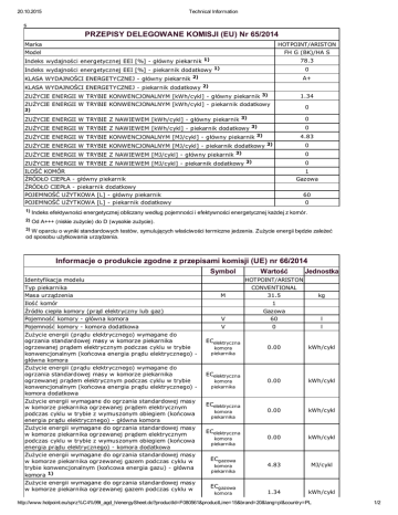 20.10.2015 Technical Information s PRZEPISY DELEGOWANE KOMISJI (EU) Nr 65/2014 Marka HOTPOINT/ARISTON Model FH G (BK)/HA S Indeks wydajności energetycznej EEI [%] główny piekarnik 1) 78.3 Indeks wydajności energetycznej EEI [%] piekarnik dodatkowy 1) 0 KLASA WYDAJNOŚCI ENERGETYCZNEJ główny piekarnik 2) A+ KLASA WYDAJNOŚCI ENERGETYCZNEJ piekarnik dodatkowy 2) ZUŻYCIE ENERGII W TRYBIE KONWENCJONALNYM [kWh/cykl] główny piekarnik 3) 1.34 ZUŻYCIE ENERGII W TRYBIE KONWENCJONALNYM [kWh/cykl] piekarnik dodatkowy 0 3) ZUŻYCIE ENERGII W TRYBIE Z NAWIEWEM [kWh/cykl] główny piekarnik 3) 0 ZUŻYCIE ENERGII W TRYBIE Z NAWIEWEM [kWh/cykl] piekarnik dodatkowy 3) 0 ZUŻYCIE ENERGII W TRYBIE KONWENCJONALNYM [MJ/cykl] główny piekarnik 3) 4.83 ZUŻYCIE ENERGII W TRYBIE KONWENCJONALNYM [MJ/cykl] piekarnik dodatkowy 3) 0 ZUŻYCIE ENERGII W TRYBIE Z NAWIEWEM [MJ/cykl] główny piekarnik 3) 0 ZUŻYCIE ENERGII W TRYBIE Z NAWIEWEM [MJ/cykl] piekarnik dodatkowy 3) 0 ILOŚĆ KOMÓR 1 ŹRÓDŁO CIEPŁA główny piekarnik Gazowa ŹRÓDŁO CIEPŁA piekarnik dodatkowy POJEMNOŚĆ UŻYTKOWA [L] główny piekarnik 60 POJEMNOŚĆ UŻYTKOWA [L] piekarnik dodatkowy 0 1) Indeks efektywności energetycznej obliczany według pojemności i efektywności energetycznej każdej z komór. 2) Od A+++ (niskie zużycie) do D (wysokie zużycie). 3) W oparciu o wyniki standardowych testów, symulujących właściwości termiczne jedzenia. Zużycie energii będzie zależeć od sposobu użytkowania urządzenia. Informacje o produkcie zgodne z przepisami komisji (UE) nr 66/2014 Symbol Identyfikacja modelu Jednostka HOTPOINT/ARISTON Typ piekarnika Masa urządzenia Wartość CONVENTIONAL M Ilość komór 31.5 kg 1 Źródło ciepła komory (prąd elektryczny lub gaz) Gazowa Pojemność komory główna komora V 60 l Pojemność komory komora dodatkowa V 0 l 0.00 kWh/cykl 0.00 kWh/cykl 0.00 kWh/cykl 0.00 kWh/cykl 4.83 MJ/cykl 1.34 kWh/cykl Zużycie energii (prądu elektrycznego) wymagane do ogrzania standardowej masy w komorze piekarnika ogrzewanej prądem elektrycznym podczas cyklu w trybie konwencjonalnym (końcowa energia prądu elektrycznego) główna komora Zużycie energii (prądu elektrycznego) wymagane do ogrzania standardowej masy w komorze piekarnika ogrzewanej prądem elektrycznym podczas cyklu w trybie konwencjonalnym (końcowa energia prądu elektrycznego) komora dodatkowa Zużycie energii wymagane do ogrzania standardowej masy w komorze piekarnika ogrzewanej prądem elektrycznym podczas cyklu w trybie z wymuszonym obiegiem (końcowa energia prądu elektrycznego) główna komora Zużycie energii wymagane do ogrzania standardowej masy w komorze piekarnika ogrzewanej prądem elektrycznym podczas cyklu w trybie z wymuszonym obiegiem (końcowa energia prądu elektrycznego) komora dodatkowa Zużycie energii wymagane do ogrzania standardowej masy w komorze piekarnika ogrzewanej gazem podczas cyklu w trybie konwencjonalnym (końcowa energia gazu) główna komora 1) Zużycie energii wymagane do ogrzania standardowej masy w komorze piekarnika ogrzewanej gazem podczas cyklu w ECelektryczna komora piekarnika ECelektryczna komora piekarnika ECelektryczna komora piekarnika ECelektryczna komora piekarnika ECgazowa komora piekarnika ECgazowa komora http://www.hotpoint.eu/sprz%C4%99t_agd_h/energySheet.do?productId=F080561&productLine=15&brand=20&lang=pl&country=PL 1/2 20.10.2015 Technical Information trybie konwencjonalnym (końcowa energia gazu) główna komora Zużycie energii wymagane do ogrzania standardowej masy w komorze piekarnika ogrzewanej gazem podczas cyklu w trybie konwencjonalnym (końcowa energia gazu) komora dodatkowa 1) piekarnika ECgazowa 0.00 MJ/cykl 0.00 kWh/cykl 0.00 MJ/cykl 0.00 kWh/cykl 0.00 MJ/cykl komora piekarnika 0.00 kWh/cykl Indeks efektywności energetycznej komory główna komora EEIkomora 78.3 Indeks efektywności energetycznej komory komora dodatkowa EEIkomora 0.0 Zużycie energii wymagane do ogrzania standardowej masy w komorze piekarnika ogrzewanej gazem podczas cyklu w trybie konwencjonalnym (końcowa energia gazu) komora dodatkowa Zużycie energii wymagane do ogrzania standardowej masy w komorze piekarnika ogrzewanej gazem podczas cyklu w trybie z wymuszonym obiegiem (końcowa energia gazu) główna komora 1) Zużycie energii wymagane do ogrzania standardowej masy w komorze piekarnika ogrzewanej gazem podczas cyklu w trybie z wymuszonym obiegiem (końcowa energia gazu) główna komora Zużycie energii wymagane do ogrzania standardowej masy w komorze piekarnika ogrzewanej gazem podczas cyklu w trybie wymuszonym obiegiem (końcowa energia gazu) komora dodatkowa 1) Zużycie energii wymagane do ogrzania standardowej masy w komorze piekarnika ogrzewanej gazem podczas cyklu w trybie wymuszonym obiegiem (końcowa energia gazu) komora dodatkowa komora piekarnika ECgazowa komora piekarnika ECgazowa komora piekarnika ECgazowa komora piekarnika ECgazowa komora piekarnika ECgazowa 1) 1kWh/cykl = 3,6 MJ/cykl http://www.hotpoint.eu/sprz%C4%99t_agd_h/energySheet.do?productId=F080561&productLine=15&brand=20&lang=pl&country=PL 2/2