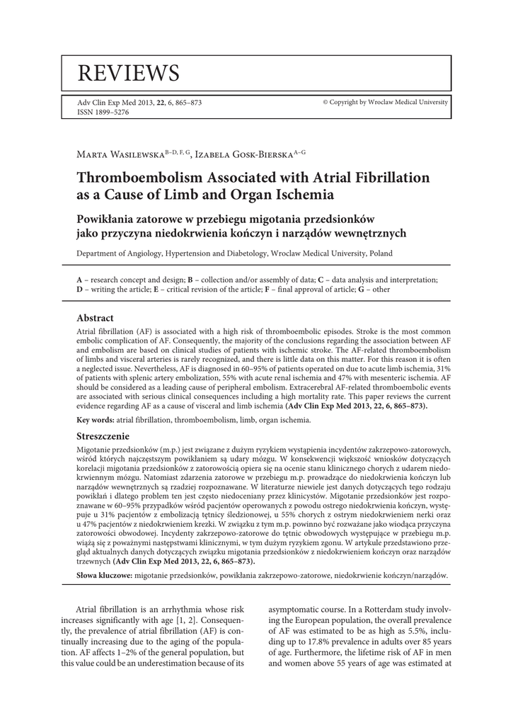 reviews Adv Clin Exp Med 2013, 22, 6, 865–873 ISSN 1899–5276 © Copyright by Wroclaw Medical University Marta WasilewskaB–D, F, G, Izabela Gosk-BierskaA–G Thromboembolism Associated with Atrial Fibrillation as a Cause of Limb and Organ Ischemia Powikłania zatorowe w przebiegu migotania przedsionków jako przyczyna niedokrwienia kończyn i narządów wewnętrznych Department of Angiology, Hypertension and Diabetology, Wroclaw Medical University, Poland A – research concept and design; B – collection and/or assembly of data; C – data analysis and interpretation; D – writing the article; E – critical revision of the article; F – final approval of article; G – other Abstract Atrial fibrillation (AF) is associated with a high risk of thromboembolic episodes. Stroke is the most common embolic complication of AF. Consequently, the majority of the conclusions regarding the association between AF and embolism are based on clinical studies of patients with ischemic stroke. The AF-related thromboembolism of limbs and visceral arteries is rarely recognized, and there is little data on this matter. For this reason it is often a neglected issue. Nevertheless, AF is diagnosed in 60–95% of patients operated on due to acute limb ischemia, 31% of patients with splenic artery embolization, 55% with acute renal ischemia and 47% with mesenteric ischemia. AF should be considered as a leading cause of peripheral embolism. Extracerebral AF-related thromboembolic events are associated with serious clinical consequences including a high mortality rate. This paper reviews the current evidence regarding AF as a cause of visceral and limb ischemia (Adv Clin Exp Med 2013, 22, 6, 865–873). Key words: atrial fibrillation, thromboembolism, limb, organ ischemia. Streszczenie Migotanie przedsionków (m.p.) jest związane z dużym ryzykiem wystąpienia incydentów zakrzepowo-zatorowych, wśród których najczęstszym powikłaniem są udary mózgu. W konsekwencji większość wniosków dotyczących korelacji migotania przedsionków z zatorowością opiera się na ocenie stanu klinicznego chorych z udarem niedokrwiennym mózgu. Natomiast zdarzenia zatorowe w przebiegu m.p. prowadzące do niedokrwienia kończyn lub narządów wewnętrznych są rzadziej rozpoznawane. W literaturze niewiele jest danych dotyczących tego rodzaju powikłań i dlatego problem ten jest często niedoceniany przez klinicystów. Migotanie przedsionków jest rozpoznawane w 60–95% przypadków wśród pacjentów operowanych z powodu ostrego niedokrwienia kończyn, występuje u 31% pacjentów z embolizacją tętnicy śledzionowej, u 55% chorych z ostrym niedokrwieniem nerki oraz u 47% pacjentów z niedokrwieniem krezki. W związku z tym m.p. powinno być rozważane jako wiodąca przyczyna zatorowości obwodowej. Incydenty zakrzepowo-zatorowe do tętnic obwodowych występujące w przebiegu m.p. wiążą się z poważnymi następstwami klinicznymi, w tym dużym ryzykiem zgonu. W artykule przedstawiono przegląd aktualnych danych dotyczących związku migotania przedsionków z niedokrwieniem kończyn oraz narządów trzewnych (Adv Clin Exp Med 2013, 22, 6, 865–873). Słowa kluczowe: migotanie przedsionków, powikłania zakrzepowo-zatorowe, niedokrwienie kończyn/narządów. Atrial fibrillation is an arrhythmia whose risk increases significantly with age [1, 2]. Consequently, the prevalence of atrial fibrillation (AF) is continually increasing due to the aging of the population. AF affects 1–2% of the general population, but this value could be an underestimation because of its asymptomatic course. In a Rotterdam study involving the European population, the overall prevalence of AF was estimated to be as high as 5.5%, including up to 17.8% prevalence in adults over 85 years of age. Furthermore, the lifetime risk of AF in men and women above 55 years of age was estimated at 866 M. Wasilewska, I. Gosk-Bierska 24.8% and 22.9%, respectively [1]. A Framingham study involving the American population placed the incidence of AF at 0.5% in the age group of 50–60 years, and 8.8% over 80 years [2]. Atrial fibrillation is associated with an increased risk of thromboembolism [3]. The thromboembolic complications of AF are an important cause of morbidity and mortality. Although the embolic complications associated with AF can affect any of the arteries, cerebral arteries are the most frequently occluded vessels. Stroke is then the most common complication of AF. Consequently, the literature database for AF embolic complications mostly concerns ischemic strokes. The information on peripheral artery embolization in the course of AF is limited and, therefore, the data pertaining to this complication is relatively poorly recognized. Most of the few studies regard AF as one of the many factors of peripheral arterial occlusion. Angiosurgical experience indicates that acute limbs and/or visceral ischemia usually occur in patients with cardiac diseases, and AF is the most frequent cause of thromboembolism. The results of existing studies suggest that clinicians may underestimate the problem of extracerebral AF-related thromboembolism, which leads to delayed or mistaken diagnosis. Risk Factors of Thromboembolic Complications Associated with Atrial Fibrillation In 2010, the European Society of Cardiology introduced new clinical guidelines for the assessment of the risk of stroke and other thromboembolic episodes. According to the new CHA2DS2-VASc score, age ≥ 75 years, history of stroke, transient ischemic attack (TIA) or other thromboembolic episodes are consider as major risk factors (worth 2 points). Non-major risk factors (worth 1 point) include congestive heart failure, left ventricular systolic dysfunction (defined as LVEF ≤ 40%), hypertension, diabetes, female gender, age 65–74 years, and vascular disease (history of myocardial infarct, atherosclerotic peripheral artery disease or complex aortic plaque). The one-year risk of stroke in 