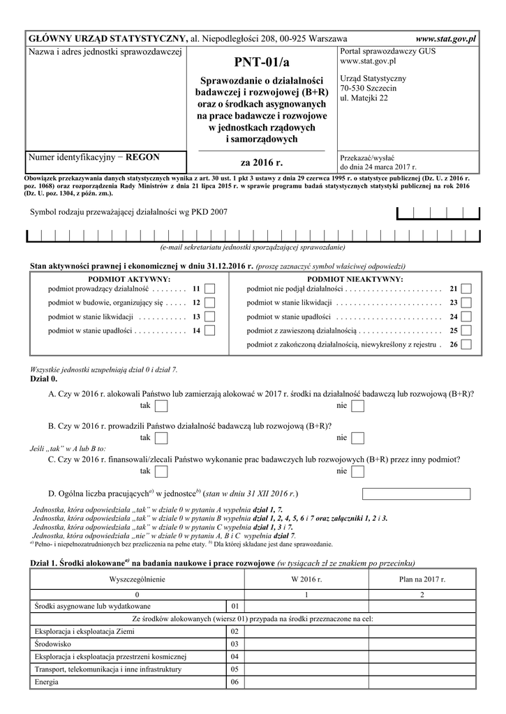 GŁÓWNY URZĄD STATYSTYCZNY, al. Niepodległości 208, 00-925 Warszawa www.stat.gov.pl Portal sprawozdawczy GUS Nazwa i adres jednostki sprawozdawczej PNT-01/a www.stat.gov.pl Sprawozdanie o działalności badawczej i rozwojowej (B+R) oraz o środkach asygnowanych na prace badawcze i rozwojowe w jednostkach rządowych i samorządowych Numer identyfikacyjny − REGON Urząd Statystyczny 70-530 Szczecin ul. Matejki 22 Przekazać/wysłać do dnia 24 marca 2017 r. za 2016 r. Obowiązek przekazywania danych statystycznych wynika z art. 30 ust. 1 pkt 3 ustawy z dnia 29 czerwca 1995 r. o statystyce publicznej (Dz. U. z 2016 r. poz. 1068) oraz rozporządzenia Rady Ministrów z dnia 21 lipca 2015 r. w sprawie programu badań statystycznych statystyki publicznej na rok 2016 (Dz. U. poz. 1304, z późn. zm.). Symbol rodzaju przeważającej działalności wg PKD 2007 (e-mail sekretariatu jednostki sporządzającej sprawozdanie) Stan aktywności prawnej i ekonomicznej w dniu 31.12.2016 r. (proszę zaznaczyć symbol właściwej odpowiedzi) PODMIOT AKTYWNY: podmiot prowadzący działalność . . . . . . . . 11 PODMIOT NIEAKTYWNY: podmiot nie podjął działalności . . . . . . . . . . . . . . . . . . . . . . 21 podmiot w budowie, organizujący się . . . . . 12 podmiot w stanie likwidacji . . . . . . . . . . . . . . . . . . . . . . . . 23 podmiot w stanie likwidacji . . . . . . . . . . . 13 podmiot w stanie upadłości . . . . . . . . . . . . . . . . . . . . . . . . 24 podmiot w stanie upadłości . . . . . . . . . . . . 14 podmiot z zawieszoną działalnością . . . . . . . . . . . . . . . . . . . 25 podmiot z zakończoną działalnością, niewykreślony z rejestru . 26 Wszystkie jednostki uzupełniają dział 0 i dział 7. Dział 0. A. Czy w 2016 r. alokowali Państwo lub zamierzają alokować w 2017 r. środki na działalność badawczą lub rozwojową (B+R)? tak nie B. Czy w 2016 r. prowadzili Państwo działalność badawczą lub rozwojową (B+R)? tak nie Jeśli „tak” w A lub B to: C. Czy w 2016 r. finansowali/zlecali Państwo wykonanie prac badawczych lub rozwojowych (B+R) przez inny podmiot? tak nie D. Ogólna liczba pracującycha) w jednostceb) (stan w dniu 31 XII 2016 r.) Jednostka, która odpowiedziała „tak” w dziale 0 w pytaniu A wypełnia dział 1, 7. Jednostka, która odpowiedziała „tak” w dziale 0 w pytaniu B wypełnia dział 1, 2, 4, 5, 6 i 7 oraz załączniki 1, 2 i 3. Jednostka, która odpowiedziała „tak” w dziale 0 w pytaniu C wypełnia dział 1, 3 i 7. Jednostka, która odpowiedziała „nie” w dziale 0 w pytaniu A, B i C wypełnia dział 7. a) Pełno- i niepełnozatrudnionych bez przeliczenia na pełne etaty. b) Dla której składane jest dane sprawozdanie. Dział 1. Środki alokowanea) na badania naukowe i prace rozwojowe (w tysiącach zł ze znakiem po przecinku) Wyszczególnienie 0 Środki asygnowane lub wydatkowane W 2016 r. Plan na 2017 r. 1 2 01 Ze środków alokowanych (wiersz 01) przypada na środki przeznaczone na cel: Eksploracja i eksploatacja Ziemi 02 Środowisko 03 Eksploracja i eksploatacja przestrzeni kosmicznej 04 Transport, telekomunikacja i inne infrastruktury 05 Energia 06 Dział 1. Środki alokowanea) na badania naukowe i prace rozwojowe (w tysiącach zł ze znakiem po przecinku)(dokończenie) Wyszczególnienie 0 a) Produkcja i technologia przemysłowa 07 Zdrowie 08 Rolnictwo 09 Edukacja 10 Kultura, rekreacja, religia i środki masowego przekazu 11 Systemy, struktury i procesy polityczne i społeczne 12 Ogólny postęp wiedzy 13 Obronność 14 W 2016 r. Plan na 2017 r. 1 2 Bezpośrednio beneficjentom. Dział 2. Finansowanie działalności B+R realizowanej w jednostce sprawozdawczej (nakłady wewnętrzne) oraz wartość aparatury naukowo-badawczej w 2016 r. (w tysiącach zł ze znakiem po przecinku) Nakłady wewnętrzne faktycznie poniesione (bez amortyzacji środków trwałych) (wiersze 02+05) Nakłady bieżące ogółema) w tym: nakłady osobowe 01 02 b) 03 c) wynagrodzenia bezosobowe Nakłady inwestycyjne ogółem (wiersze 06+07+09+10+12+13) 04 05 d) budynki i lokale, obiekty inżynierii lądowej i wodnej oraz grunty (grupy KŚT 0, 1, 2) maszyny i urządzenia techniczne (grupy KŚT 3-6)d) oraz narzędzia, przyrządy, ruchomości i wyposażenie (grupa KŚT 8)d) w tym zakup aparatury naukowo-badawczeje) z tego: środki transportu (grupa KŚT 7) d) 06 07 08 09 oprogramowanie komputerowe 10 w tym oprogramowanie stworzone na własny użytek f) 11 wartości niematerialne i prawne 12 pozostałe nakłady inwestycyjne 13 Z nakładów wewnętrznych (wiersz 01) przypada na środki (wiersze 14+15= wiersz 01) własne 14 otrzymane (wiersze 16+25) 15 podmiotów krajowych (wiersze 17+18+19+20+21+22+23+24) g) h) i) MNiSW , MR , MF , innych ministerstw JSTj) organy i jednostki im podległe lub nadzorowane z tego od: z tego od: 17 18 NCBRk), NCNl), PARPm) oraz innych agencji 19 jednostek naukowych PANn) 20 instytutów badawczycho) 21 szkół wyższych 22 przedsiębiorstw prywatnych instytucji niekomercyjnych (tj. organizacji non-profit, np. fundacji, stowarzyszeń) podmiotów z zagranicy (wiersze 26+27+28+30+31+32+33) Komisji Europejskiej p) 23 24 25 26 organizacji międzynarodowych 27 przedsiębiorstw 28 w tym z krajów Unii Europejskiej z tego od: 16 szkół wyższych instytucji rządowych (np. w ramach Mechanizmu Finansowego Europejskiego Obszaru Gospodarczego) prywatnych instytucji niekomercyjnych (tj. organizacji non-profit, np. fundacji, stowarzyszeń) pozostałych podmiotów 29 30 31 32 33 Dział 2. Finansowanie działalności B+R realizowanej w jednostce sprawozdawczej (nakłady wewnętrzne) oraz wartość aparatury naukowo-badawczej w 2016 r. (w tysiącach zł ze znakiem po przecinku) (dokończenie) Ze środków otrzymanych od instytucji dysponujących środkami publicznymi przypada na pozyskane: w ramach konkursów, grantów) i pozostałych form dotacji 34 w tym jako środki krajowe w projektach współfinansowanych ze środków Unii Europejskiej