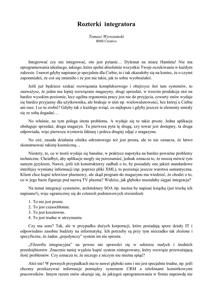 Rozterki integratora Tomasz Wyrozumski BMS Creative Integrować czy nie integrować, oto jest pytanie… Dylemat na miarę Hamleta! Nie ma oprogramowania idealnego, takiego, które spełni absolutnie wszystkie Twoje oczekiwania w każdym zakresie. I nawet gdyby napisano je specjalnie dla Ciebie, to i tak okazałoby się na koniec, że o czymś zapomniałeś, że coś się zmieniło i że jest nie takie, jak to sobie wyobrażałeś. Jeśli już będziesz szukać rozwiązania kompleksowego i obejrzysz ileś tam systemów, to zauważysz, że jeden ma lepiej rozwiązane magazyny, drugi sprzedaż, w trzecim produkcja stoi na bardzo wysokim poziomie, lecz ogólna ergonomia pracy jest nie do przyjęcia, czwarty znów wydaje się bardzo przyjazny dla użytkownika, ale brakuje w nim np. wielowalutowości, bez której u Ciebie ani rusz. I co tu zrobić? Gdyby tak z każdego wziąć, co najlepsze i gdyby jeszcze te elementy umiały się ze sobą dogadać… No właśnie, na tym polega istota problemu. A wydaje się to takie proste. Jedna aplikacja obsługuje sprzedaż, druga magazyn. Ta pierwsza pyta tę drugą, czy towar jest dostępny, ta druga odpowiada, więc pierwsza wystawia fakturę i poleca drugiej zdjąć z magazynu. No cóż, zasada działania silnika odrzutowego też jest prosta, ale to nie oznacza, że łatwo skonstruować rakietę kosmiczną… Niestety, to, co w teorii wydaje się banalne, w praktyce napotyka na bardzo poważne problemy techniczne. Chciałbyś, aby aplikacje mogły się porozumieć, jednak oznacza to, że muszą mówić tym samym językiem. Nawet, jeśli ich konstruktorzy zadbali o to, by posiadały one jakieś standardowe interfejsy wymiany informacji (np. poprzez pliki XML), to pozostaje jeszcze warstwa semantyczna. Klient chce kupić telewizor plazmowy, ale skąd program do magazynu ma wiedzieć, że chodzi o to, co w jego bazie figuruje pod nazwą TV plazma? Widzisz, jak głęboko musiałaby sięgać integracja? Na temat integracji systemów, architektury SOA itp. można by napisać książkę (już trochę ich napisano!), więc ograniczmy się do czterech podstawowych stwierdzeń: 1. 2. 3. 4. To nie jest proste. To jest czasochłonne. To jest kosztowne. To jest trudne w utrzymaniu. Czy ma sens? Tak, ale w przypadku dużych korporacji, które posiadają spore działy IT i odpowiednio zasobne budżety na informatykę. Ich potrzeby są przy tym nierzadko tak złożone i specyficzne, że żaden „pojedynczy” system im nie sprosta. „Filozofia integracyjna” na pewno nie sprawdzi się w sektorze małych i średnich przedsiębiorstw. Znacznie taniej wyjdzie kupić system zintegrowany, który rozwiąże przeważającą ilość problemów. Czy oznacza to, że niczego z niczym nie można spiąć? Ależ nie! W pewnych przypadkach ma to nawet głęboki sens i nie jest specjalnie trudne, np. jeśli chcemy przekazywać informacje pomiędzy systemem CRM a telefonami komórkowymi pracowników. Innym razem znów okazuje się, że jakiegoś oprogramowania w firmie naprawdę nie chciałoby się wymieniać, bo z różnych powodów może to spowodować spore perturbacje. Często w grę wchodzą tu programy finansowo-księgowe (np. w zewnętrznych biurach rachunkowych, choć nie tylko) lub niewielkie, bardzo specyficzne, dedykowane aplikacje, z którymi powinny „rozmawiać” inne systemy. Nie można natomiast w małych, a nawet średnich przedsiębiorstwach uczynić integracji systemów podstawą funkcjonowania infrastruktury informatycznej. Cóż odpowiemy więc Hamletowi? Integrować, ale… Nie integrować, ale…