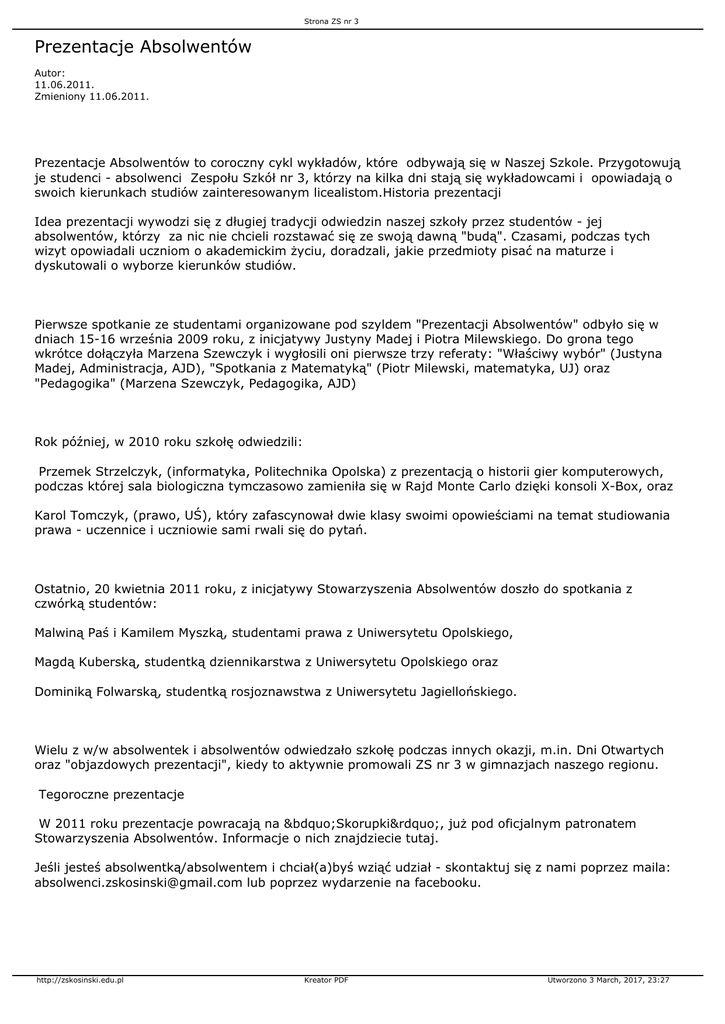 Strona ZS nr 3 Prezentacje Absolwentów Autor: 11.06.2011. Zmieniony 11.06.2011. Prezentacje Absolwentów to coroczny cykl wykładów, które odbywają się w Naszej Szkole. Przygotowują je studenci - absolwenci Zespołu Szkół nr 3, którzy na kilka dni stają się wykładowcami i opowiadają o swoich kierunkach studiów zainteresowanym licealistom.Historia prezentacji Idea prezentacji wywodzi się z długiej tradycji odwiedzin naszej szkoły przez studentów - jej absolwentów, którzy za nic nie chcieli rozstawać się ze swoją dawną "budą". Czasami, podczas tych wizyt opowiadali uczniom o akademickim życiu, doradzali, jakie przedmioty pisać na maturze i dyskutowali o wyborze kierunków studiów. Pierwsze spotkanie ze studentami organizowane pod szyldem "Prezentacji Absolwentów" odbyło się w dniach 15-16 września 2009 roku, z inicjatywy Justyny Madej i Piotra Milewskiego. Do grona tego wkrótce dołączyła Marzena Szewczyk i wygłosili oni pierwsze trzy referaty: "Właściwy wybór" (Justyna Madej, Administracja, AJD), "Spotkania z Matematyką" (Piotr Milewski, matematyka, UJ) oraz "Pedagogika" (Marzena Szewczyk, Pedagogika, AJD) Rok później, w 2010 roku szkołę odwiedzili: Przemek Strzelczyk, (informatyka, Politechnika Opolska) z prezentacją o historii gier komputerowych, podczas której sala biologiczna tymczasowo zamieniła się w Rajd Monte Carlo dzięki konsoli X-Box, oraz Karol Tomczyk, (prawo, UŚ), który zafascynował dwie klasy swoimi opowieściami na temat studiowania prawa - uczennice i uczniowie sami rwali się do pytań. Ostatnio, 20 kwietnia 2011 roku, z inicjatywy Stowarzyszenia Absolwentów doszło do spotkania z czwórką studentów: Malwiną Paś i Kamilem Myszką, studentami prawa z Uniwersytetu Opolskiego, Magdą Kuberską, studentką dziennikarstwa z Uniwersytetu Opolskiego oraz Dominiką Folwarską, studentką rosjoznawstwa z Uniwersytetu Jagiellońskiego. Wielu z w/w absolwentek i absolwentów odwiedzało szkołę podczas innych okazji, m.in. Dni Otwartych oraz "objazdowych prezentacji", kiedy to aktywnie promowali ZS nr 3 w gimnazjach naszego regionu. Tegoroczne prezentacje W 2011 roku prezentacje powracają na „Skorupki”, już pod oficjalnym patronatem Stowarzyszenia Absolwentów. Informacje o nich znajdziecie tutaj. Jeśli jesteś absolwentką/absolwentem i chciał(a)byś wziąć udział - skontaktuj się z nami poprzez maila: [email protected] lub poprzez wydarzenie na facebooku. http://zskosinski.edu.pl Kreator PDF Utworzono 3 March, 2017, 23:27