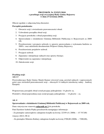 PROTOKÓŁ Nr XXXIV/2010 z przebiegu sesji zwyczajnej Rady Gminy Bojszowy w dniu 27 kwietnia 2010r. Obecni zgodnie z załączoną listą obecności. Porządek posiedzenia: 1. Otwarcie sesji i stwierdzenie prawomocności obrad. 2. Uchwalenie porządku obrad sesji. 3. Przyjęcie protokołu z obrad poprzedniej sesji. 4. Sprawozdanie z działalności Gminnej Biblioteki Publicznej w Bojszowach za 2009 rok. 5. Przedstawienie i przyjęcie uchwały w sprawie sprawozdania z wykonania budżetu za 2009 r. oraz udzielenia absolutorium Wójtowi Gminy Bojszowy. 6. Przedstawienie projektów uchwał. 7. Przyjęcie uchwał. 8. Zapytania i interpelacje radnych oraz sprawy bieżące. 9. Odpowiedzi na zapytania i interpelacje. 10. Zakończenie sesji. Przebieg sesji: Ad.1-3 Przewodniczący Rady Gminy Marek Kumor otworzył sesję, powitał radnych i zaproszonych gości oraz stwierdził prawomocność sesji – obecnych 14 radnych (nieobecny radny: Andrzej Knopek) Proponowany porządek obrad został przyjęty jednogłośnie: 14 głosów za. Protokół z obrad poprzedniej sesji został przyjęty jednogłośnie – 14 głosów – za. Ad. 4 Sprawozdanie z działalności Gminnej Biblioteki Publicznej w Bojszowach za 2009 rok. Dane statystyczne stanowią załącznik nr 1 do protokołu. Pani Dyrektor Izabela Piętka przedstawiła następujące informacje: - Za pieniądze samorządowe zakupiono książki na kwotę: 22359 zł ( 2008r. – 15 747,00) więcej o 6612, 00 zł. - Za pieniądze Ministra Kultury zakupiono książki na kwotę 2700,00 (2008r. – 7200,00), mniej o 4.500,00 zł. Wszystkie biblioteki otrzymały dotację mniejszą o 70%. W sumie na książki wydano 25398, 00 zł., więcej o 66,00 zł ( 2008r.- 25 332). - Przybyło ogółem 1075 książek, o 152 książki mniej niż w 2008r (1227 woluminów), mimo iż wydaliśmy prawie taką sama kwotę w roku 2008 i 2009. Wynika to z wysokich cen książek. - Spadła ilość czytelników o 48 osób zarejestrowanych. (1150 – 2008, 1102 – 2009) To z kolei wynika głównie z faktu, że niestety cały październik biblioteka w Bojszowach była zamknięta dla czytelników z powodu przeprowadzanej inwentaryzacji zbiorów, natomiast cały listopad inwentaryzacja była przeprowadzana w filii w Bojszowach Nowych. - Podstawowym sukcesem biblioteki jest jej przystąpienie do Programu Rozwoju Bibliotek. Program jest procesem długofalowym i ma na celu stworzenie planu rozwoju naszej biblioteki, poprzez cykliczne szkolenia odbywające się już od grudnia 2009 i trwające do nadal. Obszarem działania programu dla naszej biblioteki, jako partnerskiej, jest przede wszystkim wsparcie szkoleniowe, podnoszące kompetencje bibliotekarzy: warsztat planowania pracy biblioteki, szkolenia specjalistyczne z zakresu nowych obszarów specjalizacji biblioteki (praca z młodzieżą, z osobami niepełnosprawnymi, z dziećmi, szkolenia trenerskie... itp.), szkolenia informatyczne. Na dzień dzisiejszy stworzono analizę SWOT biblioteki, przeprowadzono ankietę badającą potrzeby kulturalne uczniów szkół średnich (uczniowie z gminy Bojszowy). Rozpoczęły się już rozmowy (ogólnopolskie) na temat tworzenia w bibliotekach publicznych BOKS-ów – Biblioteczny Ośrodek Komunikacji Społecznej. Biblioteka docelowo ma stać się centrum informacji lokalnej, centrum informacji o wszystkim! - Darmowy Internet dla biblioteki od Tp S.A. Bibliotece zostaną zwrócone koszty za opłacony abonament za Internet od listopada 2009. Internet będzie za darmo dla bibliotek przez najbliższe 3 lata (tak obowiązuje porozumienie).. - Spotkania otwarte. Po raz pierwszy w grudniu zostało zorganizowane spotkanie autorskie otwarte dla mieszkańców z pisarką Karoliną Wilczyńską. Spotkanie odbyło się o godz. 14.00, a uczestniczyło w nim 25 osób. Okazuje się, że jest potrzeba spotykania się z ludźmi kultury! Jak wiemy, takie spotkania kosztują, np. Spotkanie z Kalicińska Małgorzatą kosztuje 1000,00 zł + koszty zakwaterowania, posiłków itp. Na podstawie tego spotkania oraz ostatniego spotkania z redaktorem Janem Mazurkiewiczem (uczestniczyło w nim 15 osób) można stwierdzić, że mieszkańcy naszej gminy mają potrzebę kontaktu z ludźmi kultury, a Biblioteka może w jakimś stopniu im to umożliwić. Pytania radnych: Radny Grzegorz Sztoler: jaki jest koszt komputeryzacji katalogu książkowego? I. Piętka: jest to koszt ok. 10 tys. zł Radny G. Sztoler: jak długo trwała inwentaryzacja? I. Piętka: łącznie 2 miesiące Radny G. Sztoler: należy dofinansować GBP w celu zakupu takiego programu. Dlaczego spotkanie autorskie było organizowane o godzinie 14.00? I. Piętka: z powodów finansowych i komunikacyjnych – pani Karolina Wilczyńska zgodziła się na darmowe spotkanie, pod warunkiem, że nie będzie musiała zostawać na noc. Radny Krzysztof Ścierski: na jakiej zasadzie będzie funkcjonować centrum informacji lokalnej i jakiego typu informacje będą tam udzielane? I. Piętka: powstanie CIL jest dopiero na etapie planowania – na chwilę obecną brak jest konkretnych rozwiązań. Radny Grzegorz Tomala: w 2009r. w Filii w Bojszowach Nowych zakupiono dużo woluminów, czym to było spowodowane? Piętka: uzupełnienie to było standardowe. Wójt Gminy oraz Przewodniczący Rady Gminy podziękowali Pani Dyrektor za dobrą współpracę i życzyli dalszych sukcesów. Rada Gminy Bojszowy przyjęła sprawozdanie z działalności Gminnej Biblioteki Publicznej w Bojszowach za rok 2009. Ad 5 Przedstawienie i przyjęcie uchwały w sprawie sprawozdania z wykonania budżetu za 2009 r. oraz udzielenia absolutorium Wójtowi Gminy Bojszowy. W ustawowym terminie sprawozdanie z wykonania budżetu zostało przekazane do Regionalnej Izby Obrachunkowej w Katowicach oraz do Rady Gminy Bojszowy. W ciągu roku 2009 budżet był siedmiokrotnie aktualizowany uchwałami Rady Gminy oraz czternastokrotnie zarządzeniami Wójta. Strona dochodowa zamknęła się kwotą 17.185.246,31 zł, a strona wyda