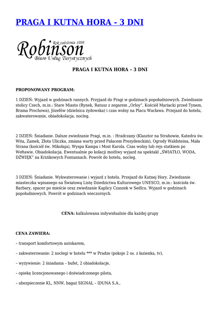 PRAGA I KUTNA HORA - 3 DNI PRAGA I KUTNA HORA – 3 DNI PROPONOWANY PROGRAM: 1 DZIEŃ: Wyjazd w godzinach rannych. Przyjazd do Pragi w godzinach popołudniowych. Zwiedzanie stolicy Czech, m.in.: Stare Miasto (Rynek, Ratusz z zegarem „Orloy”, Kościół Mariacki przed Tynem, Brama Prochowa), Józefów (dzielnica żydowska) i czas wolny na Placu Wacława. Przejazd do hotelu, zakwaterowanie, obiadokolacja, nocleg. 2 DZIEŃ: Śniadanie. Dalsze zwiedzanie Pragi, m.in. : Hradczany (Klasztor na Strahowie, Katedra św. Wita, Zamek, Złota Uliczka, zmiana warty przed Pałacem Prezydenckim), Ogrody Waldsteina, Mała Strana (kościół św. Mikołaja), Wyspa Kampa i Most Karola. Czas wolny lub rejs statkiem po Wełtawie. Obiadokolacja. Ewentualnie po kolacji możliwy wyjazd na spektakl „ŚWIATŁO, WODA, DŹWIĘK” na Kriżikowych Fontannach. Powrót do hotelu, nocleg. 3 DZIEŃ: Śniadanie. Wykwaterowanie i wyjazd z hotelu. Przejazd do Kutnej Hory. Zwiedzanie miasteczka wpisanego na Światową Listę Dziedzictwa Kulturowego UNESCO, m.in.: kościoła św. Barbary, spacer po mieście oraz zwiedzanie Kaplicy Czaszek w Sedlcu. Wyjazd w godzinach popołudniowych. Powrót w godzinach wieczornych. CENA: kalkulowana indywidualnie dla każdej grupy CENA ZAWIERA: – transport komfortowym autokarem, – zakwaterowanie: 2 noclegi w hotelu *** w Pradze (pokoje 2 os. z łazienka, tv), – wyżywienie: 2 śniadania – bufet, 2 obiadokolacje, – opiekę licencjonowanego i doświadczonego pilota, – ubezpieczenie KL, NNW, bagaż SIGNAL – IDUNA S.A., – opłaty drogowe i parkingowe, – podatek VAT. OPCJONALNE DOPŁATY: – Spektakl „Woda, Światło, Dźwięk” na Kriżikowych Fontannach: + 220 – 250 CZK/os., – Rejs statkiem po Wełtawie: + ok. 200 CZK/os., – kolacja w jednym z browarów praskich: + ok. 300 CZK/os. DODATKOWE INFORMACJE: – Program jest ramowy, kolejność zwiedzania może ulec zmianie. – Program uwzględnia wyjazd i powrót do Krakowa. – Istnieje jednak możliwość przygotowania oferty z wyjazdem z dowolnej miejscowości w Polsce. Kraków, ul. Krowoderska 8 tel.: 12 292 00 71, tel./fax: 12 292 01 78 www.robinsontravel.pl e-mail: [email protected]
