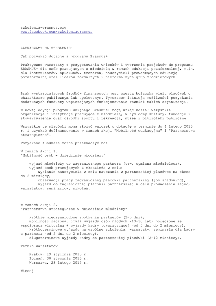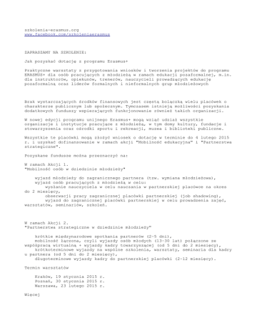 szkolenia-erasmus.org www.facebook.com/szkoleniaerasmus ZAPRASZAMY NA SZKOLENIE: Jak pozyskać dotację z programu Erasmus+ Praktyczne warsztaty z przygotowania wniosków i tworzenia projektów do programu ERASMUS+ dla osób pracujących z młodzieżą w ramach edukacji pozaformalnej, m.in. dla instruktorów, opiekunów, trenerów, nauczycieli prowadzących edukację pozaformalną oraz liderów formalnych i nieformalnych grup młodzieżowych Brak wystarczających środków finansowych jest częstą bolączką wielu placówek o charakterze publicznym lub społecznym. Tymczasem istnieją możliwości pozyskania dodatkowych funduszy wspierających funkcjonowanie również takich organizacji. W nowej edycji programu unijnego Erasmus+ mogą wziąć udział wszystkie organizacje i instytucje pracujące z młodzieżą, w tym domy kultury, fundacje i stowarzyszenia oraz ośrodki sportu i rekreacji, muzea i biblioteki publiczne. Wszystkie te placówki mogą złożyć wniosek o dotację w terminie do 4 lutego 2015 r. i uzyskać dofinansowanie w ramach akcji "Mobilność edukacyjna" i "Partnerstwa strategiczne". Pozyskane fundusze można przeznaczyć na: W ramach Akcji 1. "Mobilność osób w dziedzinie młodzieży" wyjazd młodzieży do zagranicznego partnera (tzw. wymiana młodzieżowa), wyjazd osób pracujących z młodzieżą w celu: wysłanie nauczyciela w celu nauczania w partnerskiej placówce na okres do 2 miesięcy, obserwacji pracy zagranicznej placówki partnerskiej (job shadowing), wyjazd do zagranicznej placówki partnerskiej w celu prowadzenia zajęć, warsztatów, seminariów, szkoleń. W ramach Akcji 2. "Partnerstwa strategiczne w dziedzinie młodzieży" krótkie międzynarodowe spotkania partnerów (2–5 dni), mobilność łączona, czyli wyjazdy osób młodych (13–30 lat) połączone ze współpracą wirtualną + wyjazdy kadry towarzyszącej (od 5 dni do 2 miesięcy), krótkoterminowe wyjazdy na wspólne szkolenia, warsztaty, seminaria dla kadry u partnera (od 5 dni do 2 miesięcy), długoterminowe wyjazdy kadry do partnerskiej placówki (2–12 miesięcy). Termin warsztatów Kraków, 19 stycznia 2015 r. Poznań, 30 stycznia 2015 r. Warszawa, 23 lutego 2015 r. Więcej ➲ Na szkoleniu dowiedzą się Państwo: jakich formalności należy dopełnić, żeby złożyć wniosek w najbliższym terminie – 4 lutego 2015 r. dla akcji: "Mobilność osób pracujących z młodzieżą", "Wymiany młodzieżowe" oraz "Partnerstwa strategiczne", jak napisać wniosek, żeby mieć gwarancję pozyskania środków – ekspert napisze z Państwem przykładowy wniosek z wykorzystaniem formularza ERASMUS+ oraz wyjaśni wszystkie kruczki/zawiłości formalne, w jaki sposób pozyskać partnera projektu oraz jakie kryteria musi spełniać partner, jak krok po kroku stworzyć projekt wykorzystania grantu z akcji "Mobilność osób pracujących z młodzieżą", "Wymiany młodzieżowe", "Partnerstwa strategiczne", jak sfinansować koszty zarządzania projektem (np. osób dedykowanych do pisania wniosków, rozliczania i raportowania realizacji projektu) z przyznanych środków, jakich formalności należy dopełnić, żeby złożyć wniosek w najbliższym terminie – 4 lutego 2015 r. jak rozpisać budżet, aby sfinansować 100% kosztów projektu oraz wygospodarować dodatkowe fundusze na cele własne placówki np. związane z doposażeniem. ➲ TRENERZY dr Małgorzata Kasperczakowa Założycielka pracowni Edytorium.pl. Specjalista w zakresie pozyskiwania dodatkowych źródeł finansowania dla placówek oświatowych. Praktyk z bogatym doświadczeniem w opracowywaniu projektów, wniosków, raportów i sprawozdań finansowych. Koordynator projektów. Autorka kilkudziesięciu wniosków o fundusze z Comeniusa i jego następcy – programu ERASMUS+. Katarzyna Dobrzelewska Ekspert z pracowni Edytorium.pl z wieloletnim doświadczeniem w opracowywaniu projektów, wniosków, raportów i sprawozdań finansowych w programach mobilnościowych. Prowadzi w całej Polsce praktyczne warsztaty z tworzenia projektów i pisania wniosków w programie Erasmus+. zobacz więcej i zapisz się >>> ================================================================================ ============================== http://szkolenia-erasmus.org/mlodziez ================================================================================ ============================== Ramowy program szkolenia Możliwości wykorzystania funduszy ERASMUS+ przez organizację lub placówkę pracującą z młodzieżą: rozwój umiejętności i podniesienie kwalifikacji osób, które pracują z młodzieżą; wymiany doświadczeń pomiędzy organizacjami i instytucjami, które zajmują się młodzieżą w czasie wolnym od nauki współpraca międzynarodowa w celu wymiany doświadczeń, stosowanych rozwiązań, poznania nowych metod pracy, stworzenia programu czy narzędzia do pracy z młodzieżą wymiana młodzieży - spotkanie co najmniej dwóch grup rówieśników z dwóch różnych krajów; każdy interesujący temat może być wystarczającym powodem do spotkania; to czas na zdobywanie doświadczeń poza murami szkoły czy uczelni Zasady korzystania z nowego programu unijnego ERASMUS+ obowiązującego od 2014 r. które placówki mogą skorzystać z funduszy i jakie kryteria musi spełniać placówka w ilu projektach placówka może uczestniczyć jednocześnie jaka jest maksymalna kwota dofinansowania projektu zdefiniowanie konkretnych potrzeb placówki, które może zaspokoić program Praktyczne warsztaty z pisania wniosku o dotację - przygotowanie do złożenia wniosku w najbliższym terminie – 4 lutego 2015 r. rejestracja w bazie ECAS, na portalu użytkownika i w systemie URF wymagana dokumentacja formalna dla różnych typów placówek wypełnianie wniosku krok po kroku ze szczególnym uwzględnieniem kryteriów, jak mierzenie stopnia (ilościowe i jakościowe) realizacji celów projektu, rozpowszechnianie itp. najczęstsze błędy w przygotowaniu wniosków 