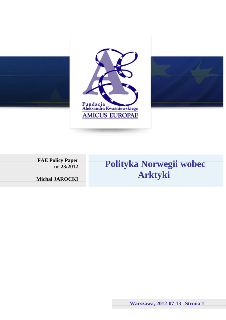 FAE Policy Paper nr 23/2012 Michał JAROCKI Polityka Norwegii wobec Arktyki Warszawa, 2012-07-13 | Strona 1 Polityka Norwegii wobec Arktyki FAE Policy Paper nr 23/2012 Michał Jarocki Polityka Norwegii wobec Arktyki motywowana jest wieloma czynnikami. Jednym z najważniejszych jest postępujące topnienie arktycznej pokrywy lodowej, będące bezpośrednim skutkiem zmian klimatycznych w regionie. Nie mniej ważnym powodem są bogate złoża surowców energetycznych, takich jak ropa naftowa czy gaz ziemny. Równie istotną kwestią są spore ławice ryb, które znajdują się na wodach kontrolowanych przez norweskie władze. Nie bez znaczenia pozostanie również kwestia środowiskowa, która w kontekście zwiększonego zainteresowania regionem ze strony państw trzecich, nabiera dużego znaczenia. Ze względu na rosnącą dostępność obszarów arktycznych, norweska polityka względem regionu nabrała w ostatnich latach wyraźnego przyspieszenia. Z jednej strony zjawisko to zostało spowodowane chęcią zabezpieczenia wpływów Oslo w regionie. Z drugiej zaś wymuszone poprzez zmieniające się uwarunkowania międzynarodowe oraz wzrost zainteresowania Arktyką ze strony innych podmiotów. Realizacja podstawowych założeń norweskiej polityki względem regionu będzie uzależniona od rozsądnego zagospodarowania szeregu narzędzi, jakimi dysponuje Oslo. Najważniejszym z nich są kwestie prawne oraz polityczne, zwłaszcza w wymiarze międzynarodowym. Istotne mogą okazać się również rozwiązania militarne. Wykorzystane zostaną też zapewne argumenty natury społecznej oraz ekologicznej. Sukces norweskiej strategii wobec Arktyki uzależniony będzie także od czynników zewnętrznych. Region znajduje się w polu zainteresowań czterech pozostałych państw regionu. Swoją aktywność na obszarach Dalekiej Północy systematycznie zwiększają też podmioty trzecie, geograficznie z nią nie związane. Z tego powodu Oslo będzie musiało uwzględnić aspekt międzynarodowy jako istotny, a być może nawet kluczowy czynnik realizowanej przez siebie polityki. Uwarunkowania W odróżnieniu od pozostałych państw tzw. Arktycznej Piątki (Danii, Kanady, Norwegii, Rosji oraz Stanów Zjednoczonych, A5), podstawowym wyznacznikiem norweskiej polityki w regionie nie jest zjawisko zmian klimatycznych. Aktywność Norwegii na wodach północnych, Warszawa, 2012-07-13 | Strona 2 Polityka Norwegii wobec Arktyki FAE Policy Paper nr 23/2012 Michał Jarocki rozumianych w tym kontekście nie tylko w postaci Morza Barentsa, lecz także Morza Norweskiego i Morza Północnego, datowana była na długo, zanim proces ocieplania klimatu zaczął być dostrzegalny na obecną skalę. Aktywność Norwegii na obszarach północnych sięga bowiem drugiej połowy zeszłego stulecia, a jej podstawowym wyznacznikiem były względy energetyczne. Zarówno Morze Norweskie, jak i Morze Północne, dysponowały w tamtym okresie bogatymi pokładami surowców energetycznych, takich jak ropa naftowa i (przede wszystkim) gaz ziemny. Strategia zaangażowania wysiłków politycznych (ale także i ekonomicznych) na obydwu obszarach koncentrowała się wobec tego na kwestiach eksploatacji złóż. Proces ten doprowadził jednak w ostatnim czasie do ich gwałtownego kurczenia. Sytuacja jest na tyle poważna, iż bez uruchomienia wydobycia z nowych studni, Norwegia może w niedługim czasie zostać zmuszona do znacznego ograniczenia produkcji surowców energetycznych. Ratunkiem może okazać się obszar Morza Barentsa. Ten najbardziej wysunięty na wschód akwen kontrolowany przez Oslo, zawiera w sobie ogromne pokłady ropy naftowej i gazu ziemnego. Jednak ze względu na panujące jeszcze do niedawna warunki klimatyczne w regionie, ich eksploatacja była wyjątkowo mało opłacalna. Postępująca zmiana uwarunkowań pogodowych w ostatnich latach pozwoliła jednak na rozpoczęcie serii badań geologicznych w celu zlokalizowania złóż, a także na pierwsze realne odwierty. Obok kwestii energetycznych związanych z regionem arktycznym, norweska polityka koncentruje się także na problemie ochrony środowiska. Władze w Oslo zdają sobie sprawę z faktu, iż wzrost aktywności czynnika ludzkiego na Dalekiej Północy stanowi potencjalne zagrożenie dla lokalnej fauny i flory. Norwegia obawia się przede wszystkim negatywnych skutków działań związanych z eksploatacją podmorskich złóż surowcowych, a także natężeniem żeglugi morskiej po wodach Oceanu Arktycznego. Nie mniej istotna z perspektywy Norwegii jest również kwestia eksploatacji innych zasobów naturalnych regionu. Wody północne stanowią bowiem idealne środowisko życia dla sporych pokładów różnych gatunków ryb. Wskutek postępujących zmian klimatycznych Norwegowie będą w stanie rozszerzyć zakres terytorialny połowów o nowe obszary, odciążając tym samym mocno już wyeksploatowane skupiska na pozostałych dwóch akwenach. Warszawa, 2012-07-13 | Strona 3 Polityka Norwegii wobec Arktyki FAE Policy Paper nr 23/2012 Michał Jarocki Cele W odniesieniu do zaprezentowanych powyżej uwarunkowań norweskiej polityki arktycznej, Oslo stawia sobie szereg celów, związanych z aktywnością na obszarze Dalekiej Północy. Podstawowym z nich jest kwestia utrzymania stałego poziomu produkcji surowców energetycznych, rozumianej jako eksploatacja podmorskich złóż ropy naftowej i gazu ziemnego. Aby tego dokonać, Norwegia musi zabezpieczyć dostęp do akwenów, które są potencjalnie bogate w tego typu zasoby, a które nie zostały do tej pory naruszone przez procesy wydobywcze. Cel ten wiąże się z koniecznością prowadzenia aktywnej polityki regionalnej, w stosunku do tych odcinków Oceanu Arktycznego, wobec których Norwegia ma prawo zwierzchnictwa lub też takie prawo sobie rości. Zmusza to władze w Oslo z jednej strony do przygotowania odpowiedniego zestawu argumentów potwierdzających własne aspiracje terytorialnie. Z drugiej, skłania do nieus