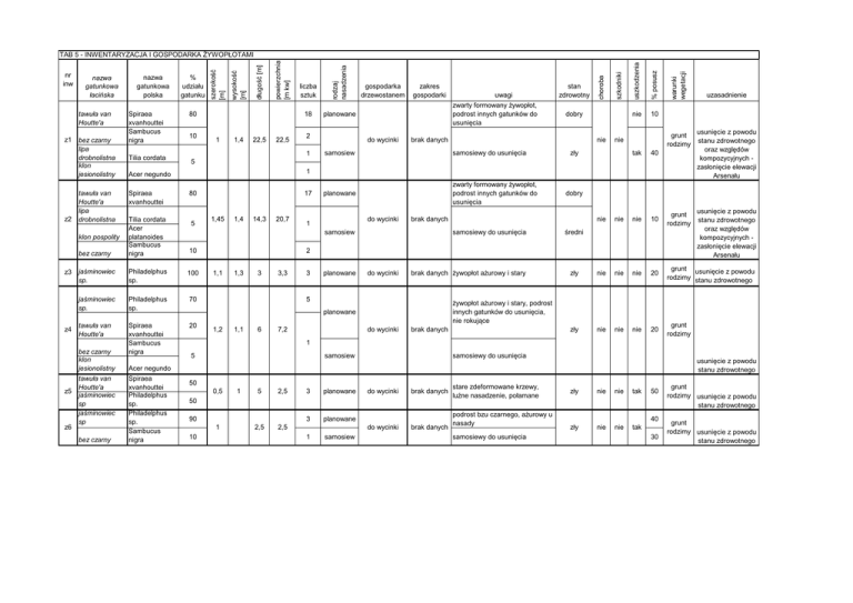 z1 z2 bez czarny lipa drobnolistna klon jesionolistny tawuła van Houtte'a lipa drobnolistna z4 z5 z6 Tilia cordata 10 1 1,4 22,5 22,5 do wycinki dobry brak danych nie samosiew samosiewy do usunięcia planowane zwarty formowany żywopłot, podrost innych gatunków do usunięcia nie 10 grunt rodzimy nie zły warunki wegetacji % posusz zwarty formowany żywopłot, podrost innych gatunków do usunięcia stan zdrowotny szkodniki uwagi choroba rodzaj nasadzenia zakres gospodarki tak 40 1 80 Philadelphus sp. 100 jaśminowiec sp. Philadelphus sp. 70 tawuła van Houtte'a Spiraea xvanhouttei Sambucus nigra 20 Acer negundo Spiraea xvanhouttei Philadelphus sp. Philadelphus sp. Sambucus nigra gospodarka drzewostanem planowane 2 1 jaśminowiec sp. bez czarny 18 Acer negundo Spiraea xvanhouttei liczba sztuk 5 bez czarny bez czarny klon jesionolistny tawuła van Houtte'a jaśminowiec sp jaśminowiec sp powierzchnia [m kw] 80 Tilia cordata Acer platanoides Sambucus nigra klon pospolity z3 Spiraea xvanhouttei Sambucus nigra % udziału gatunku uszkodzenia tawuła van Houtte'a nazwa gatunkowa polska długość [m] nazwa gatunkowa łacińska wysokość [m] nr inw szerokość [m] TAB 5 - INWENTARYZACJA I GOSPODARKA ŻYWOPŁOTAMI 5 17 1,45 1,4 14,3 20,7 do wycinki 1 samosiewy do usunięcia 10 1,3 3 3,3 3 planowane do wycinki brak danych żywopłot ażurowy i stary 5 nie nie 10 grunt rodzimy zły nie nie nie 20 grunt usunięcie z powodu rodzimy stanu zdrowotnego zły nie nie nie 20 grunt rodzimy średni żywopłot ażurowy i stary, podrost innych gatunków do usunięcia, nie rokujące planowane 1,2 1,1 6 7,2 do wycinki brak danych usunięcie z powodu stanu zdrowotnego oraz względów kompozycyjnych zasłonięcie elewacji Arsenału nie 2 1,1 usunięcie z powodu stanu zdrowotnego oraz względów kompozycyjnych zasłonięcie elewacji Arsenału dobry brak danych samosiew uzasadnienie 1 5 samosiew samosiewy do usunięcia 50 0,5 1 5 2,5 3 planowane 3 planowane do wycinki brak danych 50 90 1 10 2,5 2,5 do wycinki 1 samosiew brak danych stare zdeformowane krzewy, luźne nasadzenie, połamane podrost bzu czarnego, ażurowy u nasady samosiewy do usunięcia usunięcie z powodu stanu zdrowotnego zły nie nie tak zły nie nie tak 50 40 30 grunt rodzimy usunięcie z powodu stanu zdrowotnego grunt rodzimy usunięcie z powodu stanu zdrowotnego tawuła van Houtte'a bez czarny Spiraea xvanhouttei Sambucus nigra 90 11,4 51 21,4 z7 klon jesionolistny 16,9 z8 bez czarny lekko ażurowy u podstawy, z podrostem klonu jesionolistnego i bzu czarnego, rozsada 0,6m w dwóch rzędach brak danych nie samosiewy do usunięcia nie grunt rodzimy nie zły 2 Acer negundo Sambucus nigra 36 1,5 1,8 Tilia cordata z9 30 1,3 15 25,7 5 planowane do wycinki 3 2 lekko ażurowy u nasady, z podrostem lipy drobnolistnej, klonu jesionolistnego i bzu czarnego, rozsada 0,7 m w dwóch rzędach brak danych samosiew nie średni nie samosiewy do usunięcia nie zły z10 10 tak 20 3 100 0,7 0,5 21,4 15 71 planowane do wycinki *4 ażurowy żywopłot średni nie nie tak 30 100 0,7 0,5 9,7 6,8 32 planowane do wycinki *4 ażurowy żywopłot średni nie nie tak 20 średni *4 Stary żywopłot, ażurowy u podstawy, z licznymi ubytkami, dosyc ładnie uformowany u góry nie nie tak irga błyszcząca 85 głóg jednoszyjkowy grab pospolity bez czarny 1 100 Ligustrum ligustr pospolity vulgare klon z13 jesionolistny Acer negundo Sambucus bez czarny nigra głóg jednoszyjkowy 24,2 25,2 1 1,4 23,4 planowane do wycinki 8 4 23,4 96 78 samosiewy do usunięcia planowane do wycinki *4 118 2,4 1,4 24,6 58,6 5 Stary żywopłot, ażurowy u podstawy, dosyc ładnie uformowany u góry 15 zły usunięcie z powodu stanu zdrowotnego grunt usunięcie z powodu rodzimy stanu zdrowotnego średni nie nie tak 10 planowane do wycinki *2 dobry nie nie nie 15 średni nie nie nie 30 Podrost do usunięcia 1,5 16,9 26,1 56 grunt rodzimy 20 30 7 1,5 grunt usunięcie z powodu rodzimy stanu zdrowotnego oraz względów kompozycyjnych zasłonięcie elewacji Arsenału usunięcie z powodu grunt zmiany rodzimy zagospodarowanie usunięcie z powodu grunt zmiany rodzimy zagospodarowania Zwarty, ładny, stary żywopłot 2 100 Crataegus sp. 66 23,2 1,4 10 5 z12 głóg jednoszyjkowy z14 23,2 usunięcie z powodu stanu zdrowotnego oraz względów kompozycyjnych zasłonięcie elewacji Arsenału 5 irga błyszcząca z11 warunki wegetacji 5 średni Acer negundo Spiraea xvanhouttei uzasadnienie 20 do wycinki samosiew 31,4 % posusz uszkodzenia stan zdrowotny szkodniki uwagi choroba zakres gospodarki planowane 20,8 85 tawuła van Houtte'a lipa drobnolistna klon jesionolistny gospodarka drzewostanem 3 1,3 5 liczba sztuk rodzaj nasadzenia % udziału gatunku powierzchnia [m kw] nazwa gatunkowa polska długość [m] nazwa gatunkowa łacińska wysokość [m] nr inw szerokość [m] TAB 5 - INWENTARYZACJA I GOSPODARKA ŻYWOPŁOTAMI planowane do wycinki *4 Stary żywopłot, ażurowy u podstawy, dosyc ładnie uformowany u góry grunt rodzimy usunięcie z powodu wytycznych konserwatorskich grunt usunięcie z powodu rodzimy wytycznych konserwatorskich 35 52,1 Lekko ażurowy u podstawy, będzie wymagał uzupełnienia do wycinki 7 99 nie 30 1,8 1,15 34,7 172 planowane 1,8 1,15 100 1,0 0,30,5 34,7 72,5 100 0,4 0,6 100 0,7 Ligustrum ligustr pospolity vulgare 100 Ligustrum ligustr pospolity vulgare do wycinki *2 warunki wegetacji nie Podrost do usunięcia średni Stary dosyc zwarty żywopłot ligustrowy dobry nie nie nie 15 Podrost do usunięcia dobry nie nie nie 15 dobry nie nie nie 15 ażurowy z ubytkami, rozsada 0,4 zły tak nie tak 30 30 6 60,8 1 nie uzasadnienie dobry *4 samosiew 3 stan zdrowotny % posusz 1,15 uwagi uszkodzenia 1,5 planowane zakres gospodarki szkodniki z18 7 117 gospodarka drzewostanem choroba Crataegus sp. Carpinus z15 grab pospolity betulus Sambucus bez czarny nigra Ligustrum ligustr pospolity vulgare z16 Sambucus bez czarny nigra Spiraea tawuła z17 japońska japonica 90 liczba sztuk rodzaj nasadzenia głóg jednoszyjk