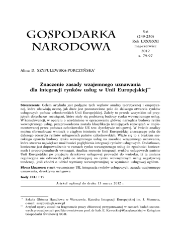 GOSPODARKA NARODOWA 5-6 (249-250) Rok LXXX/XXI maj-czerwiec 2012 s. 79-97 Alina D. SZYPULEWSKA-PORCZYŃSKA* Znaczenie zasady wzajemnego uznawania dla integracji rynków usług w Unii Europejskiej** Streszczenie: Celem artykułu jest podjęcie tych wątków analizy teoretycznej i empirycznej, które ułatwiają ocenę, jak duże jest pozostawione pole do dalszego otwarcia rynków usługowych państw członkowskich Unii Europejskiej. Zależy to przede wszystkim od przyjętych dotychczas rozwiązań, które stały się podstawą budowy rynku wewnętrznego usług. W konsekwencji, w oparciu o wyróżnione w opracowaniu główne narzędzia budowy rynku wewnętrznego usług, przeprowadzona została klasyfikacja istniejących rozwiązań w implementowanej przez państwa członkowskie UE tzw. dyrektywie usługowej. W świetle analizy można sformułować wniosek o ciągłym istnieniu w Unii Europejskiej znaczącego pola do dalszego otwarcia rynków usługowych państw członkowskich. Wiąże się to z brakiem szerokiego oparcia budowy rynku wewnętrznego usług na zasadzie wzajemnego uznawania, która stwarza największe możliwości pogłębienia integracji rynków usługowych. Dodatkowo, konieczne jest doprowadzenie w ramach rynku wewnętrznego usług do zgodności koniecznych i proporcjonalnych wymagań. Analiza rozwoju integracji rynków usługowych państw Unii Europejskiej po przyjęciu dyrektywy usługowej prowadzi do wniosku, iż ta zmiana regulacyjna nie odwróciła póki co istniejącej na rynku wewnętrznym usług negatywnej tendencji, jeśli chodzi o udział wymiany wewnątrzunijnej w wymianie usługowej ogółem. Słowa kluczowe: rynek wewnętrzny UE, integracja rynków usługowych, zasada wzajemnego uznawania, dyrektywa usługowa Kody JEL: F15 Artykuł wpłynął do druku 13 marca 2012 r. * ** Szkoła Główna Handlowa w Warszawie, Katedra Integracji Europejskiej im. J. Monneta, e-mail: [email protected] Artykuł oparty został na fragmencie pracy zbiorowej przygotowanej w ramach badań statutowych prowadzonych pod kierownictwem prof. dr hab. E. Kaweckiej-Wyrzykowskiej w Kolegium Gospodarki Światowej SGH. 80 GOSPODARKA NARODOWA Nr 5-6/2012 Uwagi wstępne Scalenie krajowych rynków państw członkowskich Unii Europejskiej w jeden wspólny rynek stanowiło jeden z głównych celów Unii od początków jej powstania. Po ponad pięćdziesięciu latach integracji pozostaje nadal centralnym celem integracji gospodarczej, mimo różnych nazw, jakie na przestrzeni tego okresu mu nadawano [Komisja Europejska, 2011a]1. U podstaw tych dążeń leży przekonanie o gospodarczych korzyściach płynących z integrowania gospodarek, szeroko wyjaśnionych w teorii integracji gospodarczej. Tworzenie rynku wewnętrznego oparte było zawsze na godzeniu dwóch odmiennych rozwiązań. Jedno polegało na zachowaniu istniejących różnic między krajami. Uzasadnienie takiego podejścia może być co najmniej dwojakie. Po pierwsze, różnice mogą być źródłem korzyści. Na tym opiera się klasyczne postrzeganie handlu międzynarodowego. Po drugie, różnice mogą być nieistotne, z punktu widzenia osiągnięcia stawianych celów. W innym przypadku, tzn. kiedy różnice w sposób istotny, ale i negatywny wpływają na integrację, stosuje się drugie rozwiązanie, polegające na ograniczeniu tych różnic2. Rynki usługowe są przykładem sektora gospodarczego, gdzie problem heterogeniczności występuje z całą jaskrawością pod postacią zróżnicowanych regulacji warunkujących dostęp do rynku, czy późniejsze świadczenie usług. Jednym z kluczowych narzędzi radzenia sobie z tym wyzwaniem jest zasada wzajemnego uznawania. To dlatego zwolennicy szerszego otwarcia krajowych rynków usługowych w ramach UE wiązali duże nadzieje z pierwszą w dziejach rynku wewnętrznego horyzontalną regulacją dotyczącą usług. Tymczasem funkcjonująca w większości państw UE od końca 2009 r. Dyrektywa dotycząca usług na rynku wewnętrznym, powszechnie określana mianem dyrektywy usługowej [EUR-Lex, Dyrektywa 2006/123/WE], uchwalona została w postaci znacznie różniącej się od pierwotnej propozycji Komisji Europejskiej3. 1 2 3 W opublikowanym w pierwszym półroczu 2011 roku Akcie o jednolitym rynku, zawierającym „Dwanaście dźwigni na rzecz pobudzenia wzrostu gospodarczego i wzmocnienia zaufania”, Komisja Europejska powołuje się na konkluzje wiosennego szczytu Rady Europejskiej, w których jednolitemu rynkowi przypisano „do odegrania kluczową rolę w zapewnianiu wzrostu i zatrudnienia oraz promowaniu konkurencyjności”. W kontekście kryzysu mającego miejsce w niektórych krajach strefy euro, szczególnej uwagi wymagają też prace wskazujące na pozytywne znaczenie reform rynków usługowych dla procesów dostosowawczych w krajach unii walutowej. Na ten temat zob. np. European Commission [2008], How product market reforms lubricate shock adjustment in the euro area, European Economy, Economic Papers 341, October 2008. Jest to uproszczenie przyjęte głównie dla jasności wywodu. Problemy związane z efektywnym funkcjonowaniem rynku wewnętrznego mogą wystąpić nawet przy braku różnic. Będzie to miało miejsce w szczególności, kiedy kraje wymagają od zagranicznych usługodawców spełnienia określonych warunków, nawet jeśli sprostali oni wcześniej takim wymaganiom na rynku innego kraju. Warto przypomnieć, iż prace nad dyrektywą zbiegły się z debatą nad europejskim traktatem konstytucyjnym. Negocjacjom towarzyszyły burzliwe demonstracje w miastach Unii Europejskiej. We Francji spopularyzowane zostało w owym czasie wyrażenie „polski hydraulik”, obrazujące obawę przeciwników liberalizacji rynków usługowych przed dumpingiem socjalnym ze strony gorzej opłacanych pracowników z biedniejszych nowych 10 krajów członkowskich UE. Alina D. Szypulewska-Porczyńska, Znaczenie zasady wzajemnego uznawania... 81 Nie tylko ograniczony został zakres regulacji4. Przed