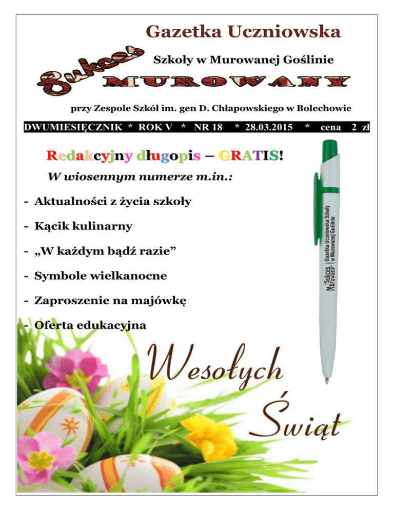 Gazetka Uczniowska Szkoły w Murowanej Goślinie przy Zespole Szkół im. gen D. Chłapowskiego w Bolechowie DWUMIESIĘCZNIK * ROK V * NR 18 * 28.03.2015 Redakcyjny długopis – GRATIS! W wiosennym numerze m.in.: - Aktualności z życia szkoły - Kącik kulinarny - „W każdym bądź razie” - Symbole wielkanocne - Zaproszenie na majówkę - Oferta edukacyjna * cena 2 zł Sukces Murowany 28 marca 2015 Podziękowania Drodzy Czytelnicy „Sukcesu Murowanego”! Jako redaktor naczelny chciałbym Wam bardzo serdecznie podziękować za miłe słowa, które wypowiadaliście na temat każdego naszego wydania. Nadchodzi taki moment by zakończyć pewien rozdział w swoim życiu. Dla mnie ta chwila właśnie nadeszła. Kończy się moja misja – przygotowywania gazetki szkolnej. Już za kilka tygodni opuszczę mury tej szkoły, w której wiele się dzieje i to każdego dnia. Przestanę pełnić obowiązki redaktora naczelnego. Były bardzo odpowiedzialne, dlatego tak bardzo je polubiłem. Życie nie lubi pustki. W związku z tym, kolejne wydanie ukaże się dzięki pracy nowego zespołu, na czele którego stanie doświadczona i solidna osoba, z którą osobiście miałem okazję współpracować. W tym miejscu chcę podziękować wszystkim osobom, z którymi wspólnie tworzyłem każde wydanie. Byłem jedynym mężczyzną w całym składzie – to dla mnie wielki zaszczyt. Szkoda, że tracę fantastyczny zespół, na którym zawsze mogłem polegać. Dziękuję Wam bardzo serdecznie. Mateusz Jarzyński 2 Sukces Murowany 28 marca 2015 „W każdym bądź razie” – czyli językowy przesyt w modzie Wyrażenie, które widnieje powyżej jest częste w języku osób publicznych, zarówno lokalnych, zaściankowych, państwowych, nie wykluczając również środowisk często nawet dziennikarskich, akademickich, szkolnych, czy nawet tekstów homilii czy kazań. Jest to związek, który należy usytuować na pograniczu frazeologii i łączliwości wyrazów. Ważne jest, że „w każdym bądź razie” jest sytuowane jako forma oboczna lub błędne użycie wyrażenia „w każdym razie”, a rzadziej również „bądź co bądź”. „W każdym razie” jest definiowane na różne sposoby: tak czy owak, jednakże; niezależnie od wszystkiego innego, bez względu na okoliczności, sytuację, tak czy inaczej; mimo wszystko; ostatecznie, jak by nie było, było nie było; niezależnie od wszystkiego innego. Wyrażenie to jest zestawiane pod hasłem „każdy” z wyrażeniami typu: na każdym kroku, w każdym calu, za każdym razem, w każdym wypadku. „Bądź co bądź” z kolei, definiowane jest podobnie lub wprost identycznie jak wyrażenie „ w każdym razie”, na przykład jako: jednak, w końcu, ostatecznie, w każdym razie, przecież; mimo wszystko, jak by nie było, było nie było; który bądź, którykolwiek. Wobec powyższego „bądź co bądź” to wyrażenie za pomocą którego podkreślamy, że stan rzeczy jest taki, jak mówimy, a nie jak ktoś mógłby przypuszczać. Podobnie jest w przypadku wyrażenia „w każdym razie”, którego używamy, aby wyrazić precyzyjniej to, co zostało powiedziane lub podsumować to. Charakterystycznym jest też fakt, że oba wyrażenia są wzajemnie definiowalne, co świadczy o bardzo bliskim 3 Sukces Murowany 28 marca 2015 sąsiedztwie semantycznym, jeśli nie nawet o tożsamości znaczeniowej. Świadczą o tym również przykłady podawane w poradnikach i słownikach (W każdym razie postanowił odwoływać się od wyroku. Nie wiem, jakie są twoje plany, w każdym razie ja idę do kina. Tym magnesem w każdym razie są pieniądze. Dla mieszkańców tej zabitej dechami wioski było to bądź co bądź nie lada wydarzenie. Jest to bądź co bądź największy koncert rockowy jaki kiedykolwiek odbył się w naszym mieście. Dzieje się to w bądź co bądź cywilizowanym kraju i na oczach całego świata). Wyrażenia te mogą w wielu przypadkach być używane zamiennie, choć czasem wymaga to zmiany kolejności składników w zdaniu. Analiza wyrażeń „w każdym razie” oraz „bądź co bądź” zdaje się sugerować powstanie omawianego związku, jakim jest „w każdym bądź razie”. Widzimy w jego budowie wyraźnie składniki obu tych wyrażeń, gdzie pierwszy występuje w całości i zostaje wzmocniony wyrazem „bądź”. Wobec tego „w każdym bądź razie” należy uznać za innowację (nowinkę językową) nawiązującą, która charakteryzuje się tym, że powstała w skutek nawiązania do innych elementów, w tym przypadku pokrewnych znaczeniowo. Wyrażenie to jest szczególnym typem innowacji nawiązujących, jest wynikiem przemieszania części dwóch istniejących dotąd elementów językowych- „w każdym razie” oraz „bądź co bądź” (a więc nawiązania do każdej z nich). Rozpoznajemy więc szczególny rodzaj innowacji nawiązujących, zwanych dość „mądrze” kontaminacją językową. W istocie jednak, zjawisko to jest proste i dość częste w języku potocznym: przywiązywać do czegoś znaczenie → przywiązywać wagę x mieć znaczenie, przywiązywać do czegoś uwagę → przywiązywać do czegoś wagę x zwracać na coś uwagę, odnieść porażkę → ponieść porażkę x 4 Sukces Murowany odnieść zwycięstwo, 28 marca 2015 zawieszenie ognia → zawieszenie broni x wstrzymanie ognia. Należy więc uznać, że omawiane wyrażenie jest również kontaminacją związków na pograniczu frazeologii i łączliwości wyrazów: w każdym bądź razie → w każdym razie x bądź co bądź. Wiele podobnych połączeń z wyrazem „każdy” stosujemy w uzusie za pośrednictwem języka niemieckiego. Kilka połączeń tego wyrazu odczuwa się jako germanizmy. Dotyczy to zwłaszcza niewłaściwego użycia wyrazu „każdy” zamiast tradycyjnego „wszelki” oraz niepotrzebnego wzmacniania wyrazu „każdy” wyrazami: „jeden” lub „poszczególny”: za każdą cenę → um jeden Preis, zamiast: za w