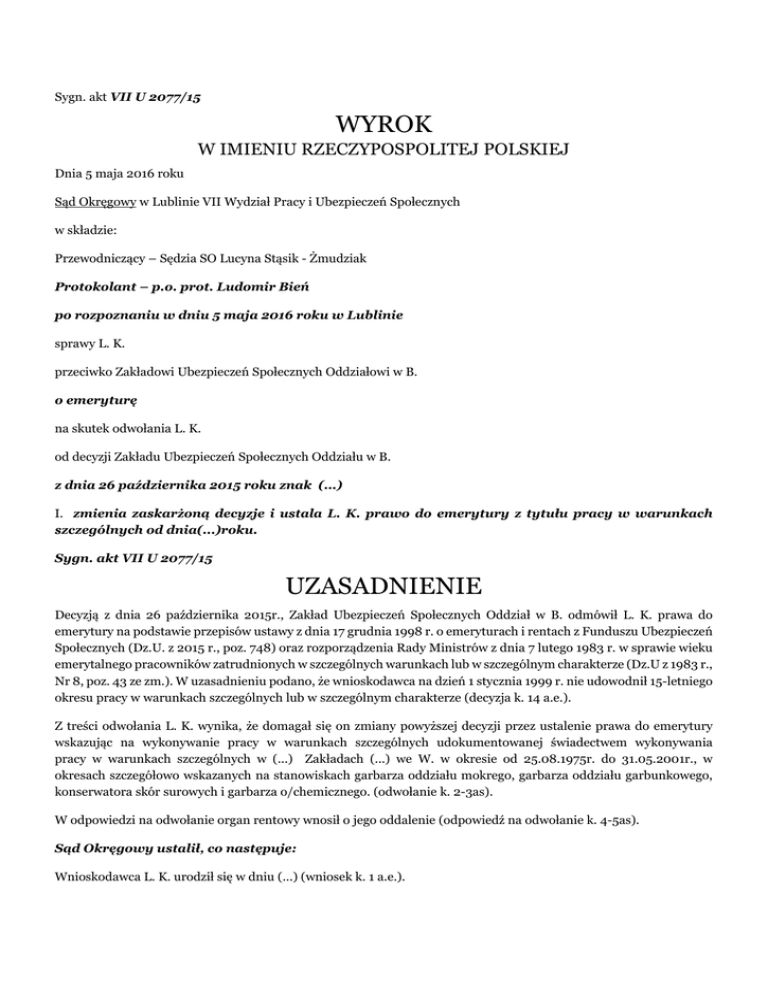 Sygn. akt VII U 2077/15 WYROK W IMIENIU RZECZYPOSPOLITEJ POLSKIEJ Dnia 5 maja 2016 roku Sąd Okręgowy w Lublinie VII Wydział Pracy i Ubezpieczeń Społecznych w składzie: Przewodniczący – Sędzia SO Lucyna Stąsik - Żmudziak Protokolant – p.o. prot. Ludomir Bień po rozpoznaniu w dniu 5 maja 2016 roku w Lublinie sprawy L. K. przeciwko Zakładowi Ubezpieczeń Społecznych Oddziałowi w B. o emeryturę na skutek odwołania L. K. od decyzji Zakładu Ubezpieczeń Społecznych Oddziału w B. z dnia 26 października 2015 roku znak (...) I. zmienia zaskarżoną decyzje i ustala L. K. prawo do emerytury z tytułu pracy w warunkach szczególnych od dnia(...)roku. Sygn. akt VII U 2077/15 UZASADNIENIE Decyzją z dnia 26 października 2015r., Zakład Ubezpieczeń Społecznych Oddział w B. odmówił L. K. prawa do emerytury na podstawie przepisów ustawy z dnia 17 grudnia 1998 r. o emeryturach i rentach z Funduszu Ubezpieczeń Społecznych (Dz.U. z 2015 r., poz. 748) oraz rozporządzenia Rady Ministrów z dnia 7 lutego 1983 r. w sprawie wieku emerytalnego pracowników zatrudnionych w szczególnych warunkach lub w szczególnym charakterze (Dz.U z 1983 r., Nr 8, poz. 43 ze zm.). W uzasadnieniu podano, że wnioskodawca na dzień 1 stycznia 1999 r. nie udowodnił 15-letniego okresu pracy w warunkach szczególnych lub w szczególnym charakterze (decyzja k. 14 a.e.). Z treści odwołania L. K. wynika, że domagał się on zmiany powyższej decyzji przez ustalenie prawa do emerytury wskazując na wykonywanie pracy w warunkach szczególnych udokumentowanej świadectwem wykonywania pracy w warunkach szczególnych w (...) Zakładach (...) we W. w okresie od 25.08.1975r. do 31.05.2001r., w okresach szczegółowo wskazanych na stanowiskach garbarza oddziału mokrego, garbarza oddziału garbunkowego, konserwatora skór surowych i garbarza o/chemicznego. (odwołanie k. 2-3as). W odpowiedzi na odwołanie organ rentowy wnosił o jego oddalenie (odpowiedź na odwołanie k. 4-5as). Sąd Okręgowy ustalił, co następuje: Wnioskodawca L. K. urodził się w dniu (...) (wniosek k. 1 a.e.). W dniu (...) r. L. K. złożył wniosek o emeryturę, w treści którego zawarł oświadczenia o tym, że nie jest członkiem otwartego funduszu emerytalnego, oraz że nie pozostaje w stosunku pracy. Wnioskodawca nie był uprawniony do renty z tytułu niezdolności do pracy ani żadnych innych świadczeń. Otrzymuje zasiłek opiekuńczy związany z opieką nad niepełnosprawnym dzieckiem. W oparciu o zgromadzone w aktach dokumenty organ rentowy ustalił wnioskodawcy na dzień 1 stycznia 1999 r. łączny staż podlegania ubezpieczeniom w wymiarze 25 lat, 7 miesięcy i 5 dni okresów składkowych i okresów nieskładkowych. Żadnego z okresów zatrudnienia wnioskodawcy ZUS nie uwzględnił przy ustalaniu jego stażu pracy w warunkach szczególnych. W dniu 26 października 2015 r. organ rentowy skarżoną decyzją odmówił wnioskodawcy prawa do świadczenia z uwagi na nieudowodnienie 15 lat pracy w szczególnych warunkach (decyzja k. 14 a.e.). Zakwestionowane zostały przy tym następujące okresy: od 25 sierpnia 1975 r. do 27 października 1977 r., i od 02 listopada 1979 r. do 15 czerwca 1989 r., od 12 grudnia 1989r. do 28 lutego 1990r. i od 01 sierpnia 1996r. do 31 grudnia 1998r. dokumentowane przedłożonym do wniosku o emeryturę świadectwem wykonywania pracy w warunkach szczególnych z dnia 31 maja 2001 r., wystawionym (...) Zakłady (...) (k. 12 a.e. t.I). W świadectwie tym wskazano, że w wyżej wymienionych okresach L. K. wykonywał pracę w szczególnych warunkach na stanowisku garbarza o/mokrego, garbarza oddziału garbunkowego, konserwatora skór surowych i garbarza o/chemicznego wymienionych w wykazie A, dział VII, poz. 11, pkt 1, 2 i poz. 10 pkt 1 załącznika nr 1 do zarządzenia nr 7 Ministra Przemysłu Chemicznego i Lekkiego z dnia 7 lipca 1987 r. Organ rentowy zarzucił, iż w powyższym świadectwie pracy nie określono rodzaju prac zgodnie z rozporządzeniem Rady Ministrów z dnia 7 lutego 1983 r., nie wskazano wykazu, działu i pozycji załącznika do tego rozporządzenia oraz zakład nie wskazał w jakich okresach wnioskodawca wykonywał pracę na określonych stanowiskach. W tym stanie rzeczy wydana została zaskarżona decyzja. W dniu 25 sierpnia 1975r. L. K. zawarł z (...) Zakładami (...) we W.. (wówczas (...) Zakładami (...) we W.) umowę o pracę na 14-dniowy okres próbny, a następnie na okres wstępny a następnie czas nieokreślony. W wymiarze skróconym do 41 godzin tygodniowo w ramach pełnego etatu powierzono mu obowiązki garbarza początkowo przy wyżymaniu maszynowym po garbowaniu w oddziale I, chemicznym, mokrym. Na oddziale tym surową skórę poddawano różnym zabiegom, tj. zarówno procesom chemicznym, jak i operacjom mechanicznym. Pozbawiano ją włosa, tkanki mięśniowej i tłuszczowej, moczono je w różnych środkach chemicznych, roztworach soli chromu, siarczanach kwasu solnego, fosforowego, mrówkowego, amoniaku, dokonywano dwojenia skór i ich strugania. Wnioskodawca pracował przy wyżymaniu skór mokrych. Razem z drugim pracownikiem rozkładał na dwie maszyny – wyżymarki mokre skóry, wymoczone w środkach chemicznych, służących do ich garbowania, przede wszystkim w chromalu, kwasie siarkowym, wapnie. Skory rzucano na wał wyżymaczki i po kolei były wykonywane kolejne procesy garbowania skóry, dwóch pracowników nadawało na wał skóry, dwóch po przeciwnej stronie maszyny je odbierało. Potem skóry szły na dwojenie, struganie, przecinanie a następnie do bębnów gdzie się je tłuściło, dodawało różne kwasy a potem po wysypaniu układało i następnie kładło na inne jeszcze wyżymaczki. Skóry szły już na inny oddział II - do garbowania. Praca była wykonywana po 7 godzin na 3 zmiany, w pełnym wymiarze czasu pracy, skróconym ze względu na warunki szkodliwe. Praca była ciężka fizycznie, ręcznie kładziono skóry na wyżymarkę, pracowano w