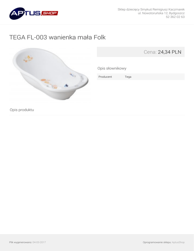 Sklep dziecięcy Smykuś Remigiusz Kaczmarek ul. Nowotoruńska 12, Bydgoszcz 52 362 02 63 TEGA FL-003 wanienka mała Folk Cena: 24,34 PLN Opis słownikowy Producent Tega Opis produktu Plik wygenerowano: 04-03-2017 Powered by TCPDF (www.tcpdf.org) Oprogramowanie sklepu: AptusShop