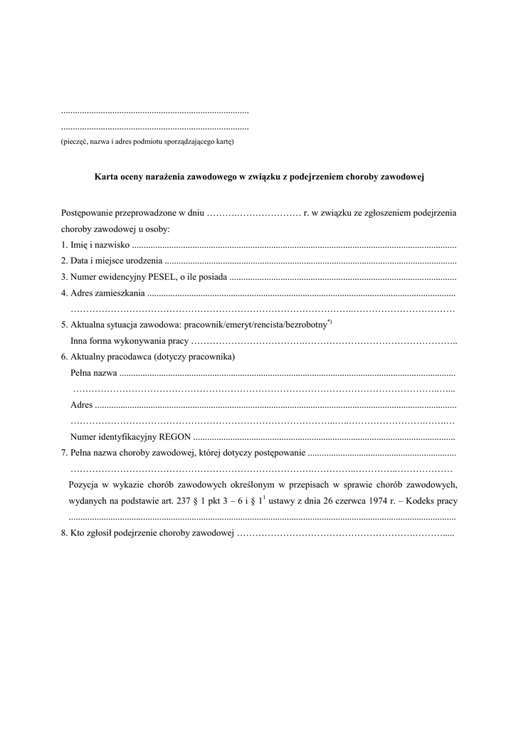Załącznik nr 4 WZÓR ................................................................................. ................................................................................. (pieczęć, nazwa i adres podmiotu sporządzającego kartę) Karta oceny narażenia zawodowego w związku z podejrzeniem choroby zawodowej Postępowanie przeprowadzone w dniu ……….………………… r. w związku ze zgłoszeniem podejrzenia choroby zawodowej u osoby: 1. Imię i nazwisko ............................................................................................................................................ 2. Data i miejsce urodzenia .............................................................................................................................. 3. Numer ewidencyjny PESEL, o ile posiada .................................................................................................. 4. Adres zamieszkania ..................................................................................................................................... ………………………………………………………………………………..…………………………… 5. Aktualna sytuacja zawodowa: pracownik/emeryt/rencista/bezrobotny*) Inna forma wykonywania pracy ……………………………….………………………………………….. 6. Aktualny pracodawca (dotyczy pracownika) Pełna nazwa ................................................................................................................................................. ………………………………………………………………………………………………………..…... Adres ............................................................................................................................................................ …………………………………………………………………………..…..…………………….…….… Numer identyfikacyjny REGON ................................................................................................................. 7. Pełna nazwa choroby zawodowej, której dotyczy postępowanie ................................................................ …………………………………………………………………….…………..…………..……………… Pozycja w wykazie chorób zawodowych określonym w przepisach w sprawie chorób zawodowych, wydanych na podstawie art. 237 § 1 pkt 3 – 6 i § 11 ustawy z dnia 26 czerwca 1974 r. – Kodeks pracy ....................................................................................................................................................................... 8. Kto zgłosił podejrzenie choroby zawodowej ………………………………………………….………..... 9. Wywiad zawodowy**) Okresy Stanowisko zatrudnienia pracy od – do Pracodawca Charakterystyka Dane o narażeniu narażenia (czynniki (wyniki pomiarów) szkodliwe/uciążliwe) 10. Miejsce zatrudnienia lub wykonywania pracy, z którym wiąże się podejrzenie choroby zawodowej będące powodem zgłoszenia podejrzenia choroby zawodowej Pełna nazwa ………………………………………...…..……………….................................................. ………………………………………………..……………………………………….…………………. Adres …………………………………………………………………………………………….…......... ……………………………………………………………..………………………………………..…… Numer identyfikacyjny REGON ............................................................................................................... 11. Stanowisko pracy, wydział, oddział ………………….............................................................................. ……………………………………………………………………………………………………….….. 12. Charakterystyka wykonywanej pracy (rodzaj wykonywanych czynności) …………………………… ……………………………........................................................................................................................ .................................................................................................................................................................... 13. Czynniki, które wskazuje się jako przyczynę choroby zawodowej Nazwa czynnika (czynników) ……………….……………................................................................. Wyniki badań oraz pomiarów stężeń i natężeń czynników szkodliwych dla zdrowia występujących w środowisku pracy w okresie zatrudnienia pracownika (z datą pomiarów lub najczęściej stwierdzane; jeżeli podejrzenie dotyczy choroby wywołanej czynnikami biologicznymi, uczulającymi lub rakotwórczymi, należy podać dane, o których mowa w przepisach w sprawie chorób zawodowych, wydanych na podstawie art. 237 § 1 pkt 3 – 6 i § 11 ustawy z dnia 26 czerwca 1974 r. – Kodeks pracy) ................................................................................................................................................................... ................................................................................................................................................................... 14. Sposób wykonywania pracy ***) a) rodzaj, zakres i stopień obciążenia czynnościami, które mogły powodować nadmierne obciążenie (uwzględnić odpowiednio: układ ruchu, obwodowy układ nerwowy (pnie nerwów), narząd głosu; podać w formie opisu) ………………………………………………………………………………… ……………………………………………