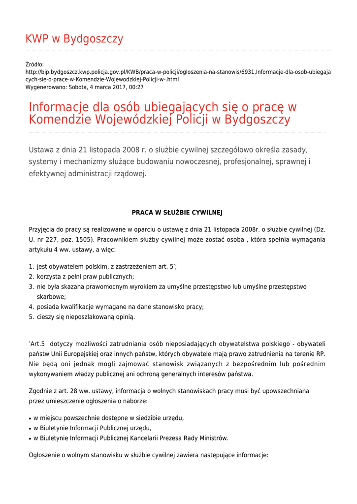 KWP w Bydgoszczy Źródło: http://bip.bydgoszcz.kwp.policja.gov.pl/KWB/praca-w-policji/ogloszenia-na-stanowis/6931,Informacje-dla-osob-ubiegaja cych-sie-o-prace-w-Komendzie-Wojewodzkiej-Policji-w-.html Wygenerowano: Sobota, 4 marca 2017, 00:27 Informacje dla osób ubiegających się o pracę w Komendzie Wojewódzkiej Policji w Bydgoszczy Ustawa z dnia 21 listopada 2008 r. o służbie cywilnej szczegółowo określa zasady, systemy i mechanizmy służące budowaniu nowoczesnej, profesjonalnej, sprawnej i efektywnej administracji rządowej. PRACA W SŁUŻBIE CYWILNEJ Przyjęcia do pracy są realizowane w oparciu o ustawę z dnia 21 listopada 2008r. o służbie cywilnej (Dz. U. nr 227, poz. 1505). Pracownikiem służby cywilnej może zostać osoba , która spełnia wymagania artykułu 4 ww. ustawy, a więc: 1. jest obywatelem polskim, z zastrzeżeniem art. 5*; 2. korzysta z pełni praw publicznych; 3. nie była skazana prawomocnym wyrokiem za umyślne przestępstwo lub umyślne przestępstwo skarbowe; 4. posiada kwalifikacje wymagane na dane stanowisko pracy; 5. cieszy się nieposzlakowaną opinią. * Art.5 dotyczy możliwości zatrudniania osób nieposiadających obywatelstwa polskiego - obywateli państw Unii Europejskiej oraz innych państw, których obywatele mają prawo zatrudnienia na terenie RP. Nie będą oni jednak mogli zajmować stanowisk związanych z bezpośrednim lub pośrednim wykonywaniem władzy publicznej ani ochroną generalnych interesów państwa. Zgodnie z art. 28 ww. ustawy, informacja o wolnych stanowiskach pracy musi być upowszechniana przez umieszczenie ogłoszenia o naborze: ● w miejscu powszechnie dostępne w siedzibie urzędu, ● w Biuletynie Informacji Publicznej urzędu, ● w Biuletynie Informacji Publicznej Kancelarii Prezesa Rady Ministrów. Ogłoszenie o wolnym stanowisku w służbie cywilnej zawiera następujące informacje: ● nazwę i adres urzędu; ● określenie stanowiska pracy; ● wymagania związane ze stanowiskiem pracy zgodnie z opisem danego stanowiska, ze wskazaniem, które z nich są niezbędne, a które dodatkowe; ● zakres zadań wykonywanych na stanowisku pracy; ● wskazanie wymaganych dokumentów; ● termin i miejsce składania dokumentów; ● o stanowiska w służbie cywilnej mogą ubiegać się osoby posiadające orzeczenie o niepełnosprawności. Zatrudnienie: ● Z osobą po raz pierwszy podejmującą pracę w służbie cywilnej zawierana będzie umowa o pracę na czas określony 12 miesięcy, z możliwością rozwiązania za dwutygodniowym wypowiedzeniem (od zasady tej istnieją wszakże określone w ustawie odstępstwa). ● Osoby podejmujące po raz pierwszy pracę w służbie cywilnej będą kierowane do odbycia służby przygotowawczej, która będzie trwać nie dłużej niż 4 miesiące i kończyć się egzaminem. W pewnych przypadkach dyrektor generalny będzie mógł zwolnić pracownika z obowiązku odbycia służby przygotowawczej, ale nie oznacza to zwolnienia z egzaminu kończącego tę służbę. ● Osoba zatrudniona po raz pierwszy w służbie cywilnej na podstawie umowy o pracę na czas określony podlegać będzie tzw. pierwszej ocenie w służbie cywilnej. Ocena ta dokonywana będzie nie wcześniej niż po upływie 8 miesięcy od nawiązania stosunku pracy i nie później niż miesiąc przed upływem okresu, na który zawarta została umowa. Dokonując pierwszej oceny pracownika służby cywilnej, uwzględnia się jego postawę, zaangażowanie, postępy w pracy, relacje ze współpracownikami i terminowość wykonywania zadań, a także wynik egzaminu ze służby przygotowawczej oraz sporządzone przez ocenianego pracownika sprawozdanie dotyczące zadań realizowanych przez niego w trakcie przepracowanego okresu. W przypadku przyznania oceny pozytywnej kierownik komórki organizacyjnej, w której zatrudniony jest oceniany pracownik, wnioskuje do dyrektora generalnego urzędu o zawarcie umowy o pracę na czas nieokreślony, zaś w przypadku oceny negatywnej - o niezawieranie takiej umowy albo o rozwiązanie umowy o pracę na czas określony. Metryczka Data publikacji 01.07.2009 Data modyfikacji 11.03.2013 Rejestr zmian Podmiot udostępniający informację: Biuletyn Informacji Publicznej Osoba wytwarzająca/odpowiadająca za informację: Bogumiła Bzdawska-Wróblewska, Wydział Kadr i Szkolenia KWP w Bydgoszczy Osoba udostępniająca informację: Piotr Pawlaczyk Wydział Komunikacji Społecznej KWP w Bydgoszczy Osoba modyfikująca informację: Piotr Pawlaczyk