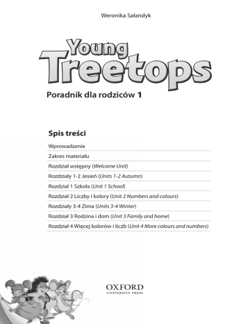 Weronika Sałandyk Poradnik dla rodziców1 Spis treści Wprowadzenie Zakres materiału Rozdział wstępny (Welcome Unit) Rozdziały 1-2 Jesień (Units 1-2 Autumn) Rozdział 1 Szkoła (Unit 1 School) Rozdział 2 Liczby i kolory (Unit 2 Numbers and colours) Rozdziały 3-4 Zima (Units 3-4 Winter) Rozdział 3 Rodzina i dom (Unit 3 Family and home) Rozdział 4 Więcej kolorów i liczb (Unit 4 More colours and numbers) 1 2 DRODZY RODZICE /OPIEKUNOWIE! W tym roku szkolnym Wasze dziecko rozpoczyna naukę języka angielskiego z podręcznikiem Young Treetops 1. Mamy nadzieję, że książka będzie dla dziecka źródłem radości, zachęci je do nauki i zabawy w języku angielskim oraz sprawi, że z przyjemnością będzie uczestniczyło w kolejnych lekcjach. Bohaterami kursu Young Treetops 1 są elfy Bud i Holly, ich rodzina i zaprzyjaźnione zwierzęta – Wiewiórka, Myszka, Jeż oraz Wydra. Dzieci szybko pokochają bohaterów i przeżyją wraz z nimi wiele przygód w lesie Treetops; zobaczą, jak wygląda ich dom, leśna szkoła i co robią bohaterowie jesienią, zimą, wiosną oraz latem. Praca na lekcji Techniki i metody pracy z podręcznikiem Young Treetops 1 zapewnią dzieciom wszechstronny rozwój i aktywny udział w nauce. Każda lekcja to forma zabawy z językiem z wykorzystaniem ruchu, muzyki oraz pomocy wizualnych takich jak karty obrazkowe, plakaty i rysunki. W czasie lekcji dzieci będą poznawać nowe słownictwo oraz wyrażenia w języku angielskim, będą uczyły się śpiewać piosenki, recytować wierszyki po angielsku, będą słuchały historyjek, odgrywały scenki oraz wykonywały prace plastyczne. Ponadto będą bawiły się, grały w gry językowe i rozwiązywały ćwiczenia. Wszystkie te formy zajęć lekcyjnych pozwolą dzieciom rozwinąć umiejętność rozumienia ze słuchu oraz mówienia, najczęściej poprzez powtarzanie poznanych słów i zwrotów. Stopniowo dzieci będą uczyły się czytać poszczególne wyrazy i proste zdania, a także rozpoczną naukę pisania. Kontakt z nauczycielem Wasza pomoc jest niezwykle ważna dla rozwoju i edukacji dziecka, jednak przed rozpoczęciem wspólnej pracy w domu warto porozmawiać z nauczycielem uczącym dziecko w szkole. Z pewnością wyjaśni Wam, jak wygląda praca na lekcji, jakie są jego oczekiwania względem dzieci oraz doradzi, jak najefektywniej pracować z dzieckiem w domu w celu utrwalenia poznanego na lekcjach materiału. Dlaczego pomagać? Początek nauki w szkole to przełomowy moment w życiu każdego dziecka. Bez względu na to, czy dziecko miało kontakt z językiem angielskim w przedszkolu czy też nie, nauka w szkole jest nowym doświadczeniem. Warto podjąć starania, aby stała się ona dla dziecka przyjemnością, zabawą i radością. Ciekawy podręcznik i zaangażowany nauczyciel to ponad połowa sukcesu. Prosimy jednak pamiętać, że jako rodzice jesteście dla dziecka największym autorytetem. Dlatego zachęcamy do zaangażowania się w naukę dziecka w domu bez względu na stopień znajomości języka. Zainteresowanie rodziców, pozytywne nastawienie i wsparcie stanowią dla dziecka bodziec do pracy. Z dumą będzie chwaliło się tym, co robiło na lekcji, w jakie gry zagrało lub które słówka i piosenki zapamiętało. Nie możemy zapominać, że postępy w nauce języka osiąga się stopniowo, małymi krokami, a o sukcesie przesądza często motywacja, dobre nastawienie i przyjemność z poznawania języka. Starajcie się zatem razem z dzieckiem czerpać radość z nauki! Young Treetops 1 – Poradnik dla rodziców Oxford University Press ©2015 PHOTOCOPIABLE Jak może wyglądać praca w domu? Przede wszystkim prosimy o regularne przeglądanie wraz z dzieckiem podręcznika i zeszytu ćwiczeń. Warto regularnie pytać dziecko, co pamięta z ostatnich lekcji, co wydarzyło się w historyjce, jak nazywają się przedmioty lub osoby przedstawione na rysunkach. Można również poprosić je, aby opowiedziało, na czym polegało wybrane ćwiczenie. Tego typu rozmowy mogą być początkiem zabawy w szkołę: dziecko wcieli się w rolę nauczyciela, a rodzice będą uczniami, wykonującymi polecenia lub rozwiązującymi zadane ćwiczenia. Ponadto, oglądając podręcznik, warto poprosić dziecko o zaśpiewanie piosenki lub wyrecytowanie wierszyka. Można również je zachęcić, aby nauczyło kogoś z domowników poznanej piosenki czy wierszyka wraz z demonstrowaniem gestów. Wszystkie nagrania do podręcznika znajdują się na dołączonej do niego płycie MP3. Zachęcamy też do regularnego odwiedzania strony internetowej kursu: www.oup.com/elt/youngtreetops. Znajdują się tam gry utrwalające słownictwo, piosenki wraz z tekstem, tapety z ilustracjami z kursu do pobrania oraz słowniczek obrazkowy, w którym zebrano podstawowe słownictwo ze wszystkich rozdziałów. Warto pobawić się w gry, skorzystać ze słowniczka obrazkowego, aby sprawdzić, czy dziecko pamięta słowa i wyrażenia wprowadzone w kolejnym rozdziale oraz żeby wspólnie zaśpiewać piosenkę lub powiedzieć wyliczankę. Możecie również poszukać w internecie innych gier przeznaczonych dla dzieci uczących się angielskiego jako języka obcego. Wiele z tych gier przypomina lubiane i popularne gry komputerowe, jednak dodatkowym wyzwaniem jest to, że grając w nie, dzieci muszą wykonywać polecenia i zadania z angielskiego. Z myślą o rodzicach wydawnictwo Oxford University Press stworzyło również ogólnodostępną stronę internetową zawierającą artykuły w języku polskim i instruktażowe filmiki video, zawierające sugestie, jak wspólnie bawić się po angielsku w domu. Zapraszamy na www.oup.com/elt/oxfordparents. Jak utrwalać słownictwo? Korzystając ze słowniczka obrazkowego ze strony internetowej lub z listy słówek znajdującej się na końcu podręcznika, możemy wspólnie z dzieckiem zrobić własne karty do gry. Przygotujmy pocięte kartki z bloku technicznego, najlepiej wielkości kart do gry, i poproś
